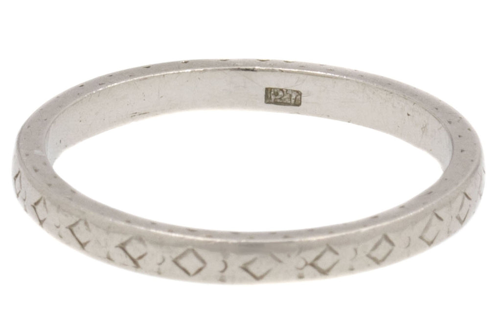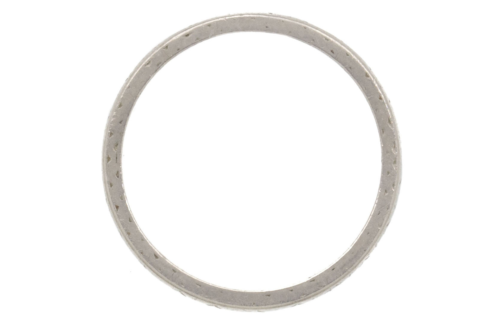 VERY GOOD. This divine Art Deco Platinum engraved band is in very good condition! Her inside band has some subtle wear, but nothing we wouldn't expect of a piece of her age! Crafted out of sturdy Platinum, you can rest assured that she will last for a lifetime to come.