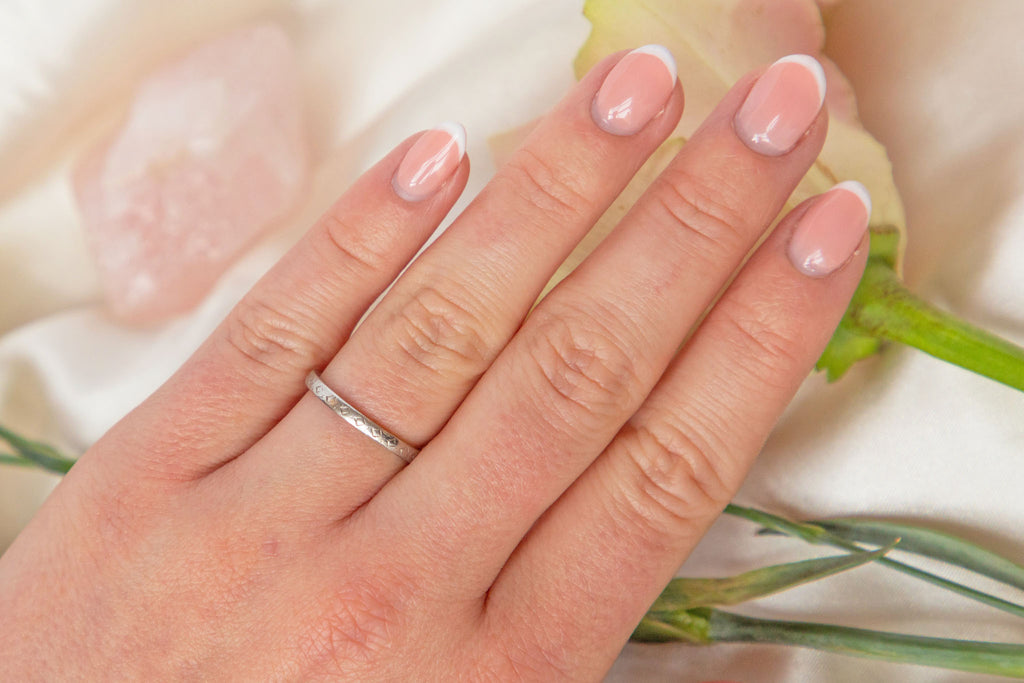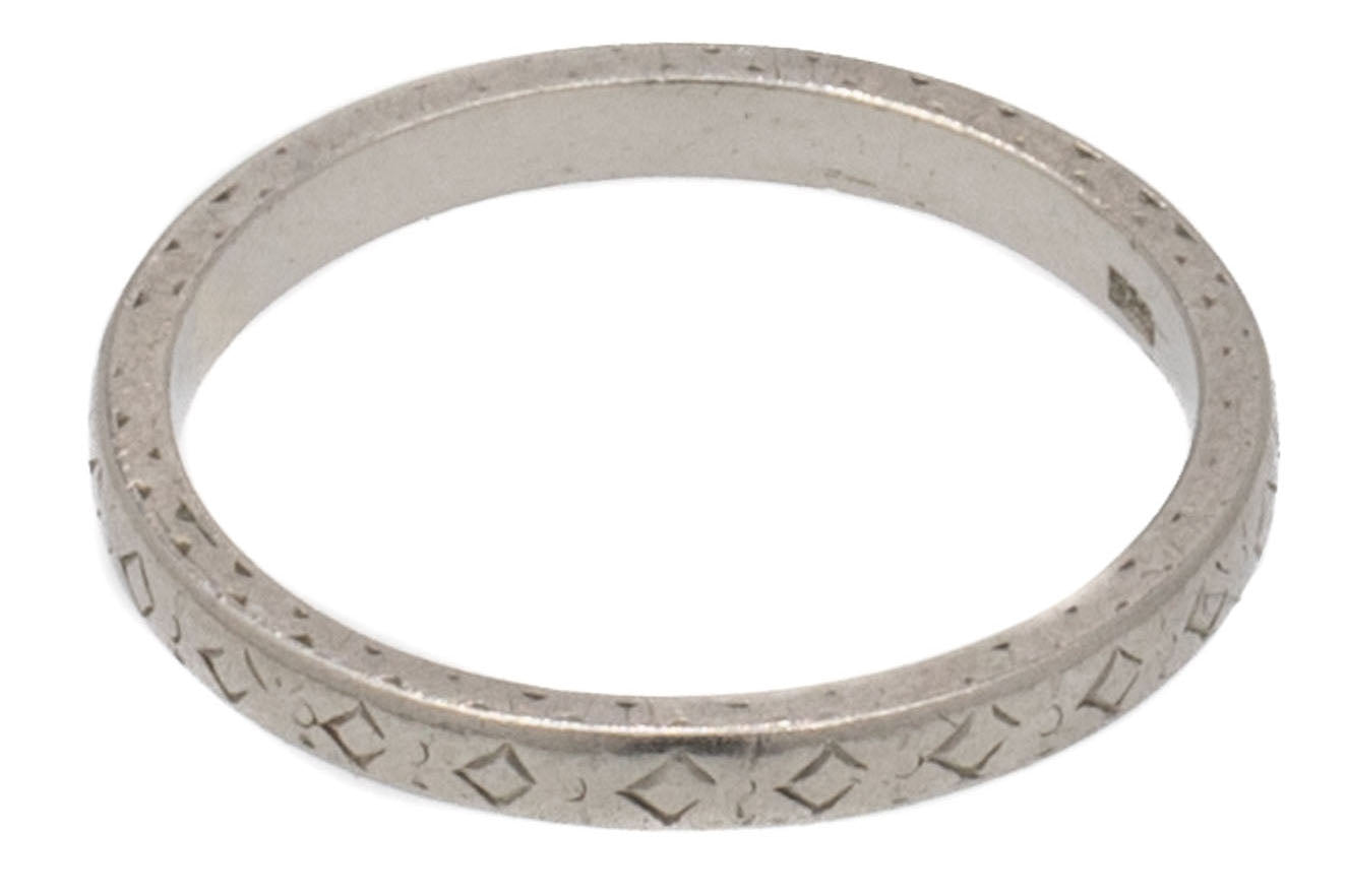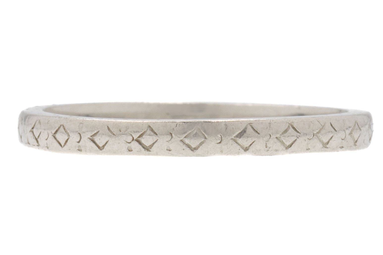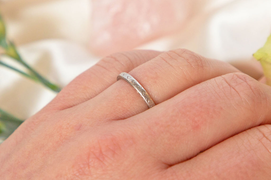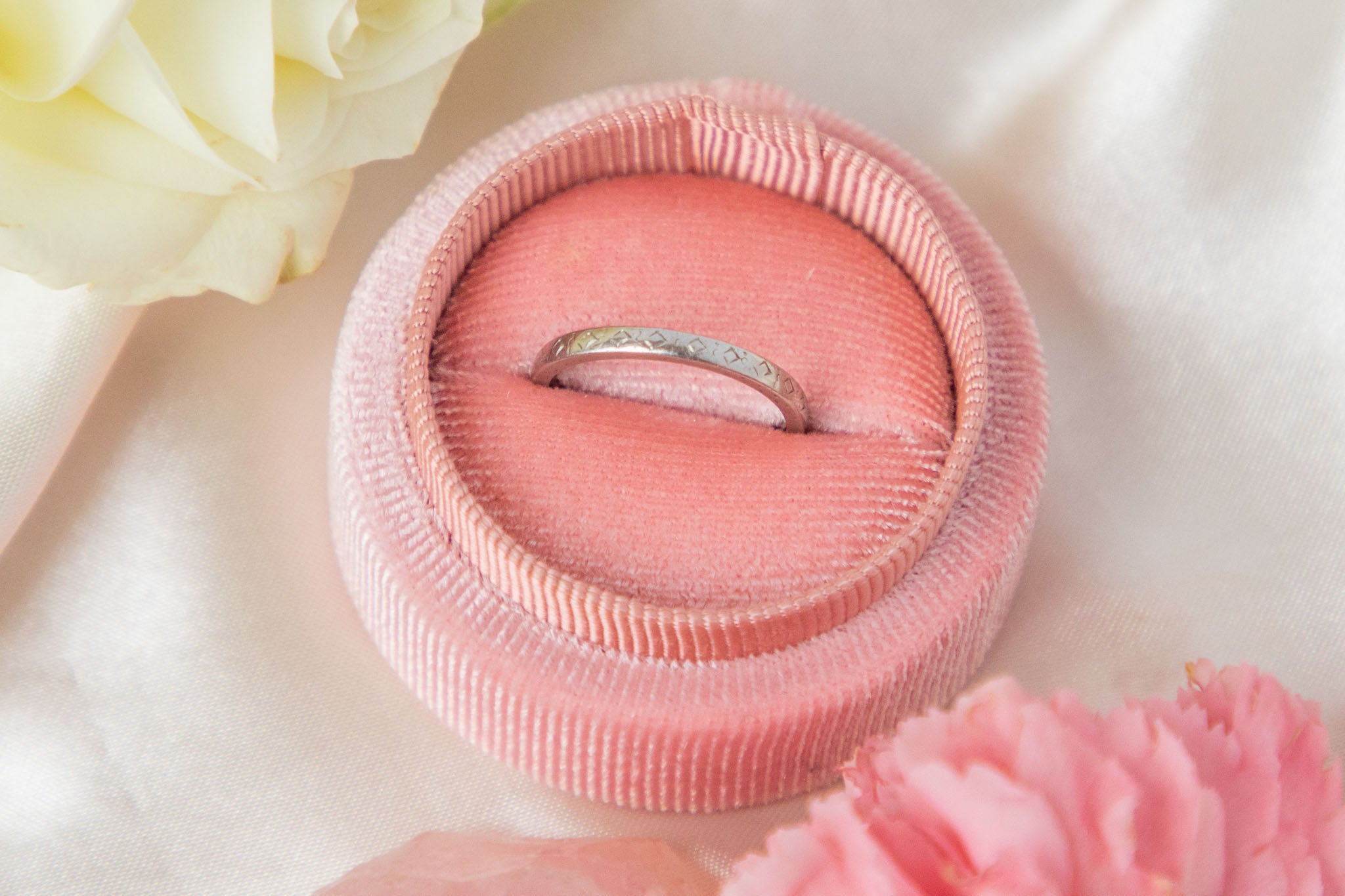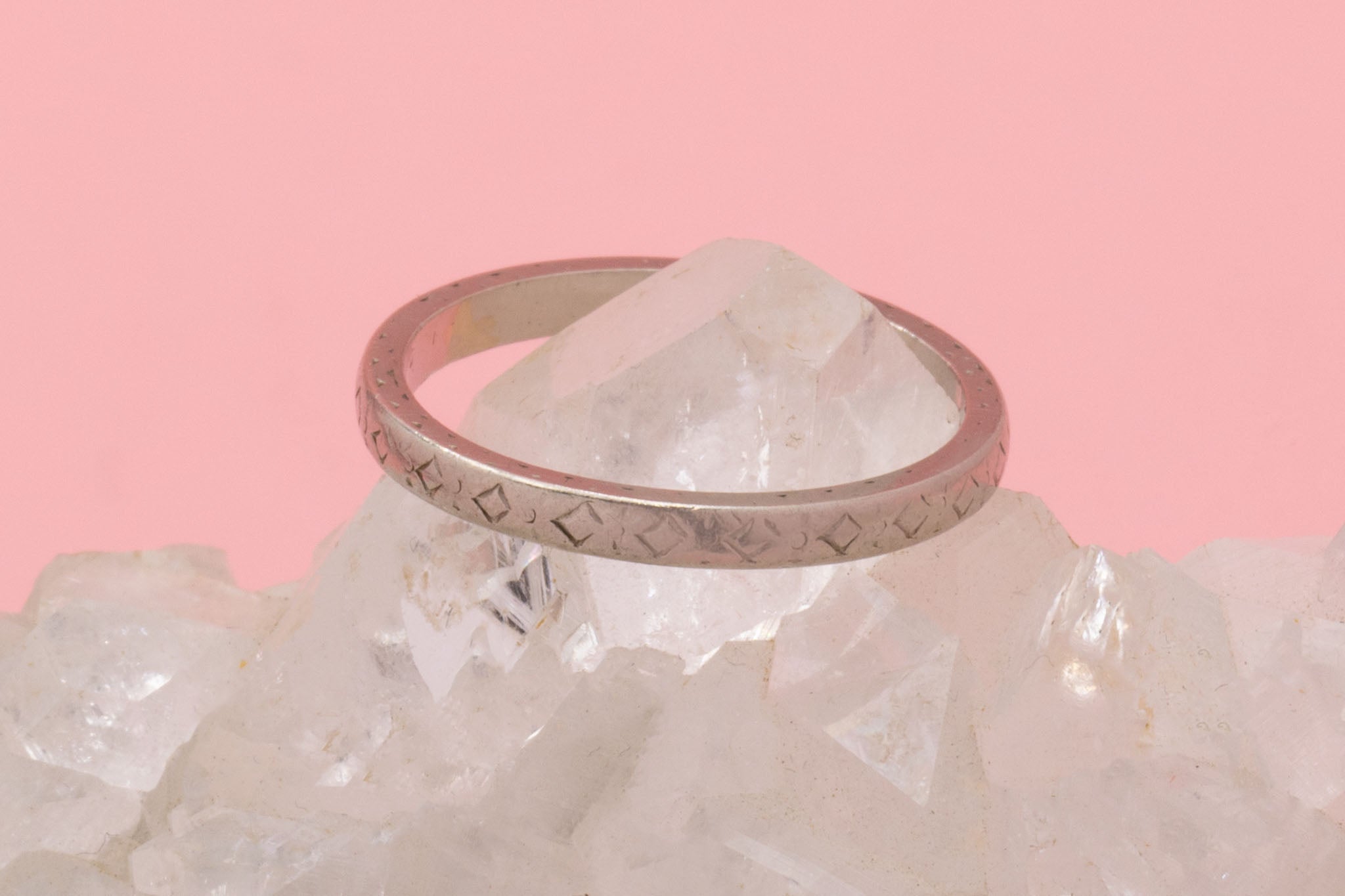 Her bright Platinum boasts delicate geometric Art Deco engravings. Slender in design, she is the epitome of elegance. Perfect for everyday wear, this antique Platinum ring would make an ideal choice for a unique wedding band.
