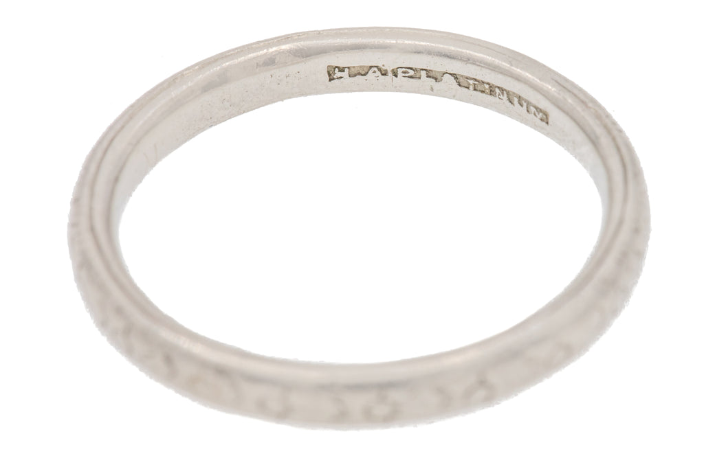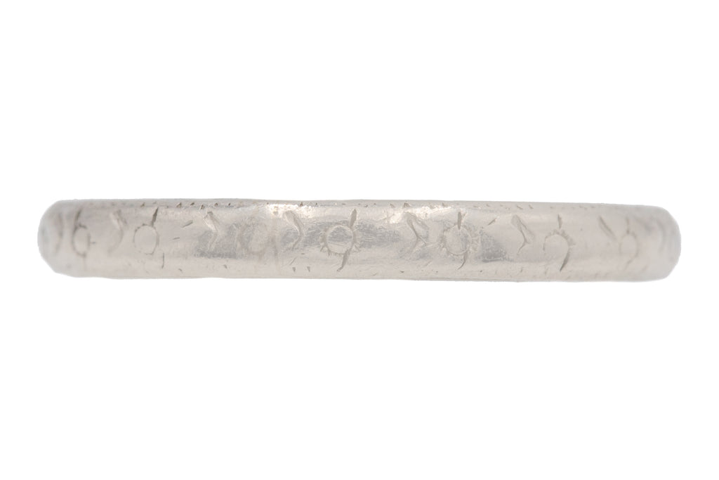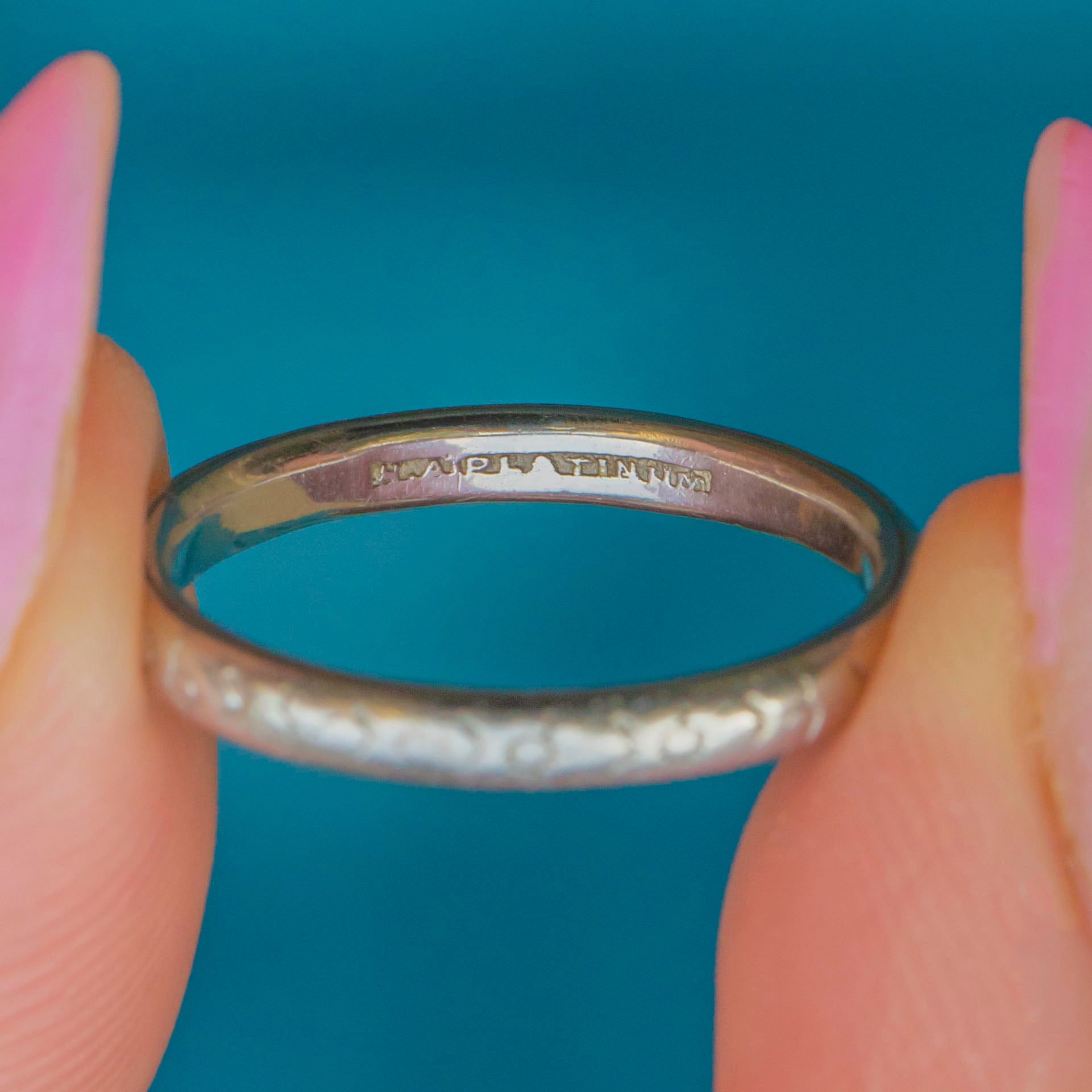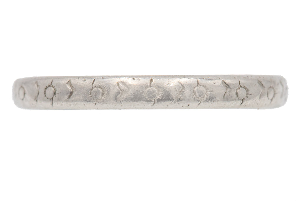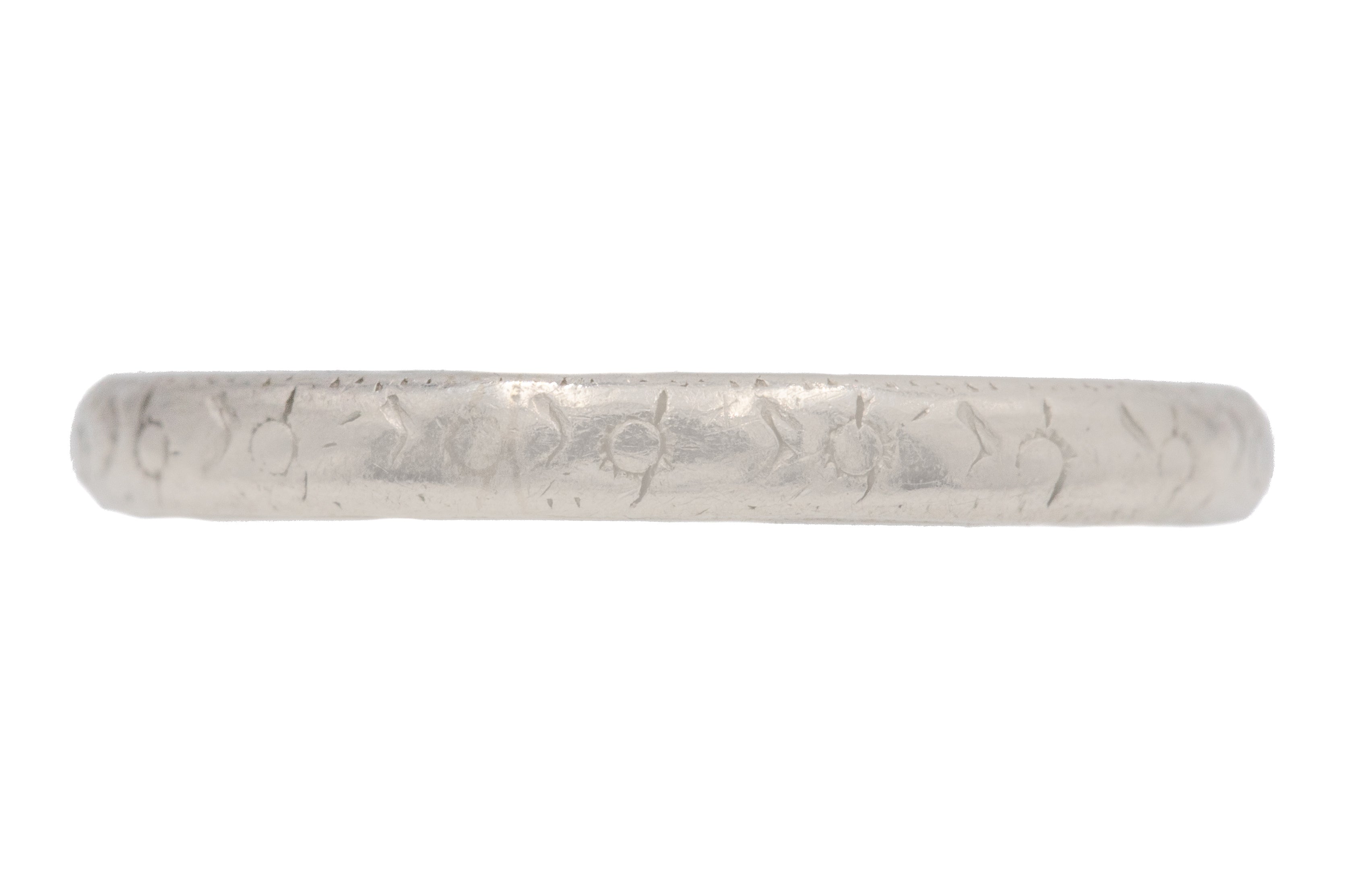 VERY GOOD. This splendid Art Deco Platinum engraved wedding band is offered in very good condition. Although her sweet engraved design has worn away slightly over time, it still retains a certain beauty! Her Platinum remains bright and glossy throughout, adding to the band's allure.