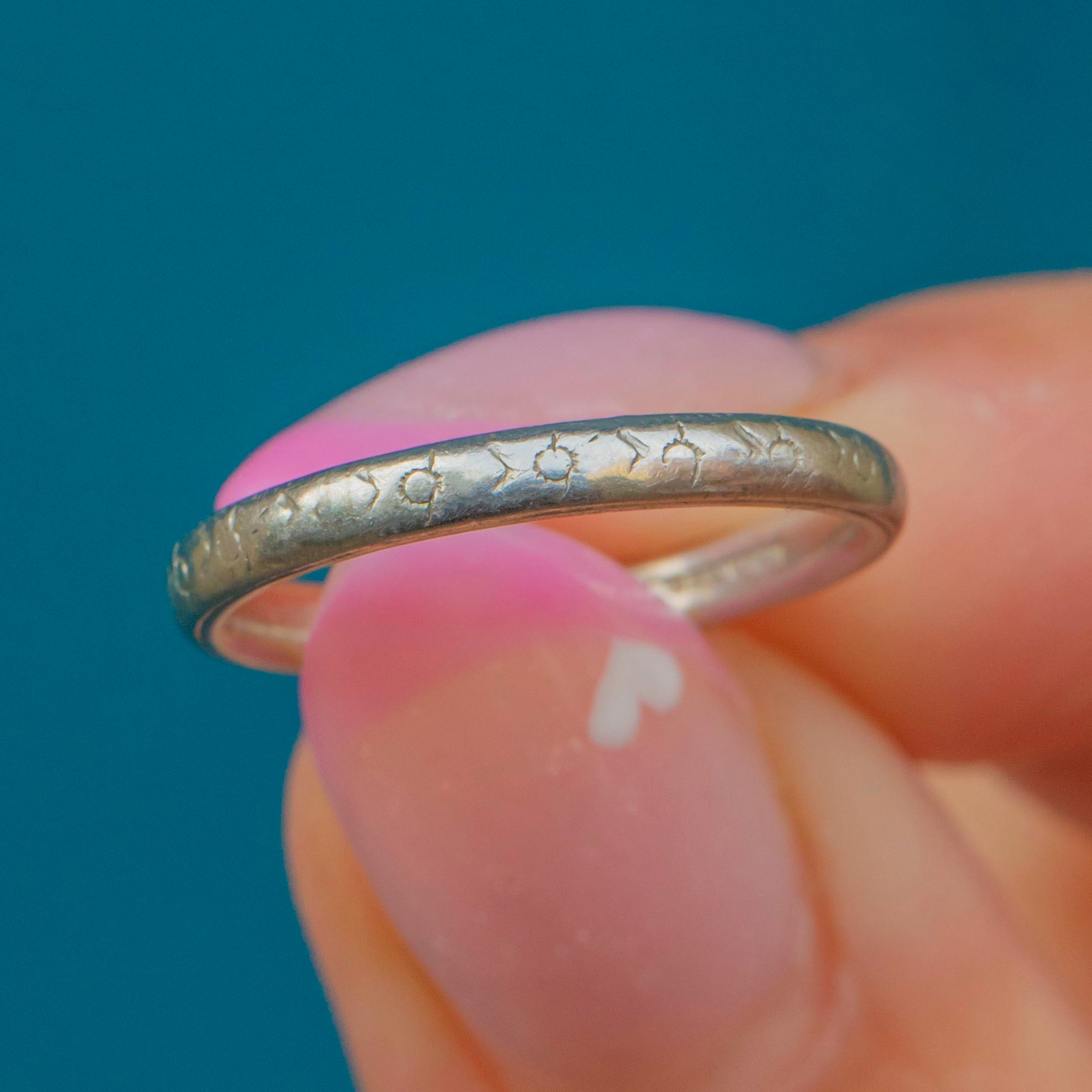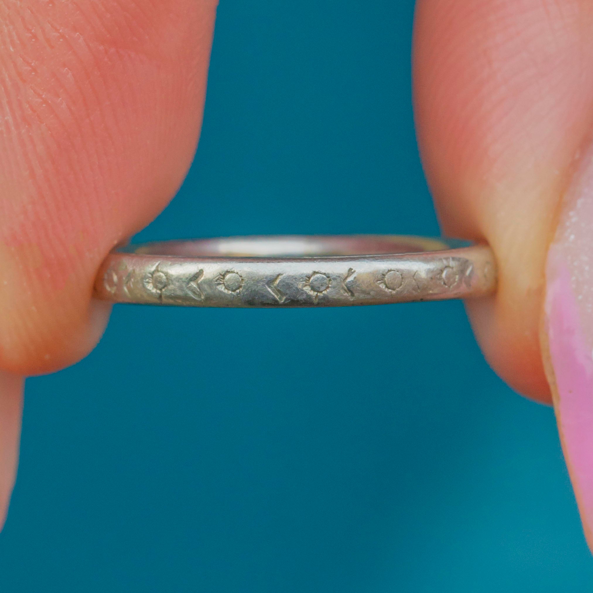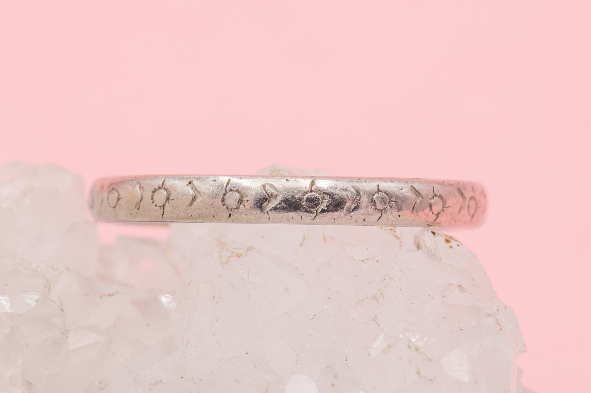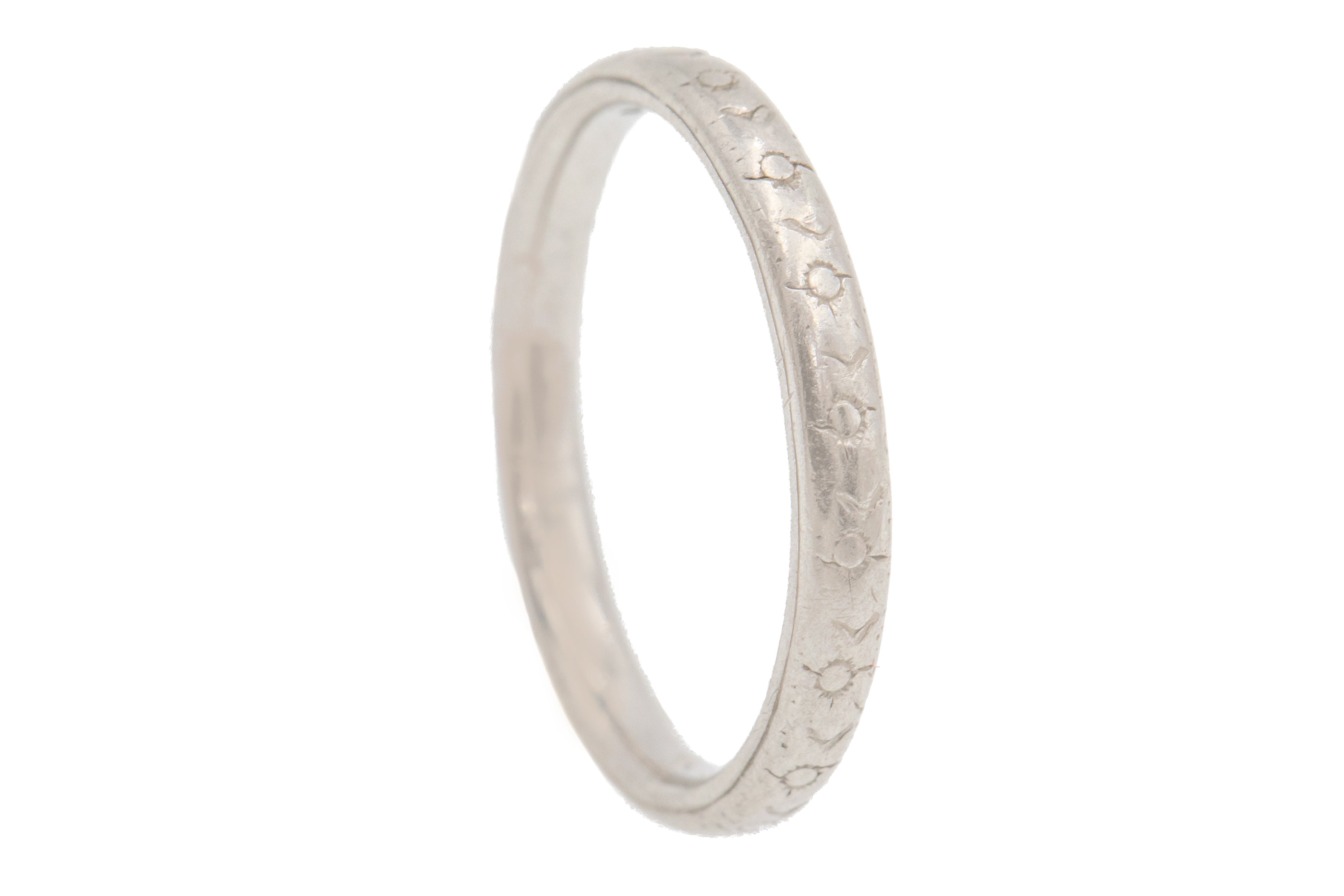 VERY GOOD. This splendid Art Deco Platinum engraved wedding band is offered in very good condition. Although her sweet engraved design has worn away slightly over time, it still retains a certain beauty! Her Platinum remains bright and glossy throughout, adding to the band's allure.