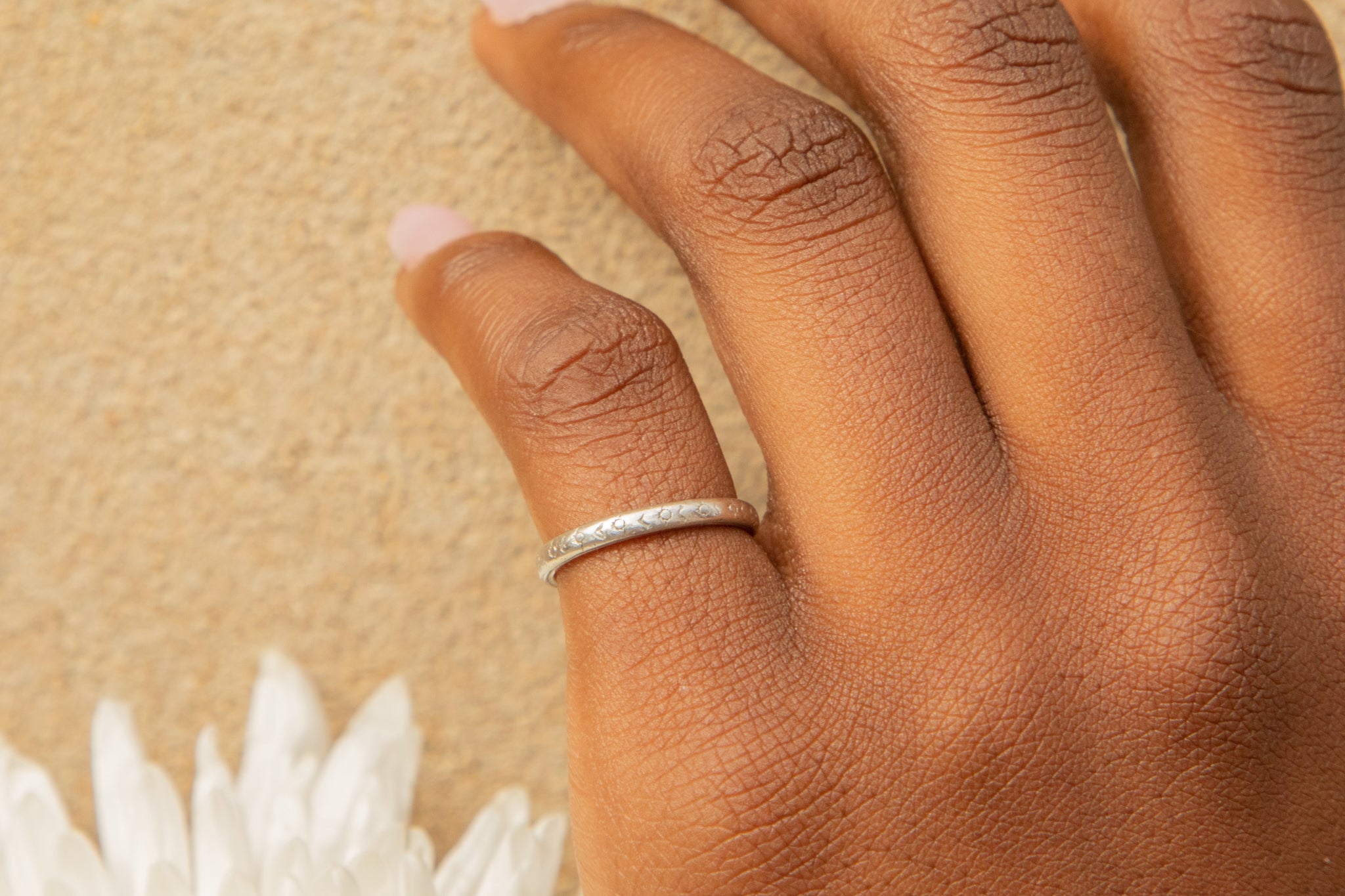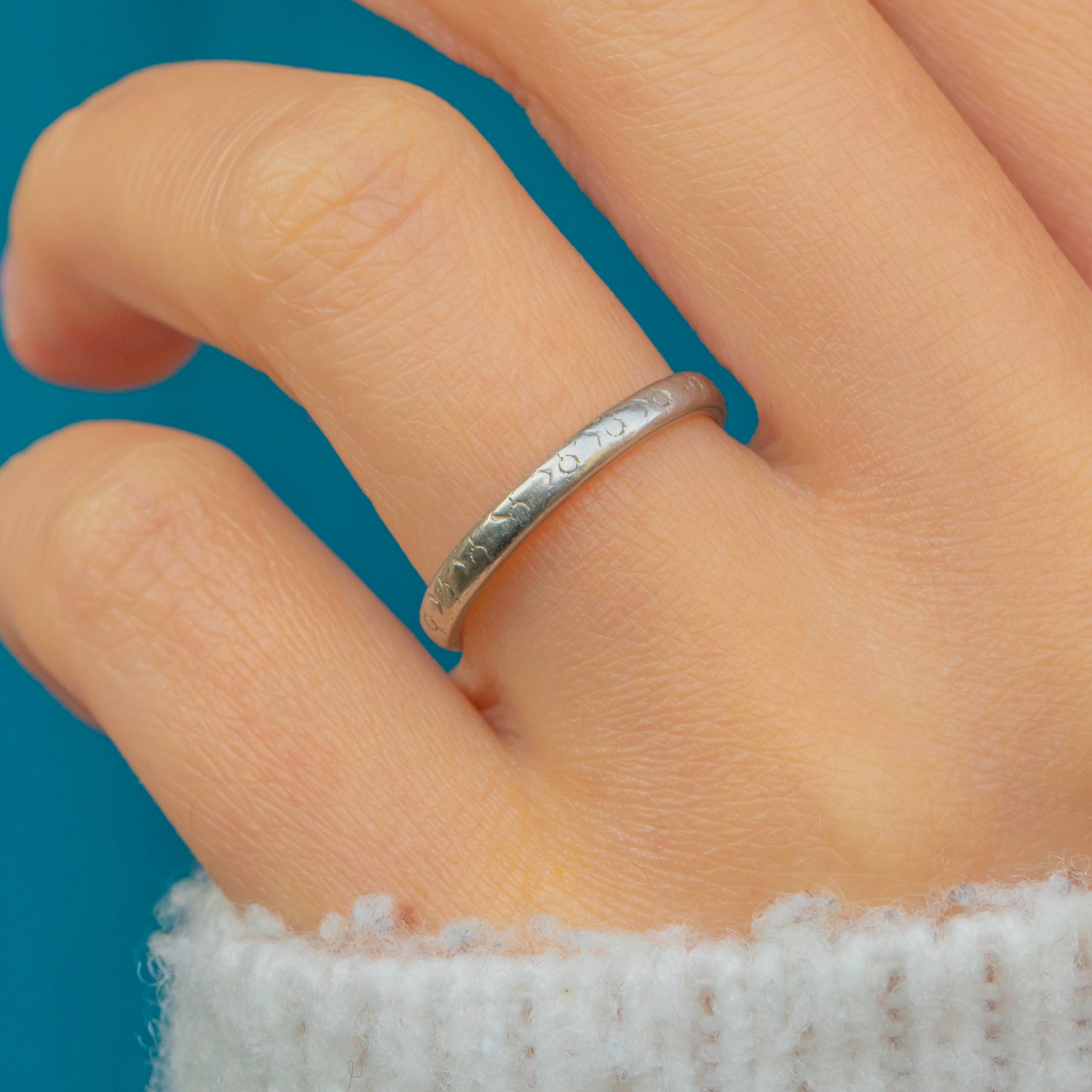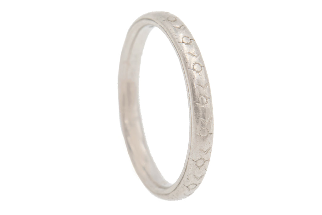 Certain to last for a lifetime to come, this beautiful 1920's wedding band has a slender width and features a subtle engraved design throughout. The perfect choice for a wedding band!