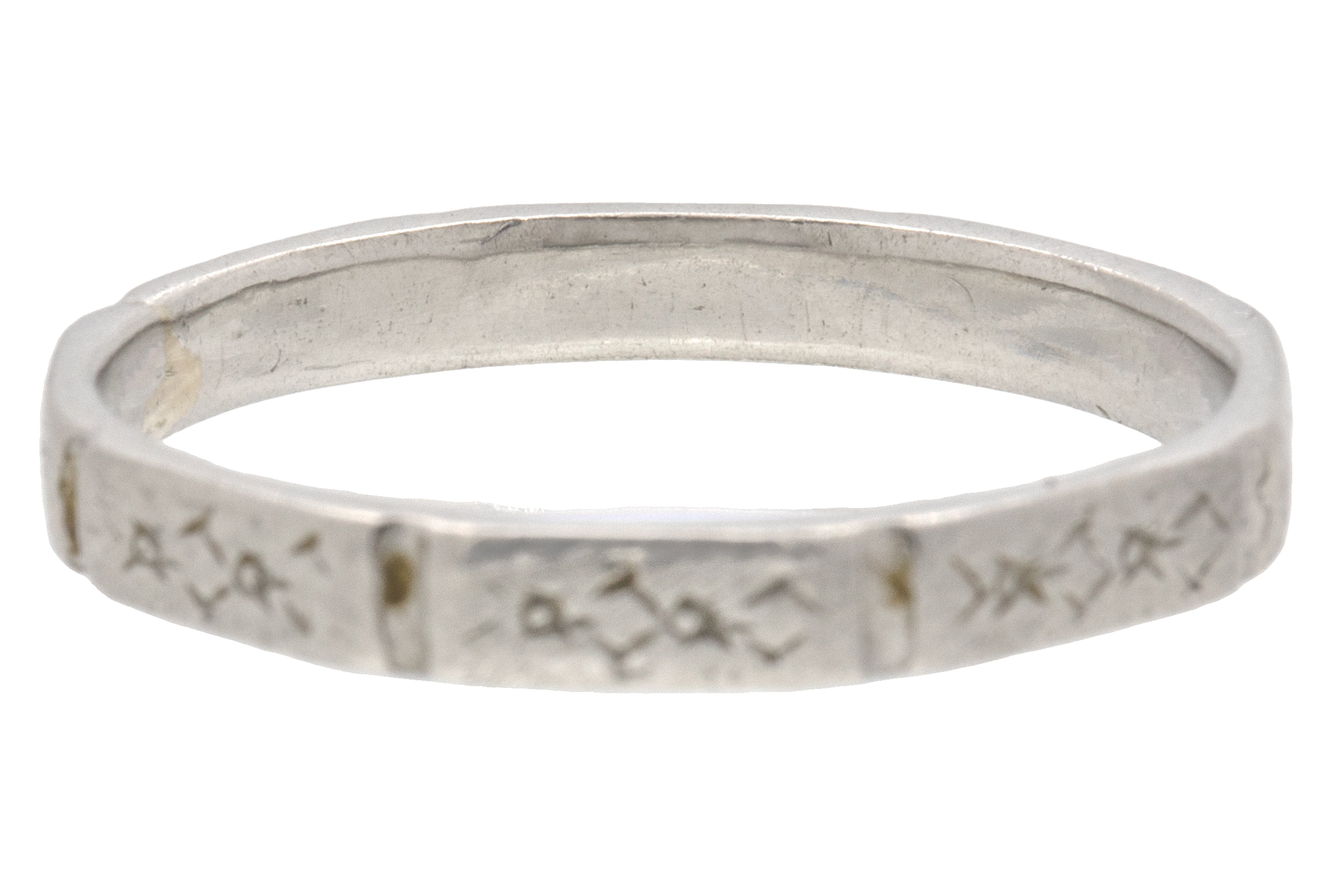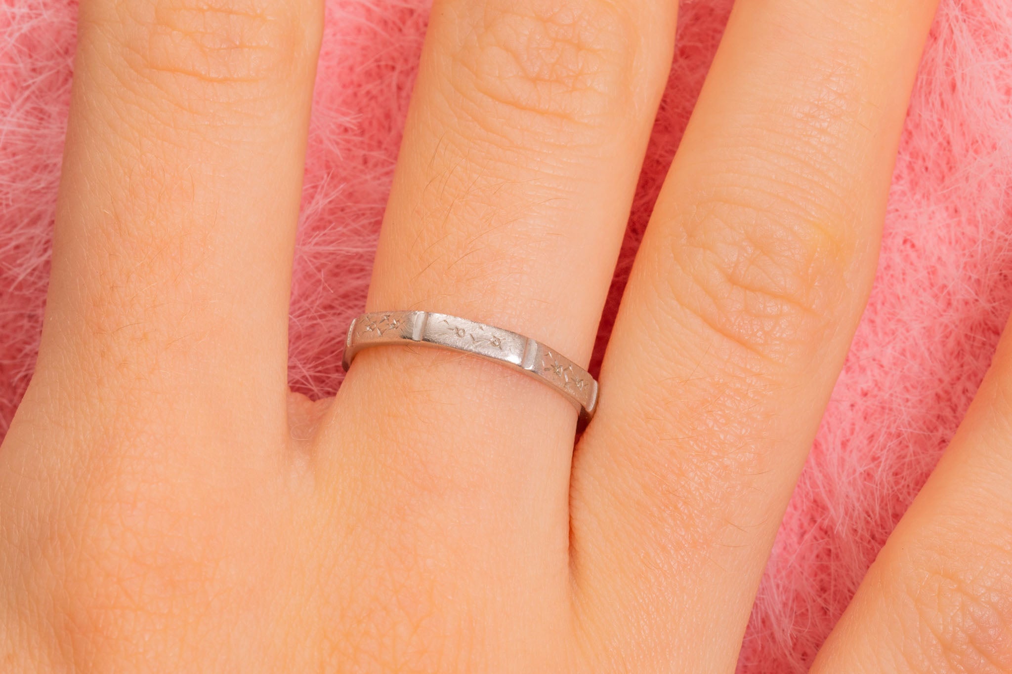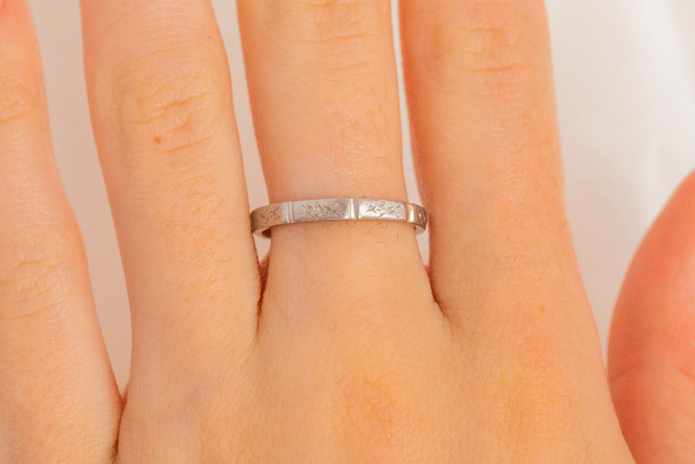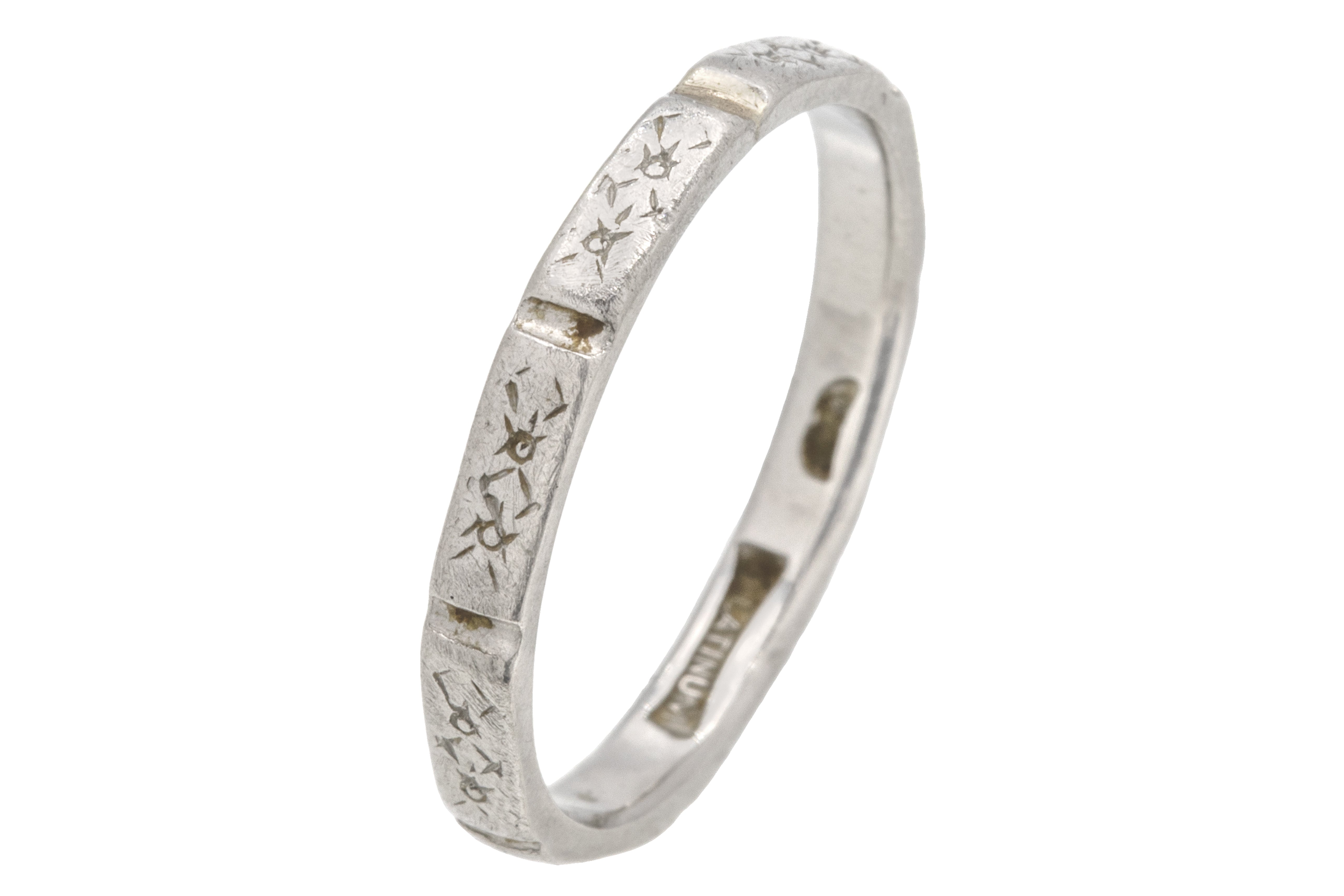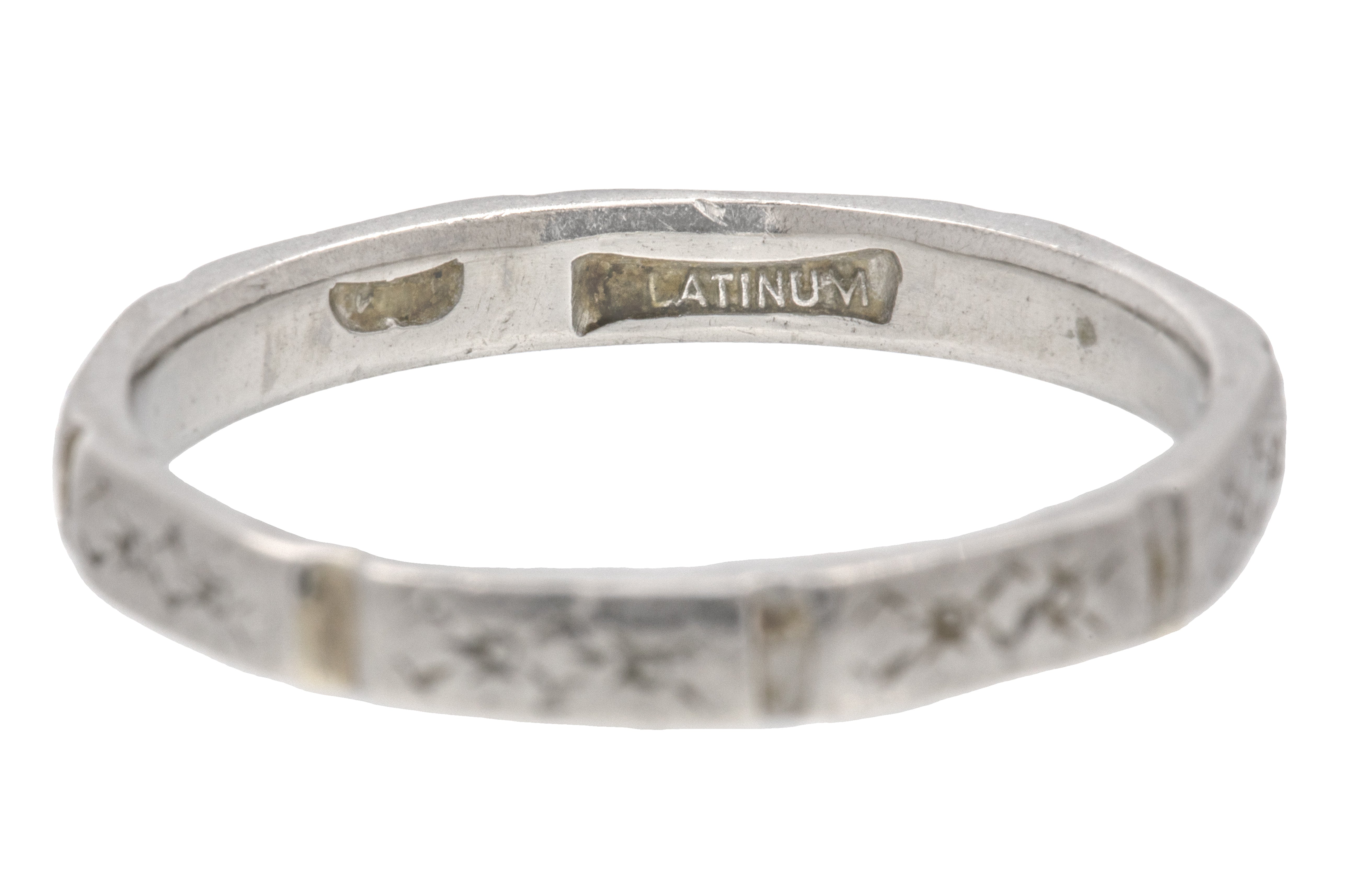 VERY GOOD. This Art Deco Platinum orange blossom engraved band is in very good condition! Each faceted edge has gorgeous delicate engravings, some areas are worn but they are still visible. The ring band has retained its structural integrity and wears comfortably. Aside from some subtle wear, commensurate with age, this Art Deco ring is in beautiful condition and is calling your name!