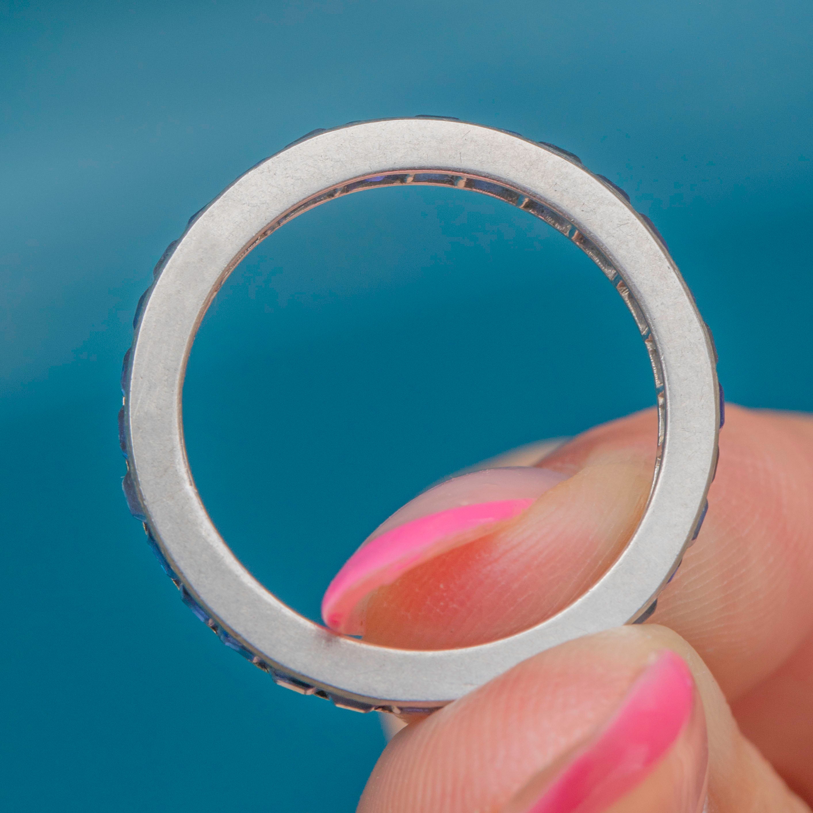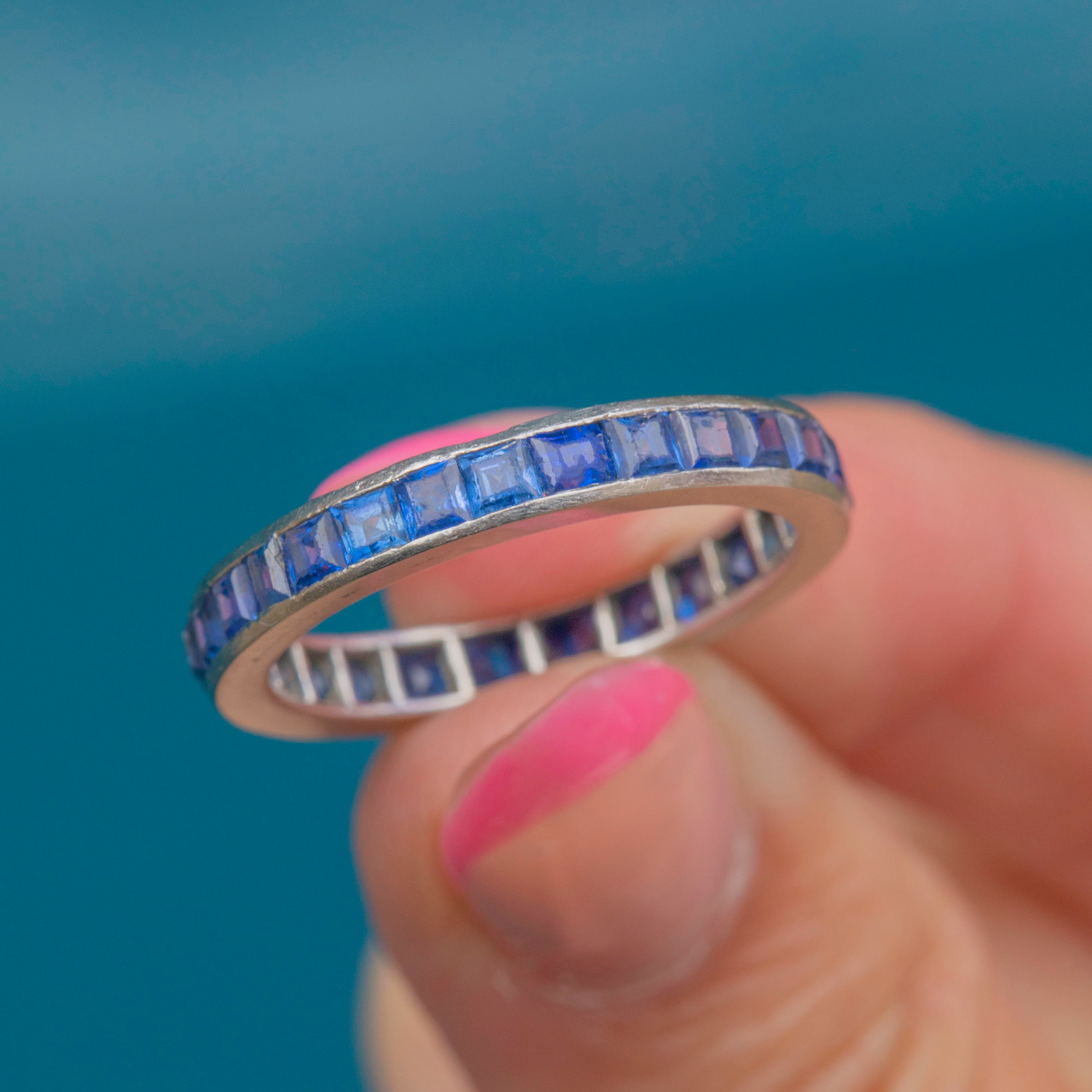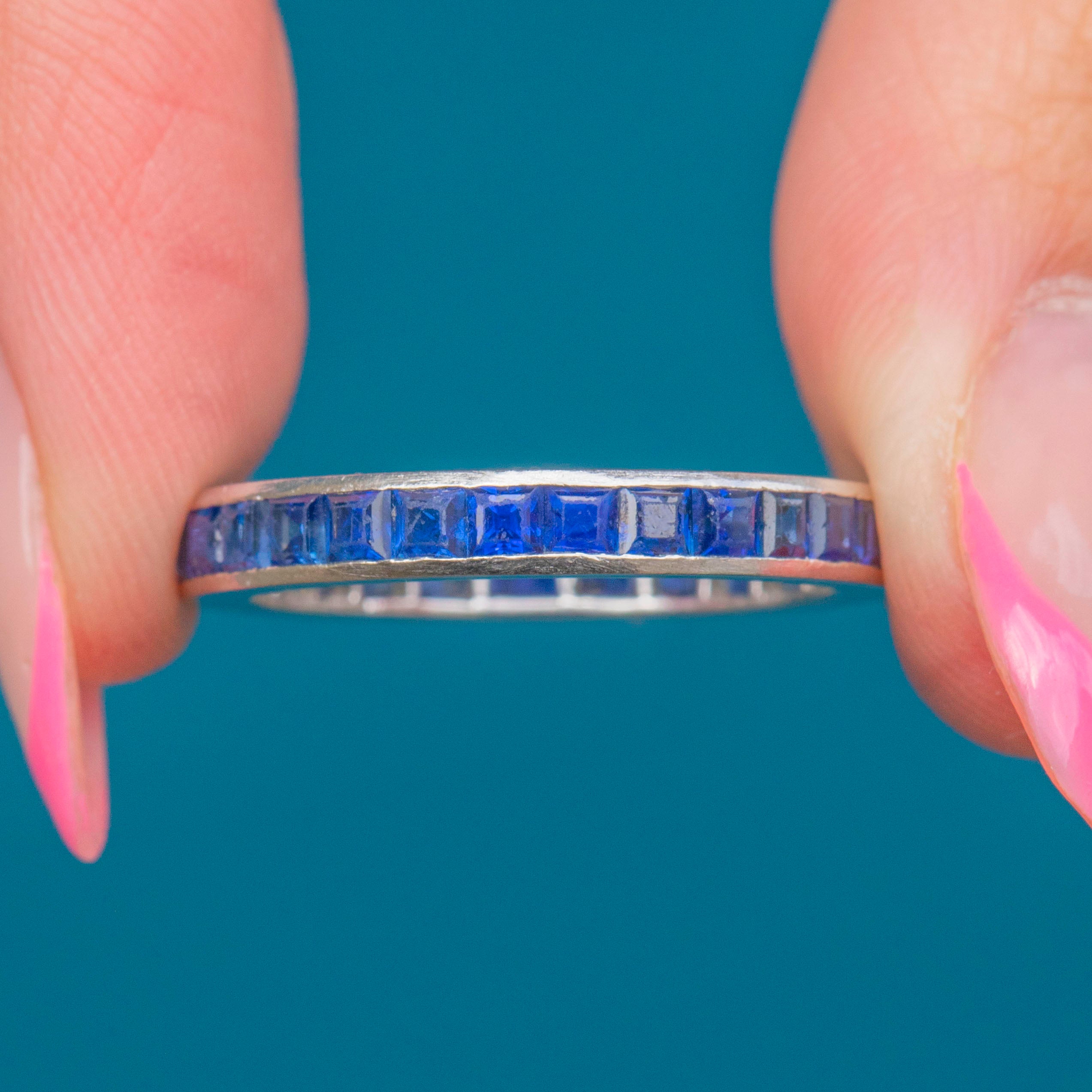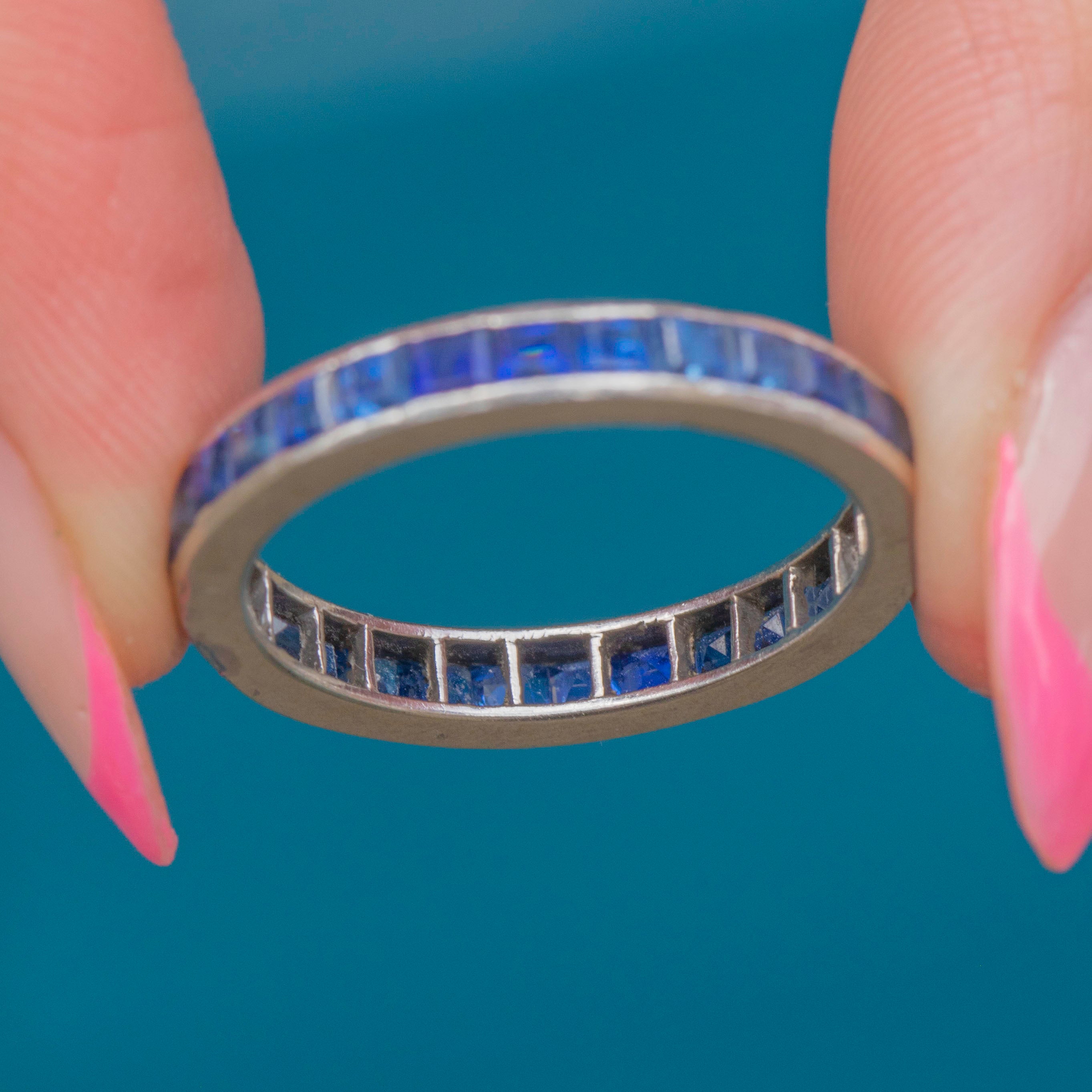 VERY GOOD-EXCELLENT: We are delighted to report that this Art Deco Platinum Sapphire eternity ring is in very good to excellent condition. Her Platinum is smooth and well-maintained with only mild wear, while her Sapphires remain uniform, with only a small amount of wear to their surfaces, which is only visible under the inspection of a jeweller's loupe. Please note that this ring cannot be resized due to the continuous Sapphires set around the entirety of the ring.