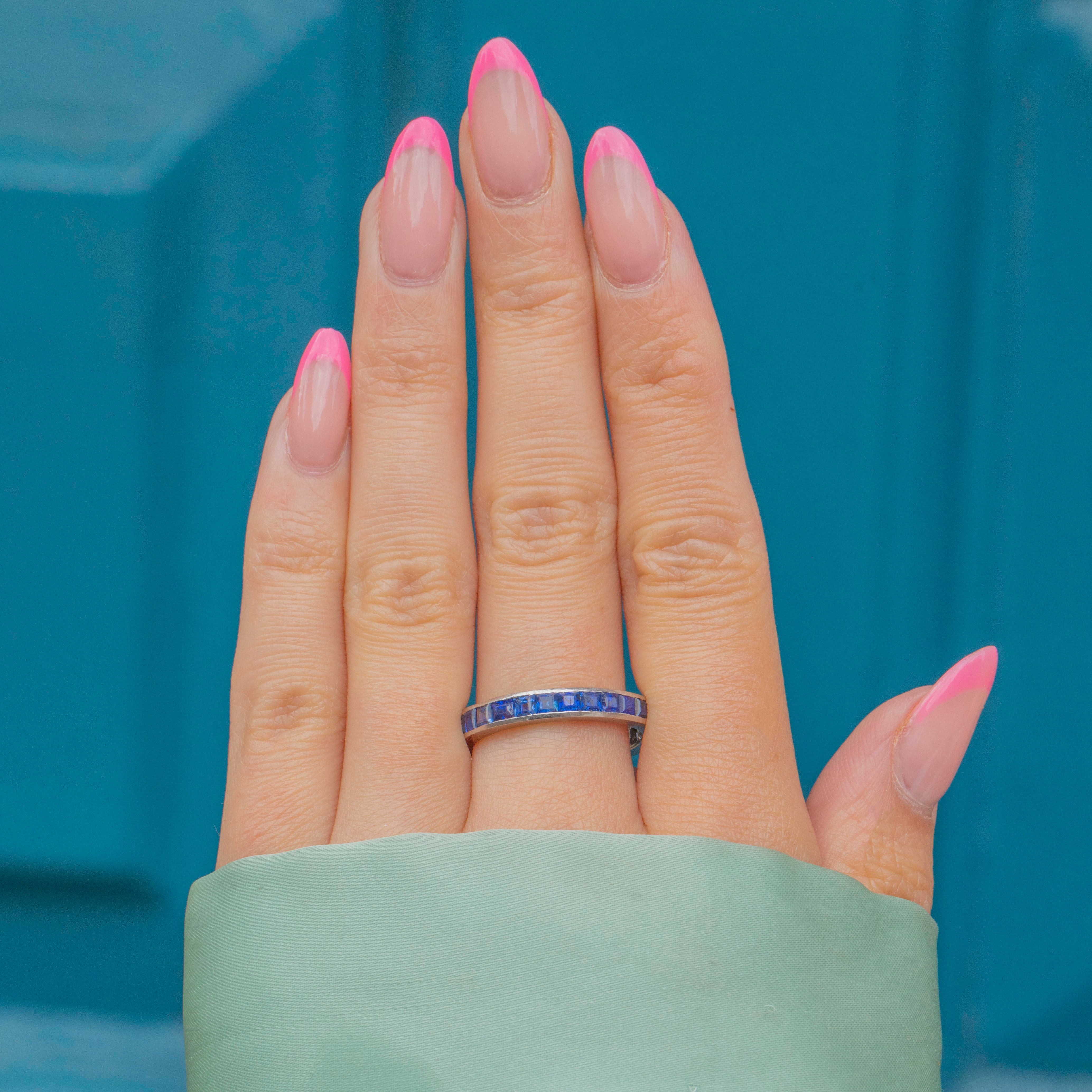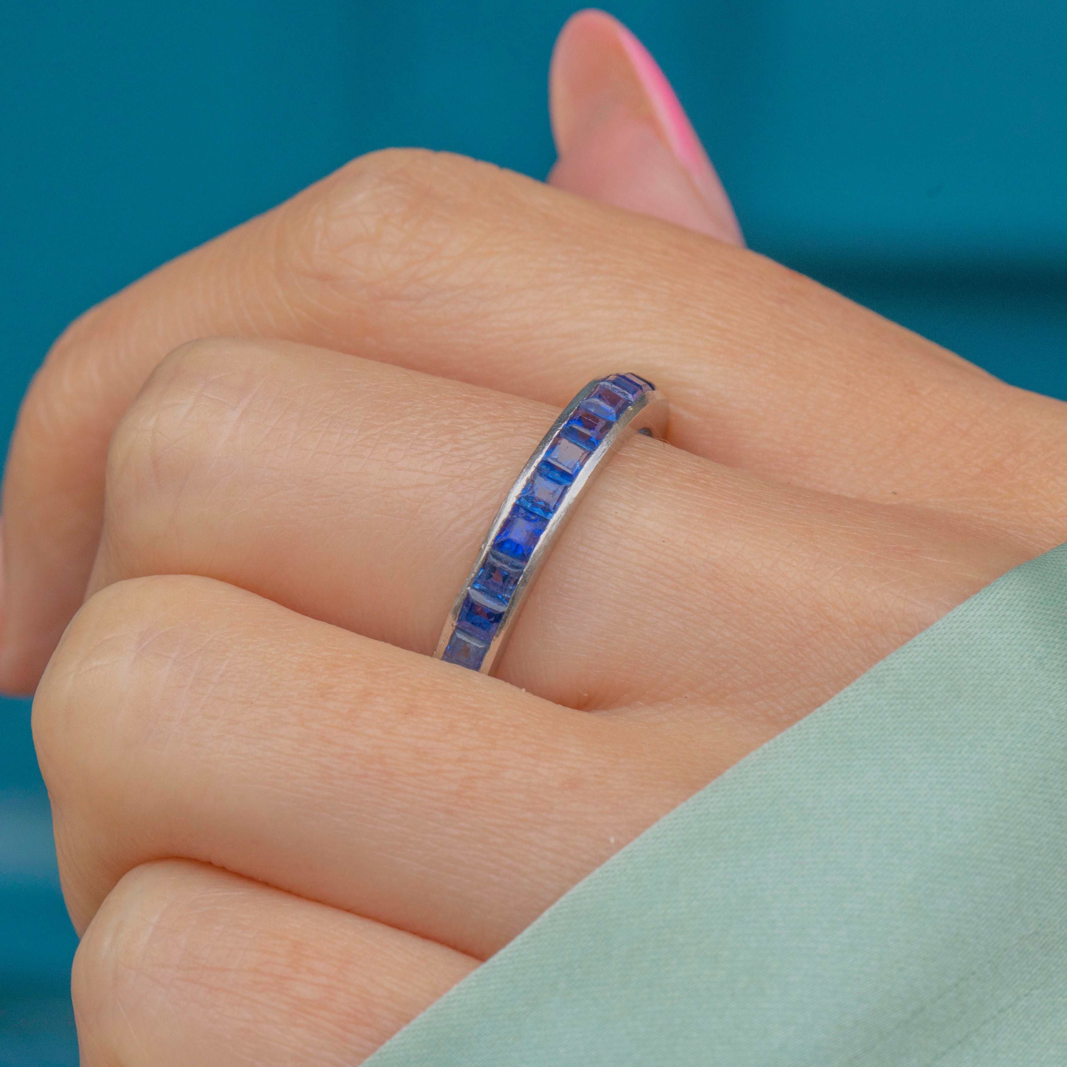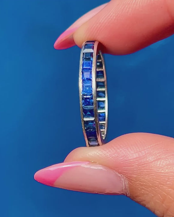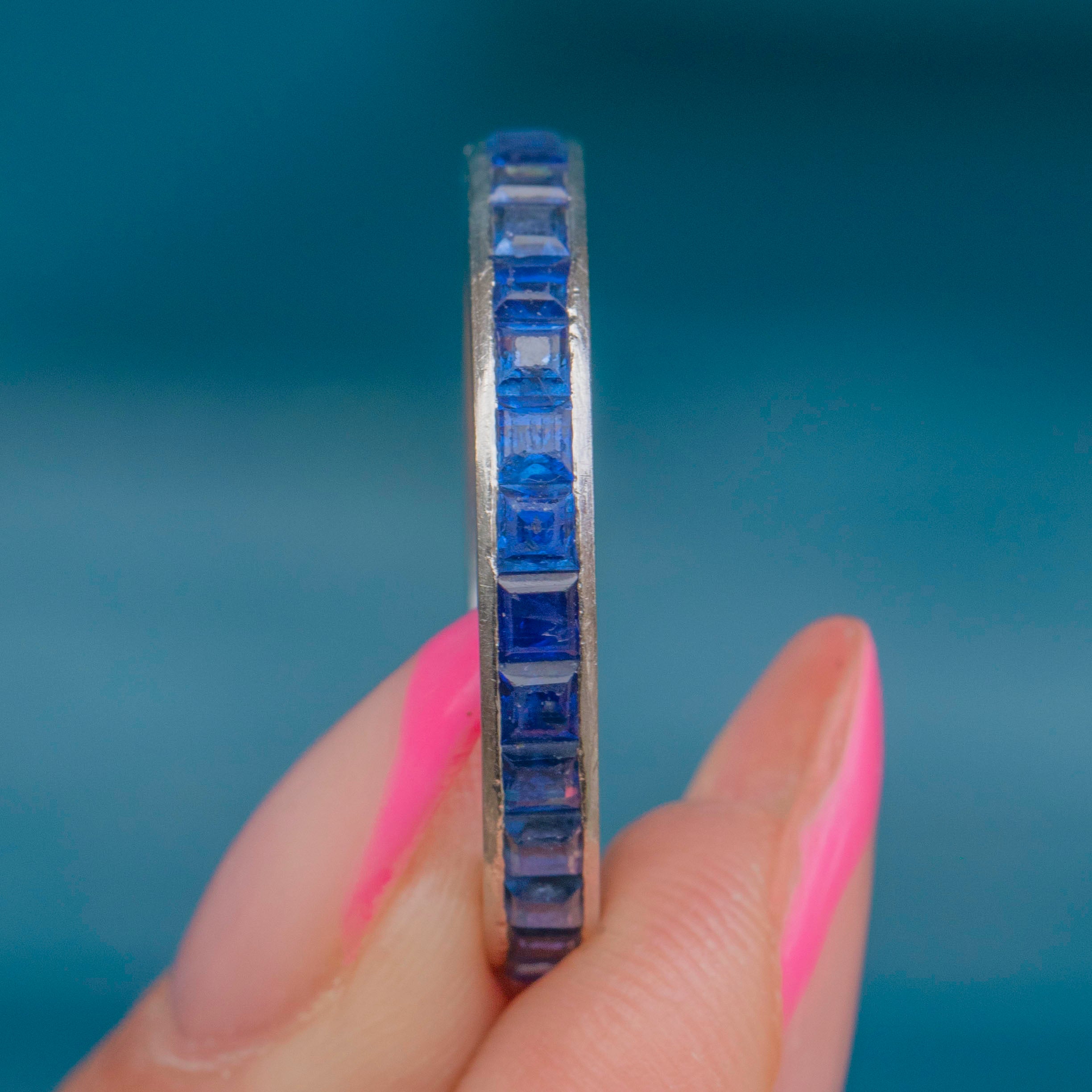 VERY GOOD-EXCELLENT: We are delighted to report that this Art Deco Platinum Sapphire eternity ring is in very good to excellent condition. Her Platinum is smooth and well-maintained with only mild wear, while her Sapphires remain uniform, with only a small amount of wear to their surfaces, which is only visible under the inspection of a jeweller's loupe. Please note that this ring cannot be resized due to the continuous Sapphires set around the entirety of the ring.