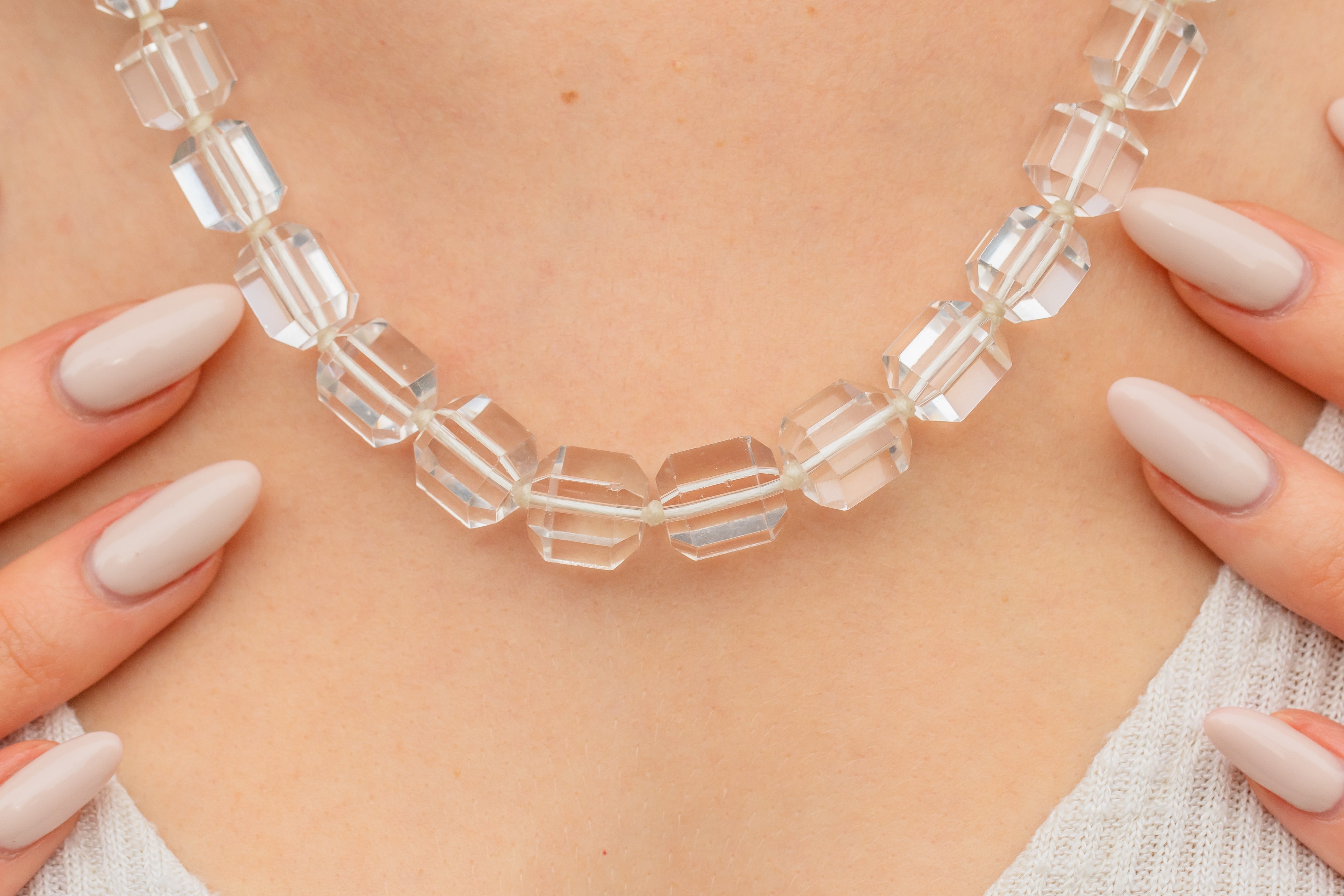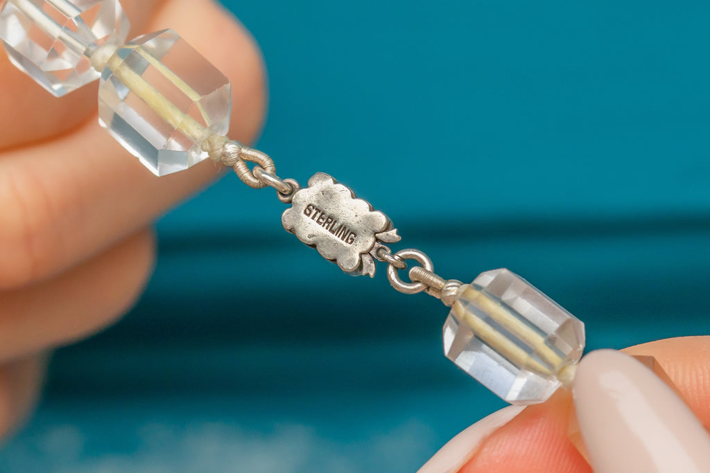 VERY GOOD. This Art Deco Rock Crystal beaded necklace is in very good condition. All of the beads are firmly connected and well-strung, with the Sterling Silver clasp also in fine working order! A few of the Rock Crystal beads have some minor abrasions after being worn and adored over many years but nothing significant. The Rock Crystals have been strung with thought and care, with a little knot between each of the stones for secure wear. This Art Deco item has lasted impeccably well through time and she remains a stunning and impactful piece!