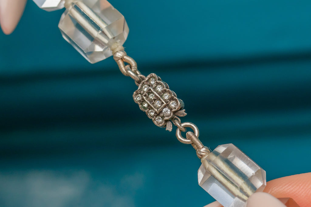 Glittering as they catch the light, each Rock Crystal on this Art Deco necklace is a geometric dream. The perfect statement necklace for your antique collection, this Rock Crystal necklace will certainly be a revered favourite within your antique collection!