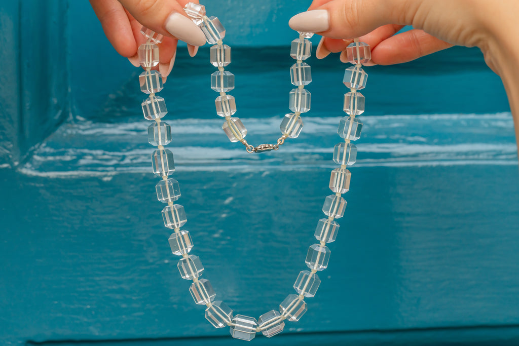 This magnificent Art Deco Rock Crystal beaded necklace is quite the statement piece! Composed of chunky faceted Rock Crystal beads, this stylish necklace comes complete with a Sterling Silver and Paste clasp for an elegant finish.