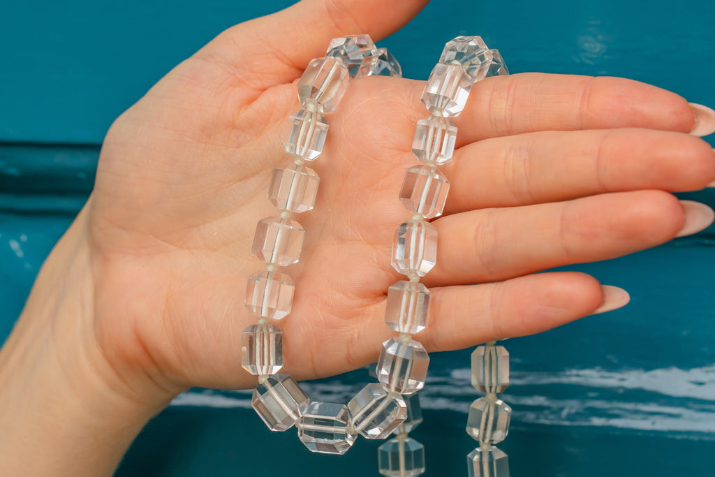 Rock Crystal beads graduate from 10mm long x 9mm wide, to 12mm long x 10mm wide.