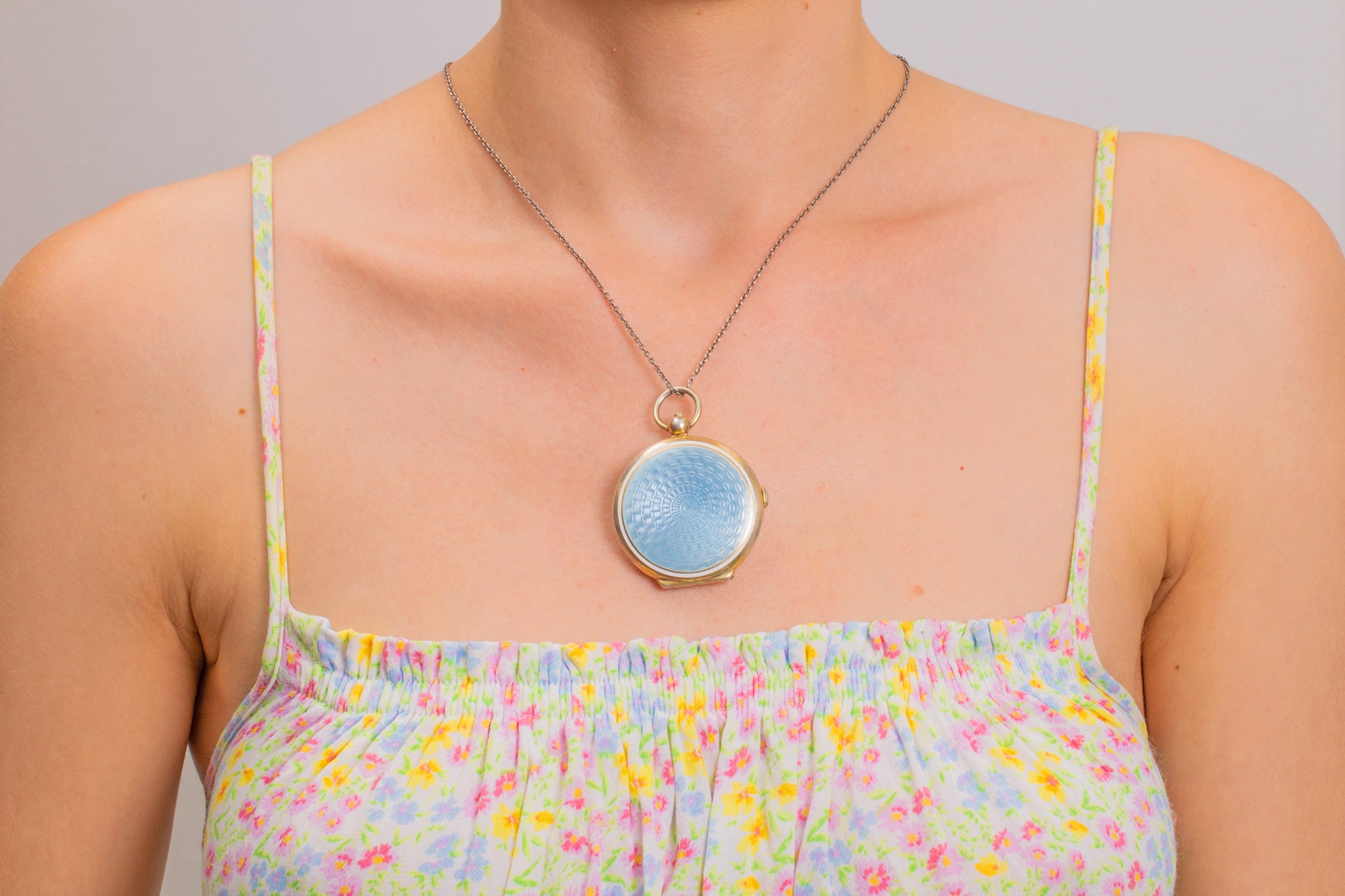 Art Deco Silver Blue Guilloché Enamel Mirror Compact Pendant