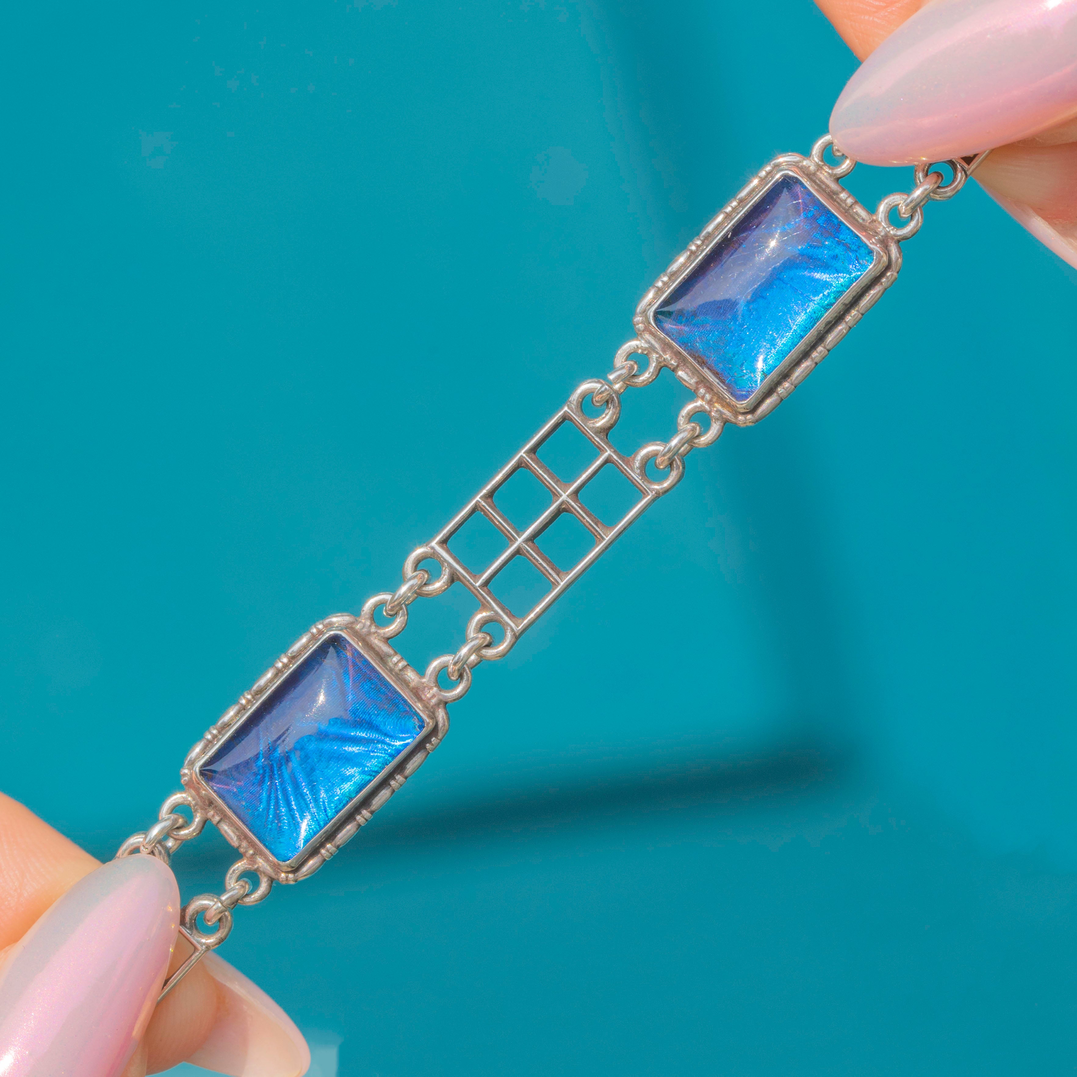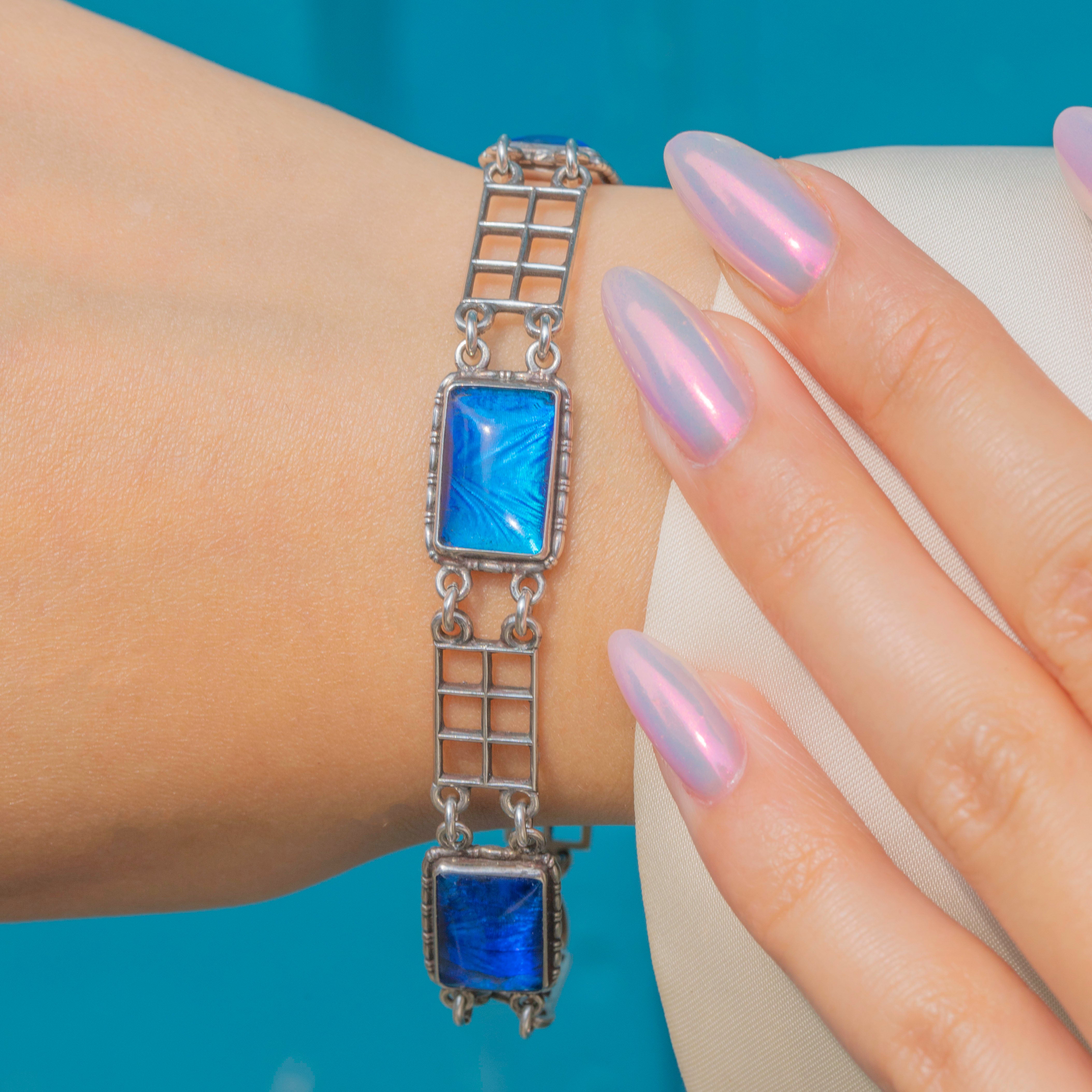 Featuring four resplendent Morpho butterfly wing links, each with a distinct vibrant azure hue with flashes of royal blue hue and a glamorous sheen, this bracelet will easily capture attention and delight.