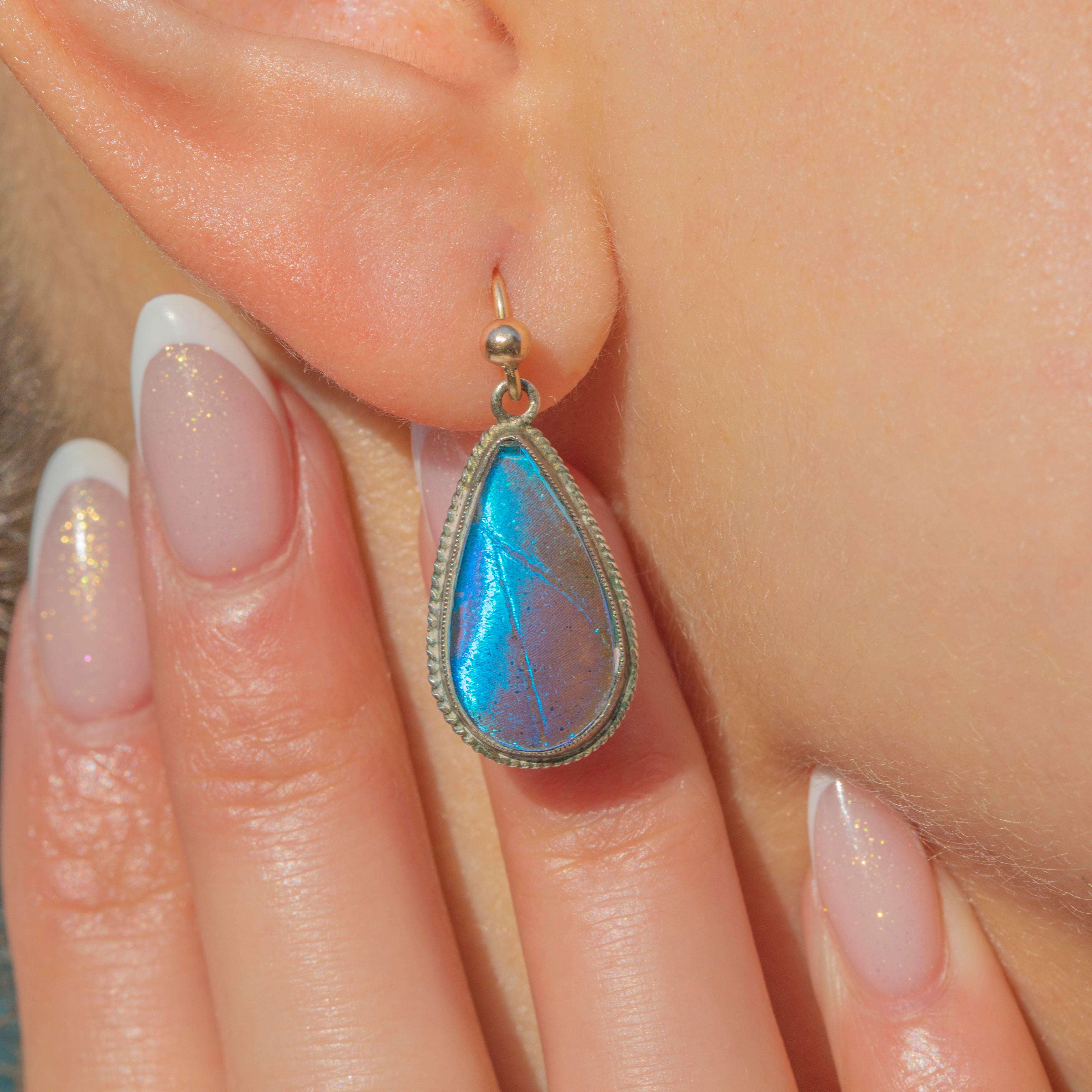 These antique drop earrings each feature a radiant Morpho butterfly wing, projecting magnificent iridescent blues and violets as they capture the light. The wings are set within glossy Silver pear drop bezels, with a detailed rope border which adds a lovely texture and depth.