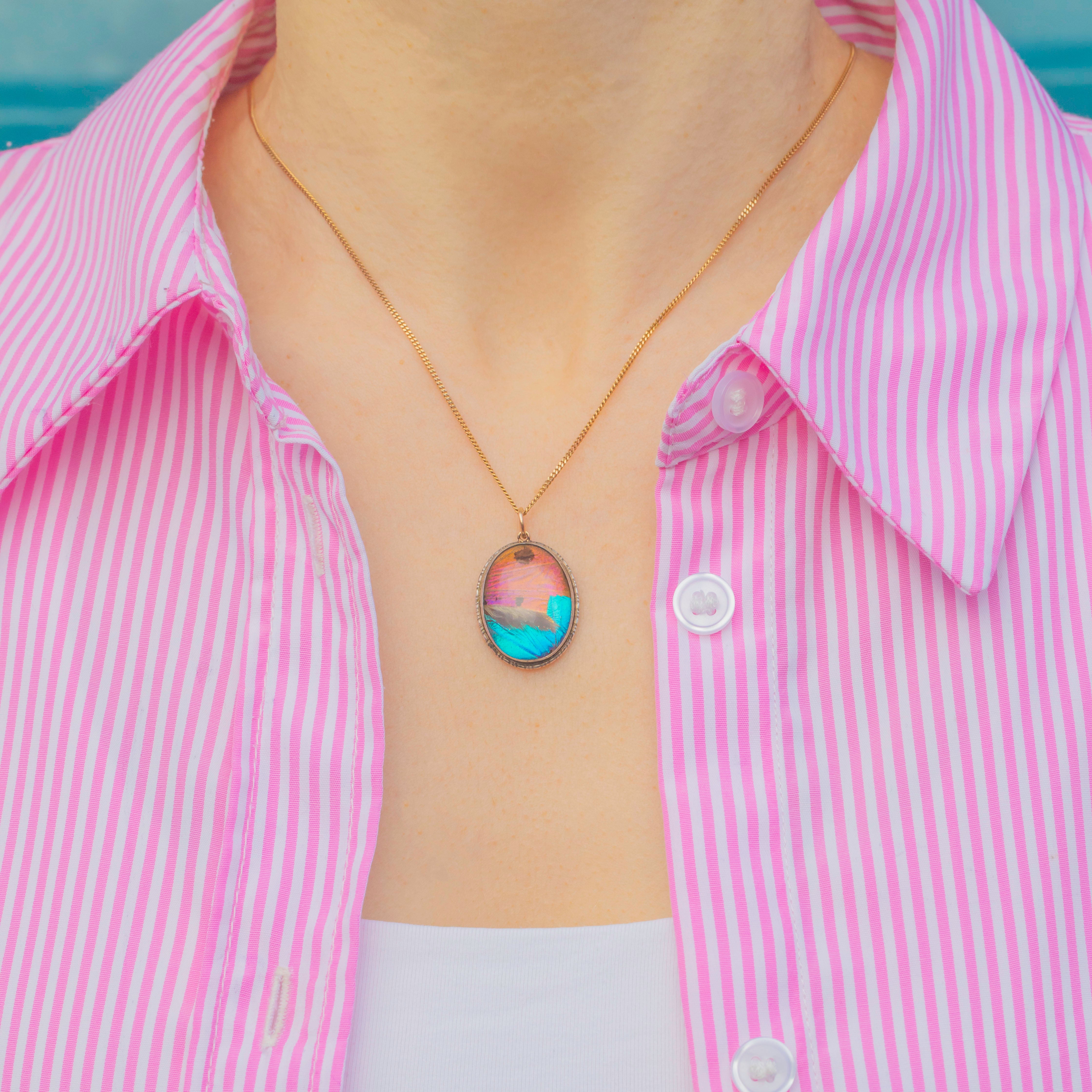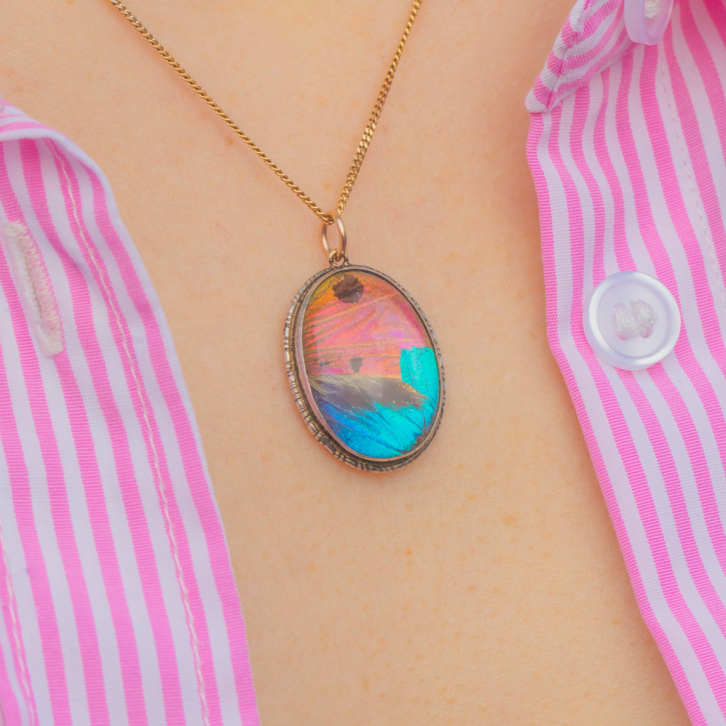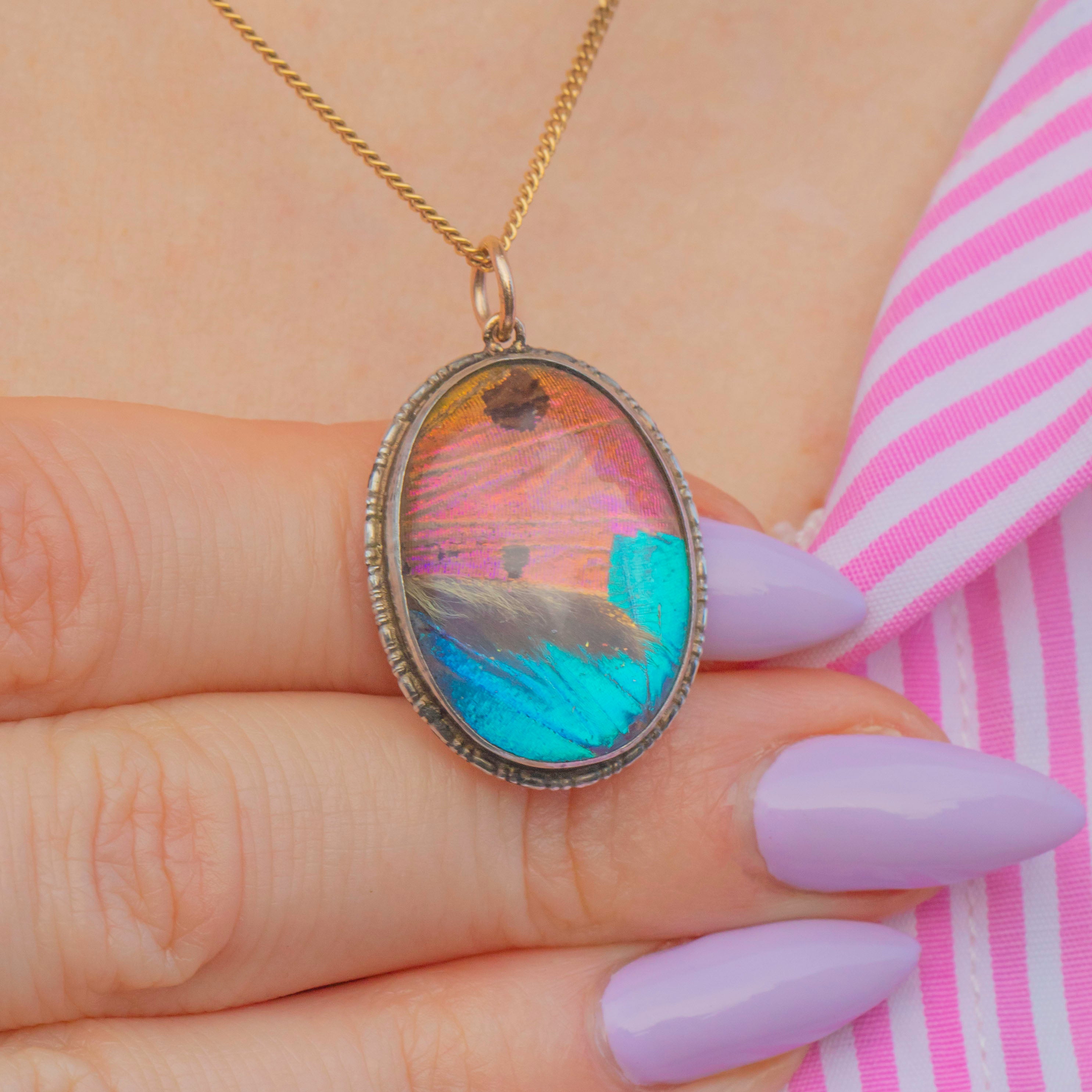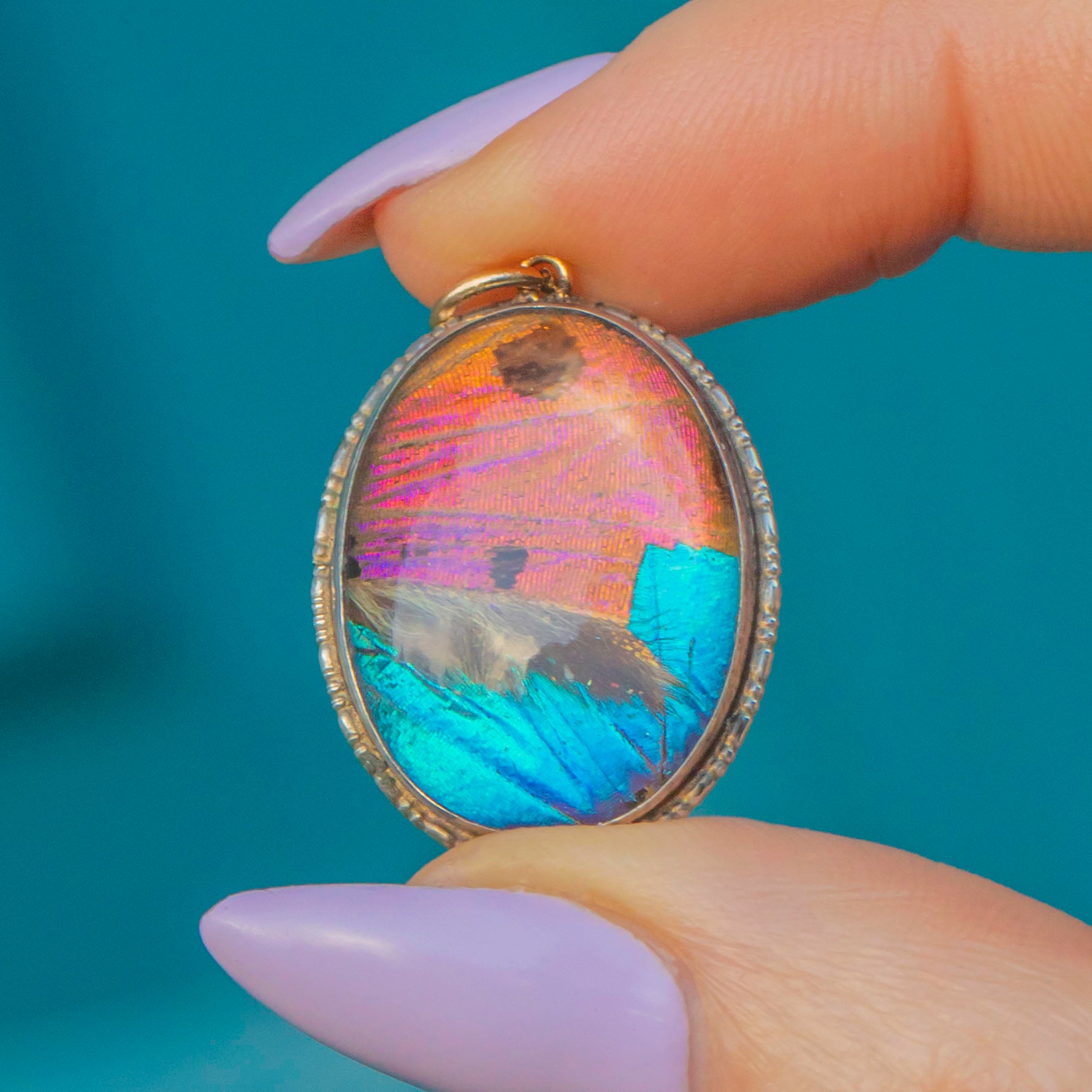 This Art Deco Silver butterfly wing pendant is a unique example of this its kind. The double layer of butterfly wings is what makes this pendant stand out, with the vibrant blue Morpho wing contrasting the earthy ornage and black wing to create a bold visual impact!
