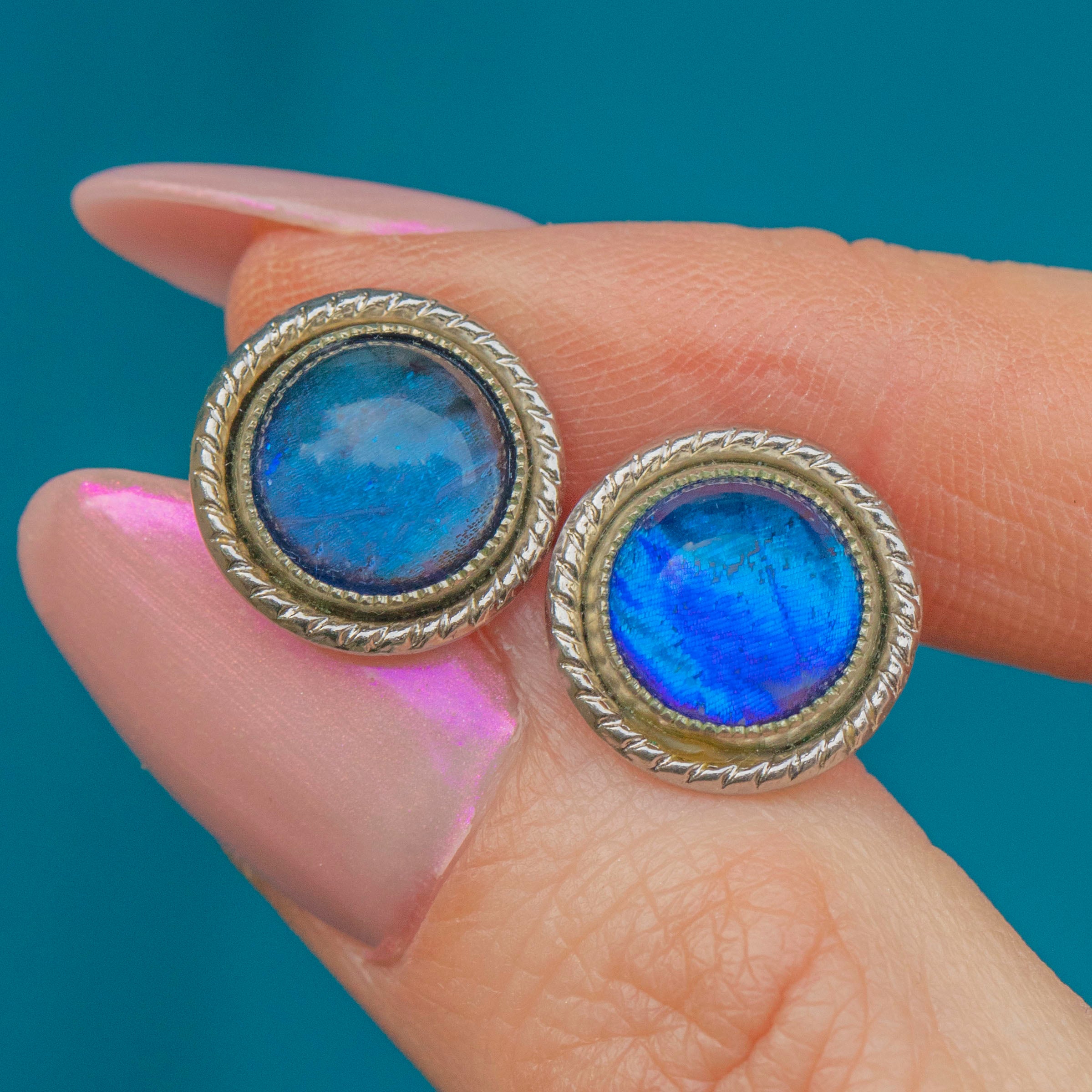 Boasting a metallic sheen, the electric blue hue of the intricate Morpho butterfly wings will captivate anyone lucky enough to lay eyes on this exotic pair.