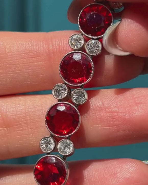 VERY GOOD-EXCELLENT. This Art Deco Silver round orange Paste bracelet is in wonderful condition. The Paste gemstones are all present and securely held within their bezels with crisp facets that twinkle from afar. Some of the Paste do have some subtle wear, including a small chip on the orange Paste on the clasp, but this is only noticeable under inspection. The Silver is lustrous and the engraved details have all remained crisp, and with a secure clasp, this antique Paste bracelet promises many more years of wear!