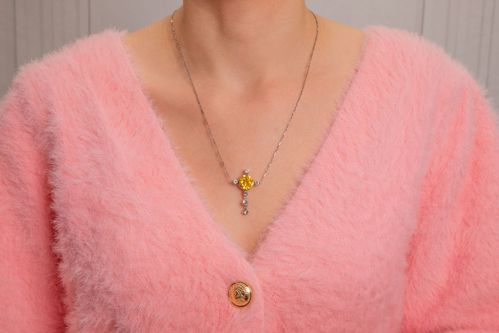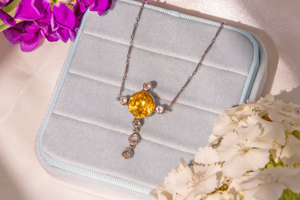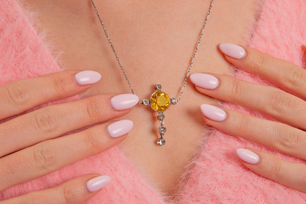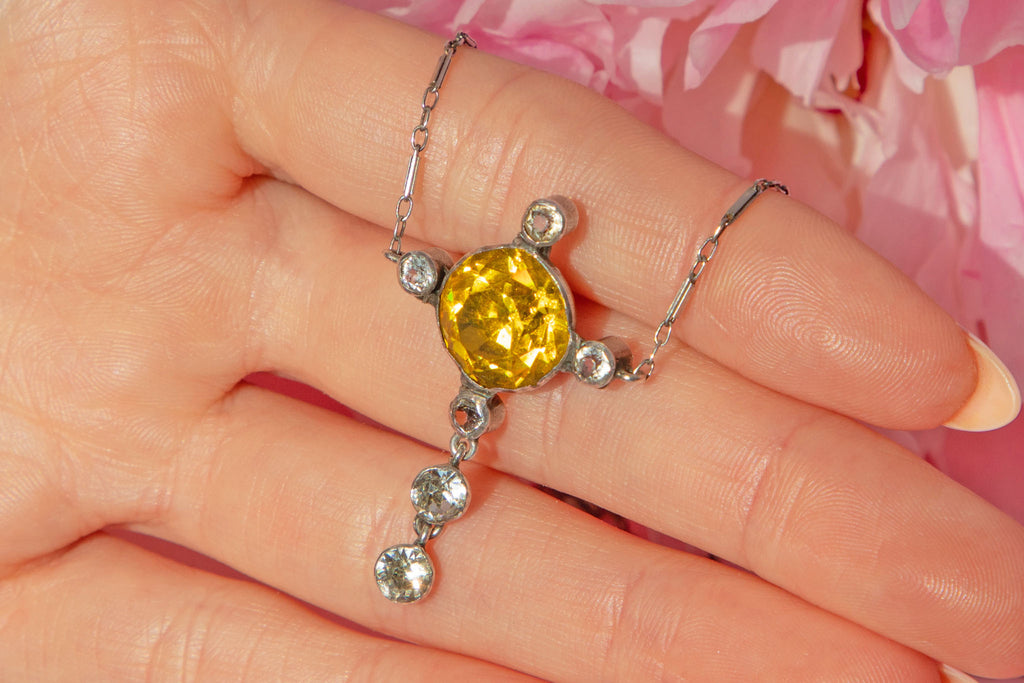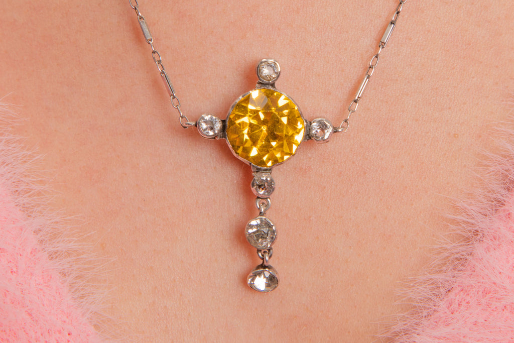 We adore this Art Deco Silver foiled yellow & white Paste integral necklace. This treasure is intriguing, to say the least, with a sunny yellow Paste centre and crisp white Paste gems to feast your eyes on!