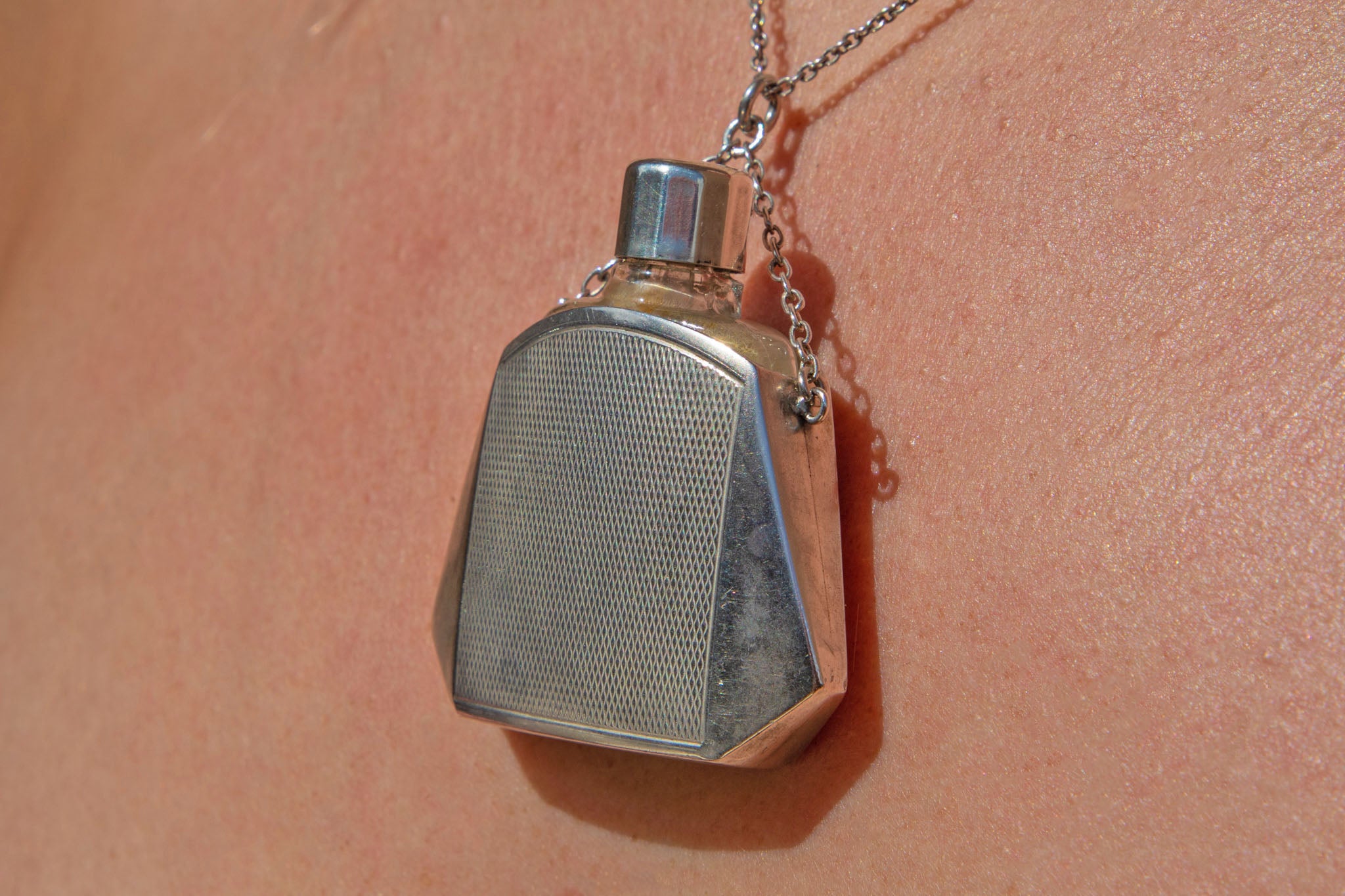 There are so many ways to enjoy this Art Deco Silver Glass perfume bottle! Wear her as a pendant or admire her as a collectible for your vanity set! Her Glass perfume bottle is safely encased in a wonderful 835 Silver sleeve.