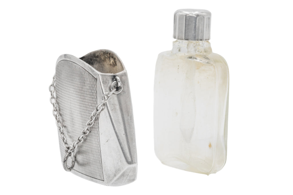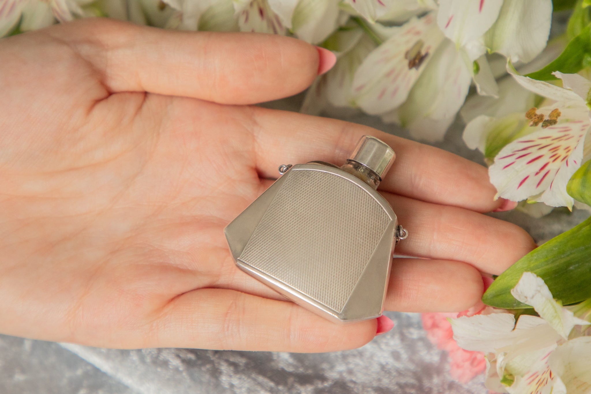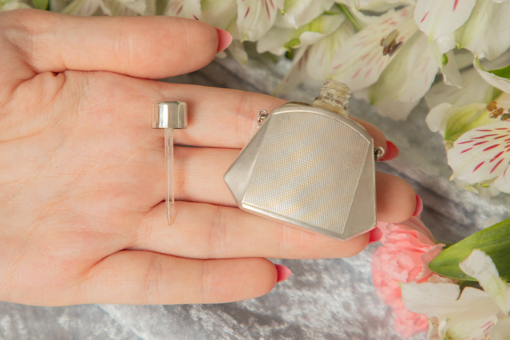 VERY GOOD: This Art Deco Silver Glass perfume bottle is in very good condition throughout. The 835 Silver has minor surface wear with a ding present on the base of the bottle, however this is not visible when worn! The bottle is fully functioning, the lid fully unscrews and stays secure so you can fill her up with your favourite perfume.
