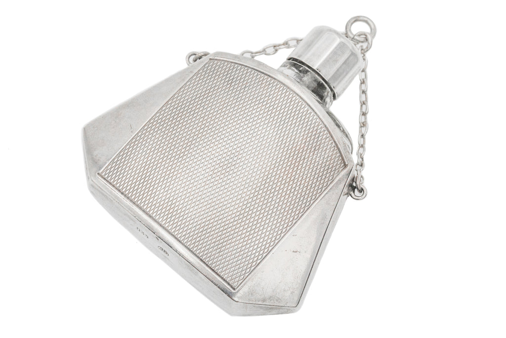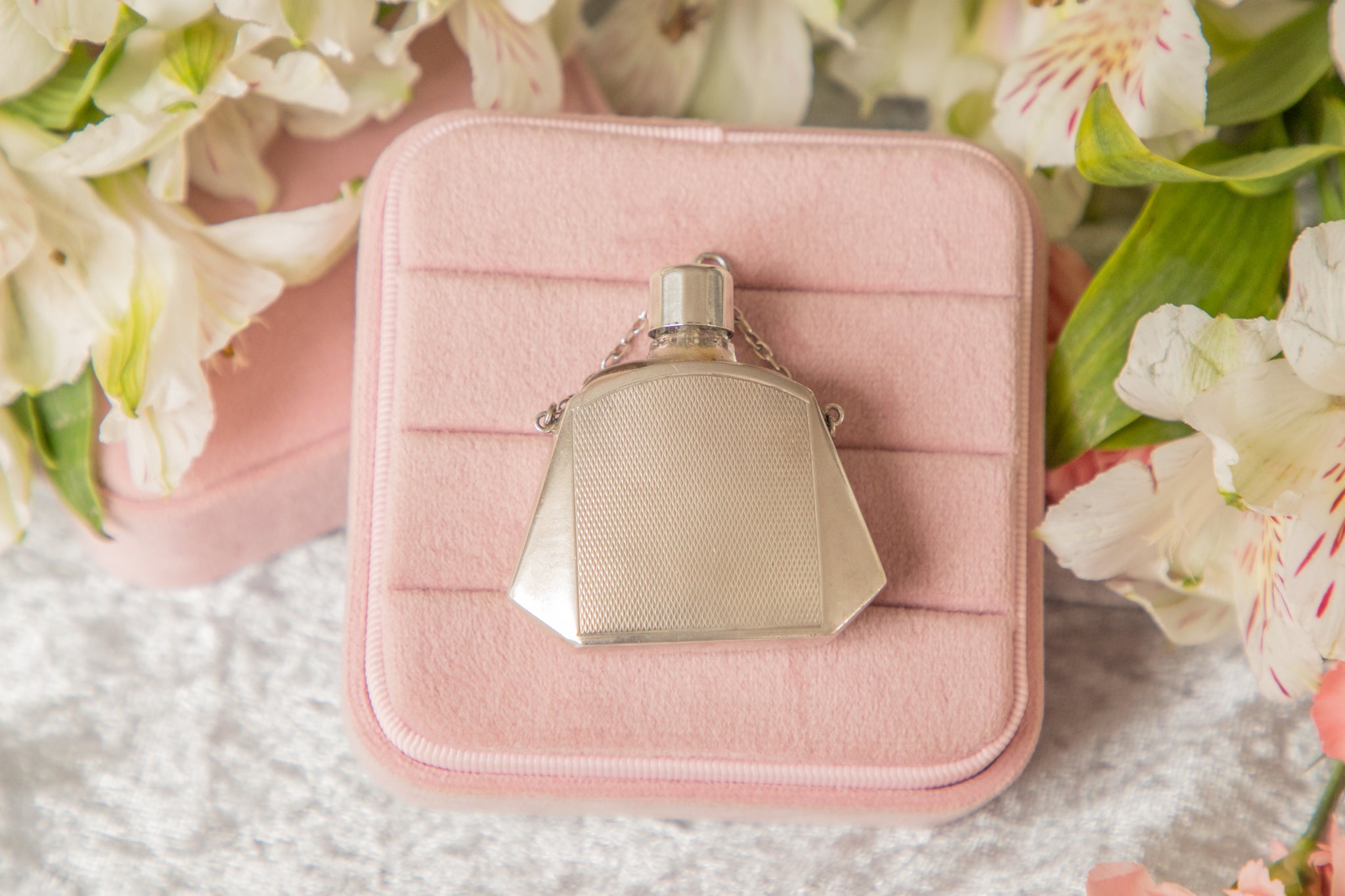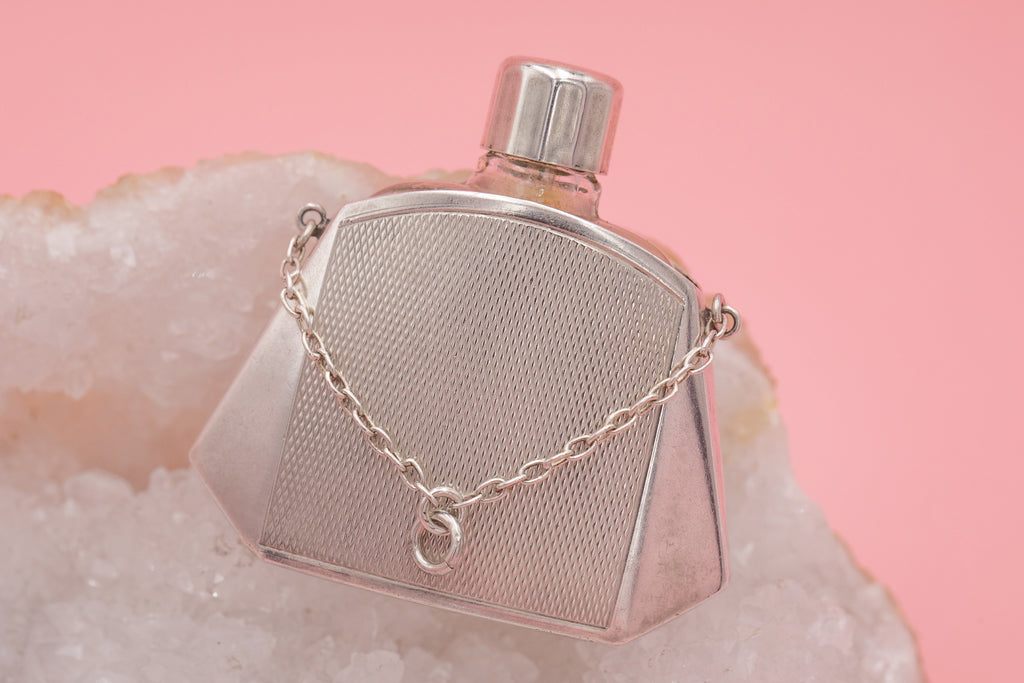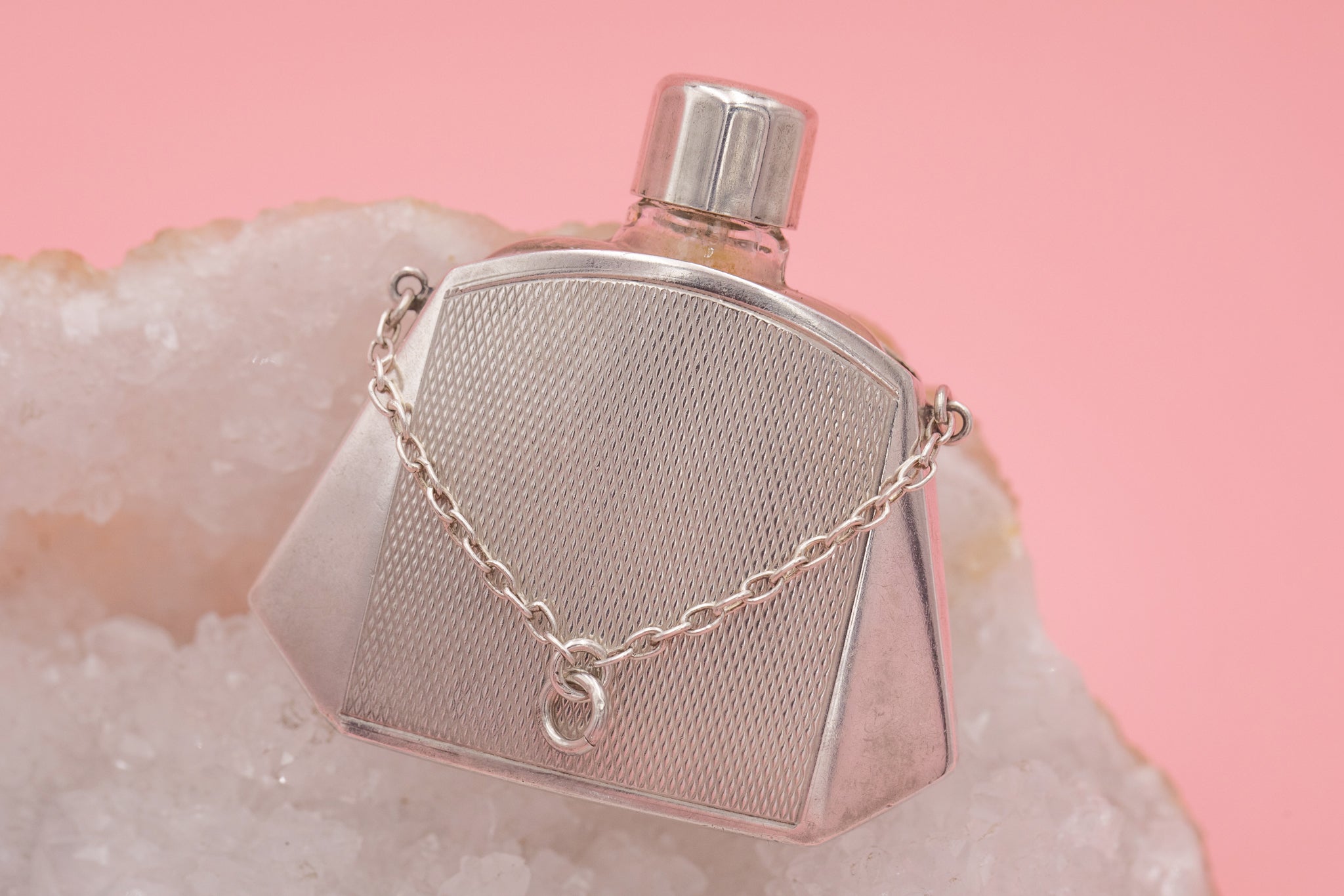 VERY GOOD: This Art Deco Silver Glass perfume bottle is in very good condition throughout. The 835 Silver has minor surface wear with a ding present on the base of the bottle, however this is not visible when worn! The bottle is fully functioning, the lid fully unscrews and stays secure so you can fill her up with your favourite perfume.