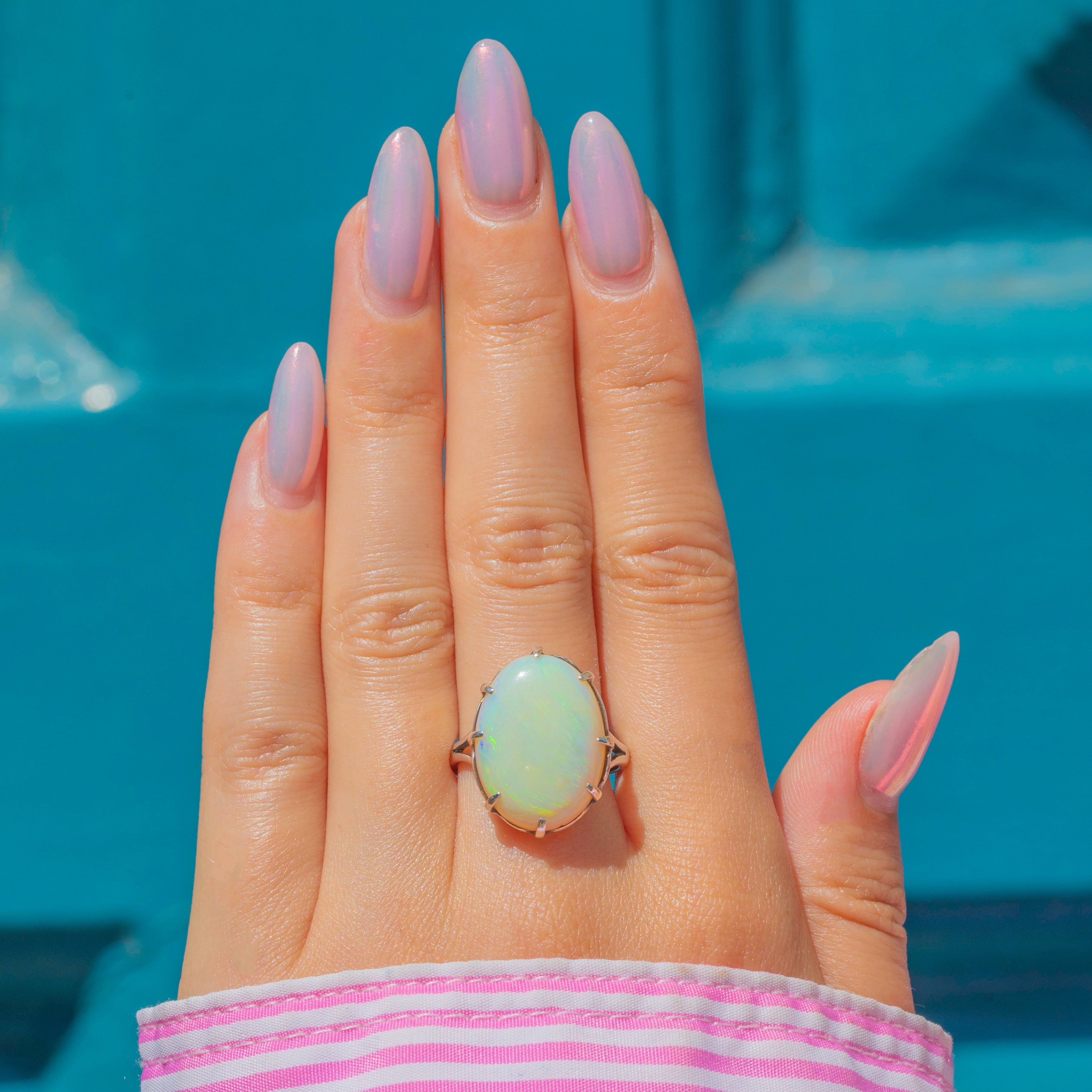 This resplendent Art Deco ring flaunts a 4.60ct pastel Opal cabochon, radiating soft honey-dew tones, with striking flashes of blue and lilac tones as it catches the light.