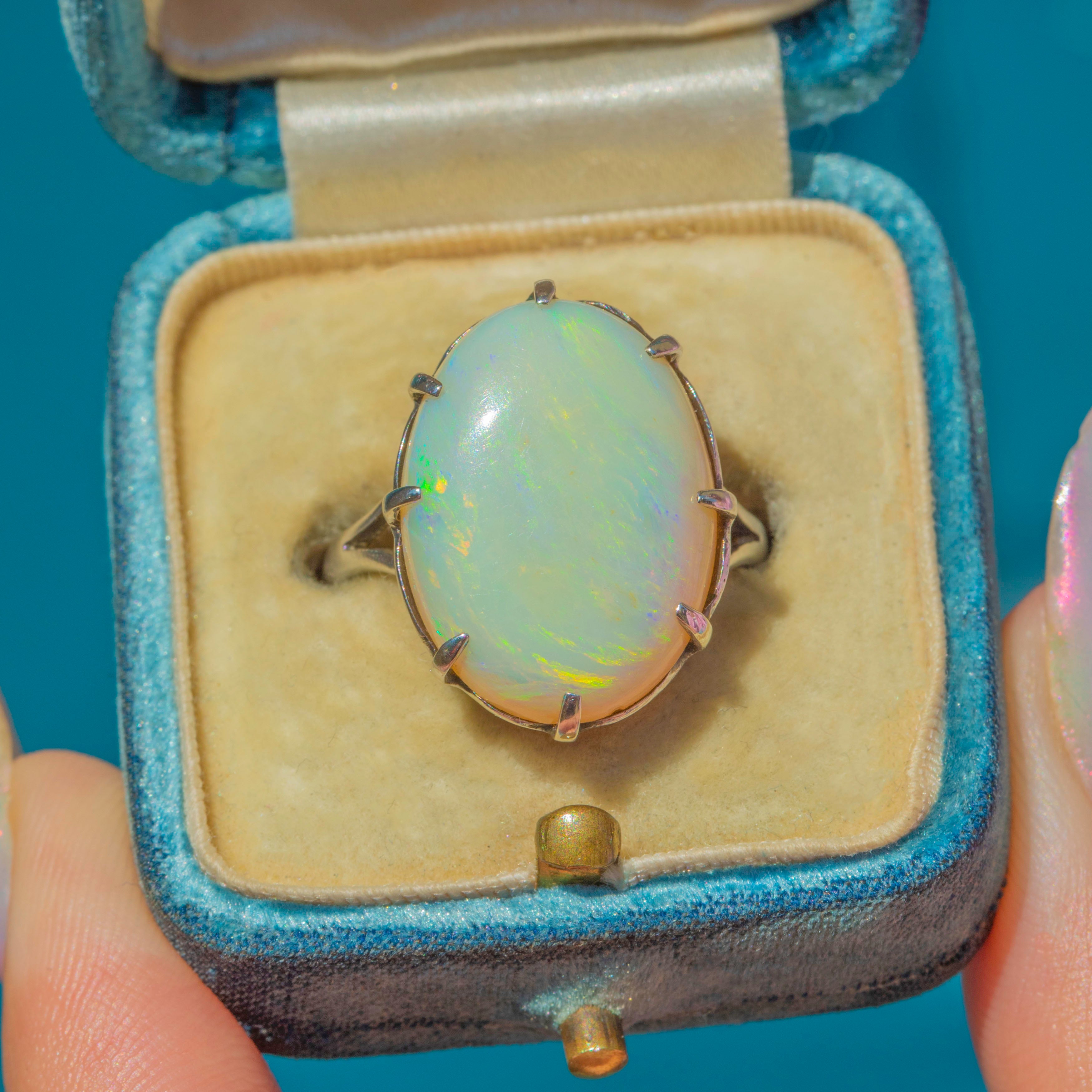 EXCELLENT: The large Opal is radiant and is free from nibbles and chips, with only a minor feather inclusion to the surface of the stone. The Opal is secure in its settings and with a smooth and sturdy band, you can wear this antique Art Deco ring with confidence and comfortability.