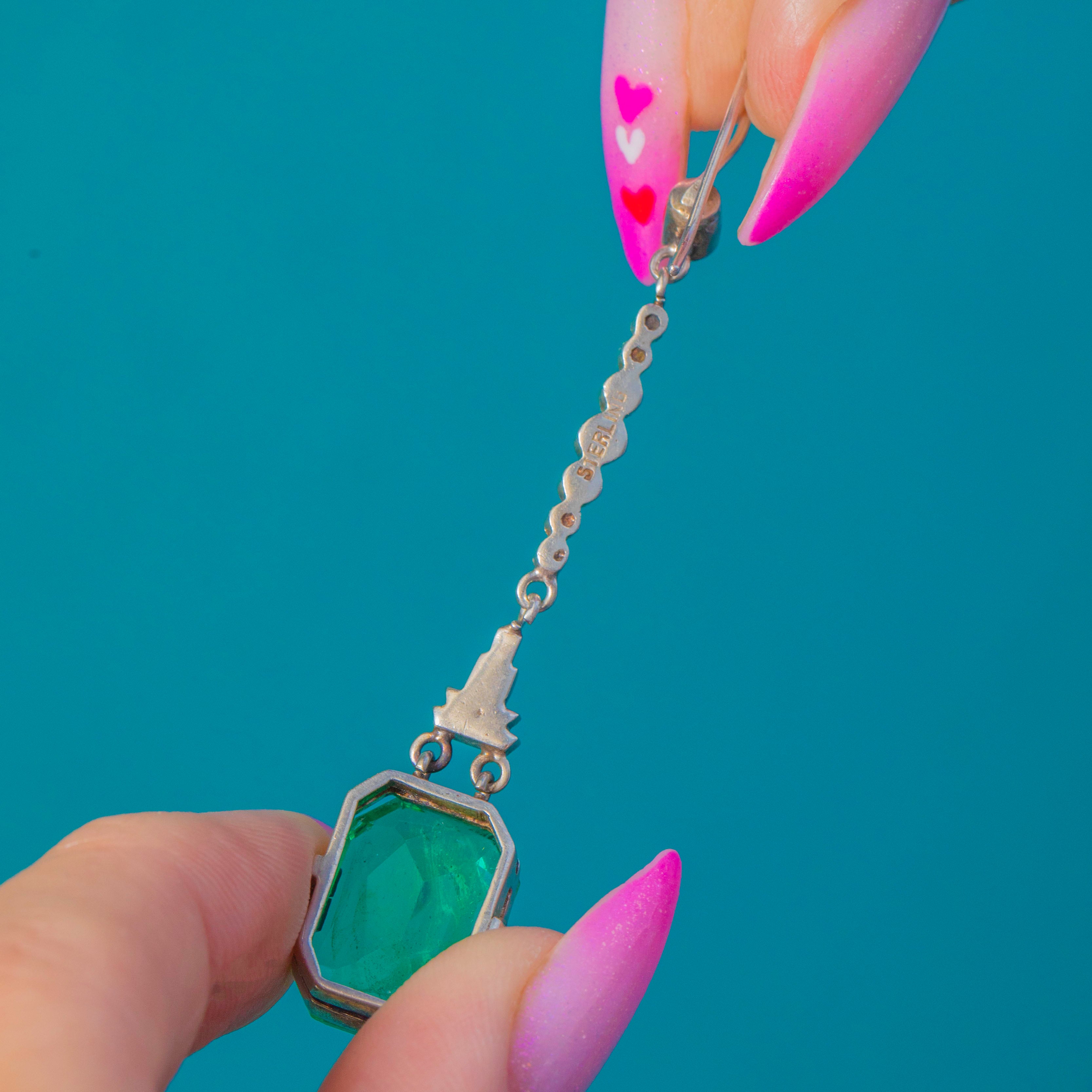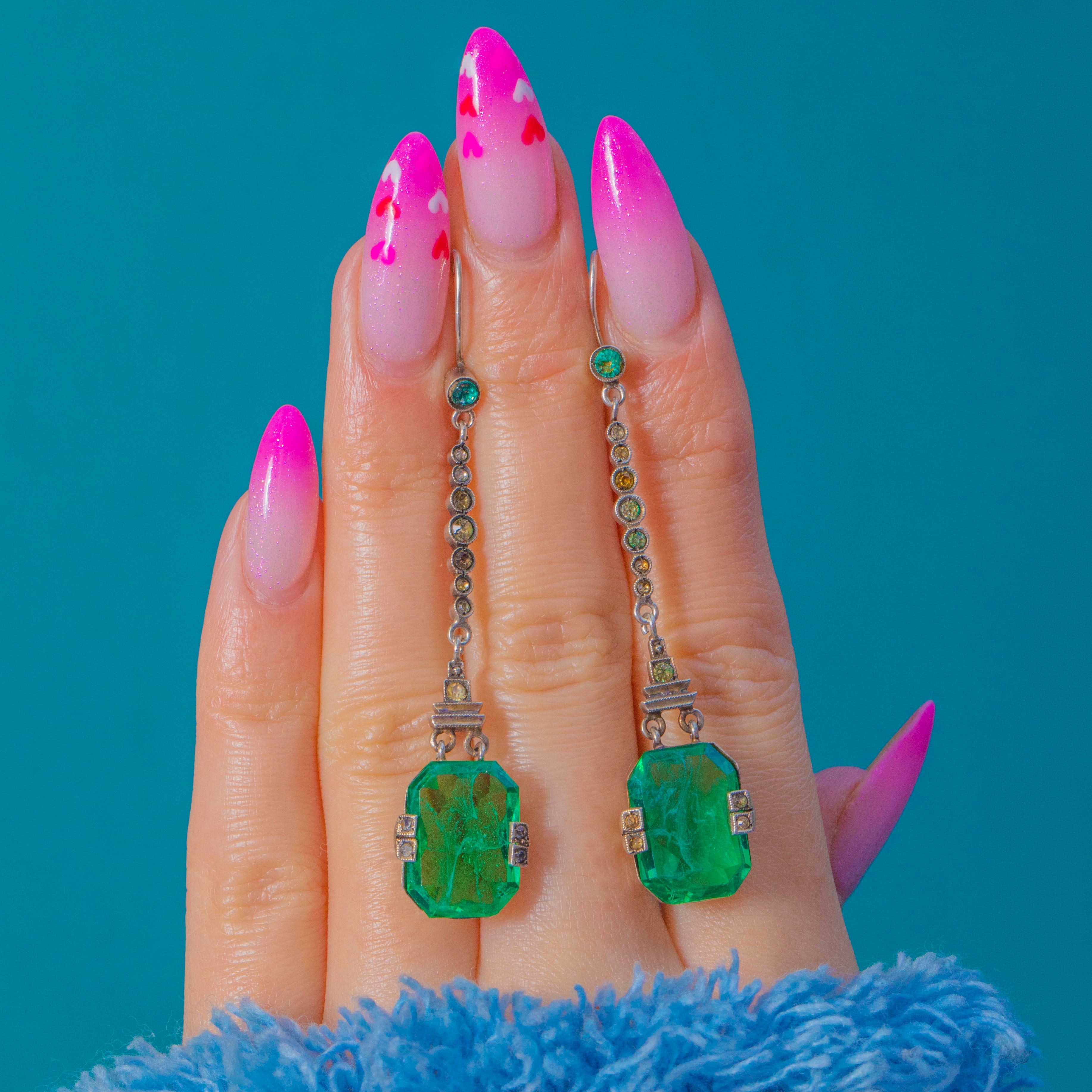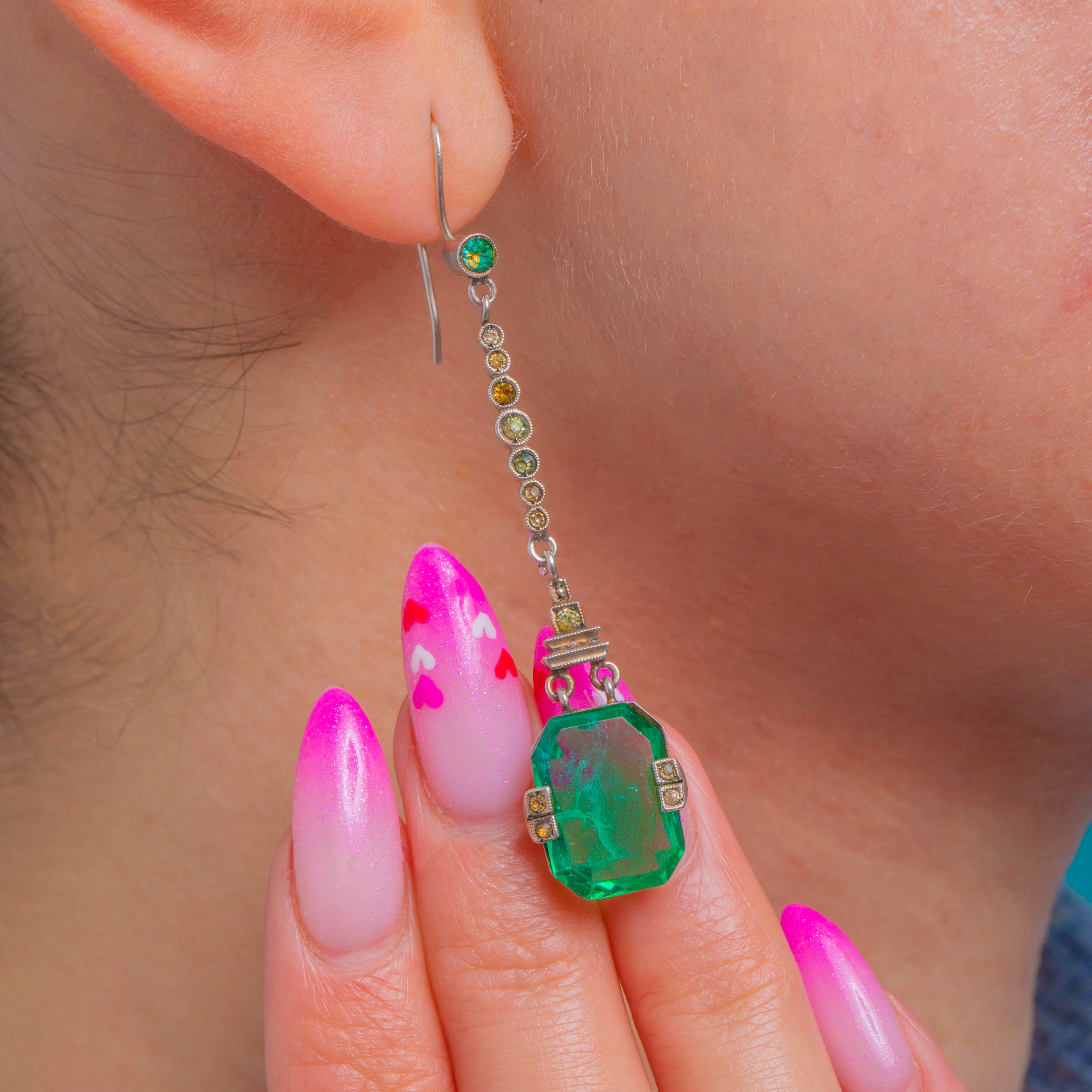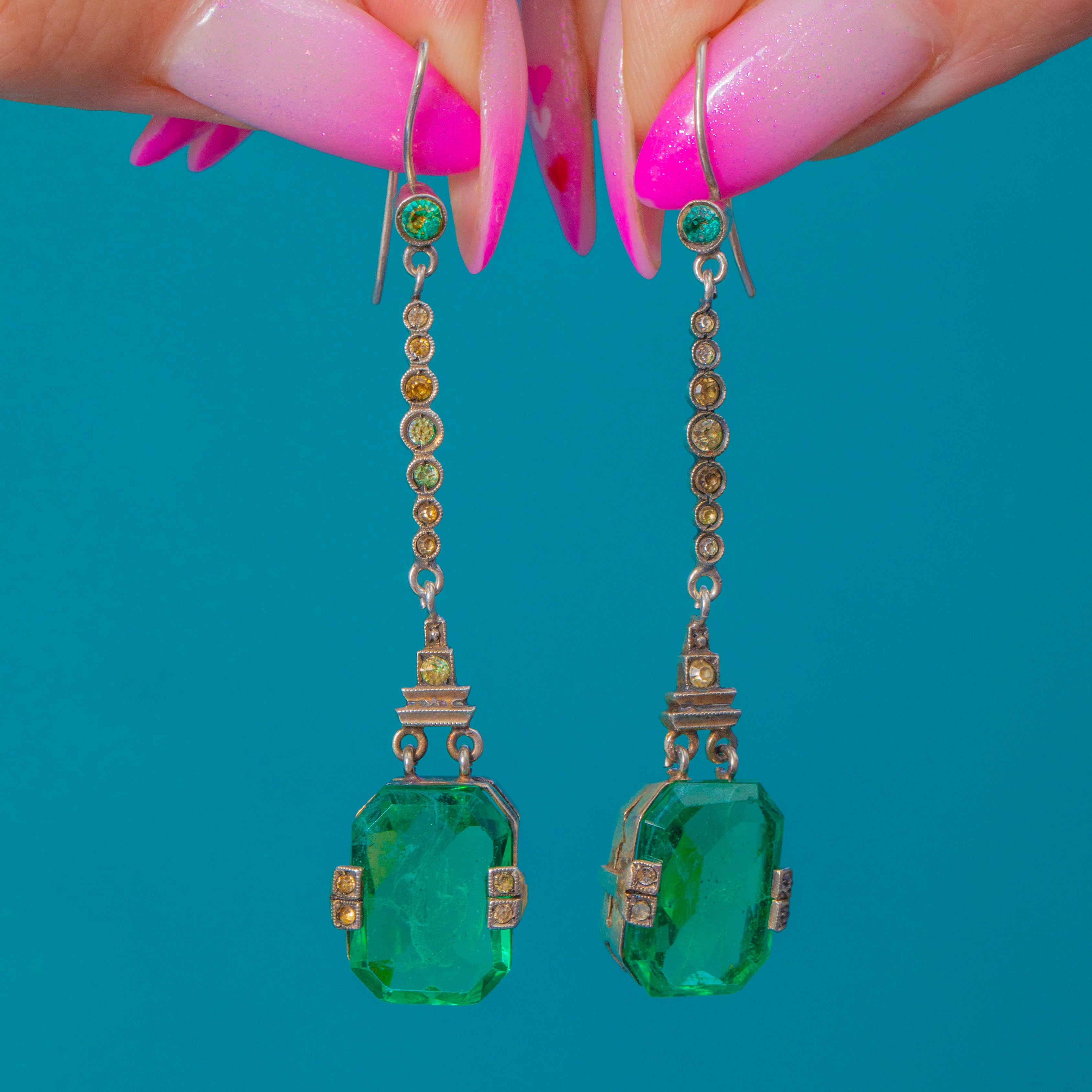 Architectural lines, glamorous length and a vivid pop of emerald green—these antique Art Deco green Paste earrings have it all!