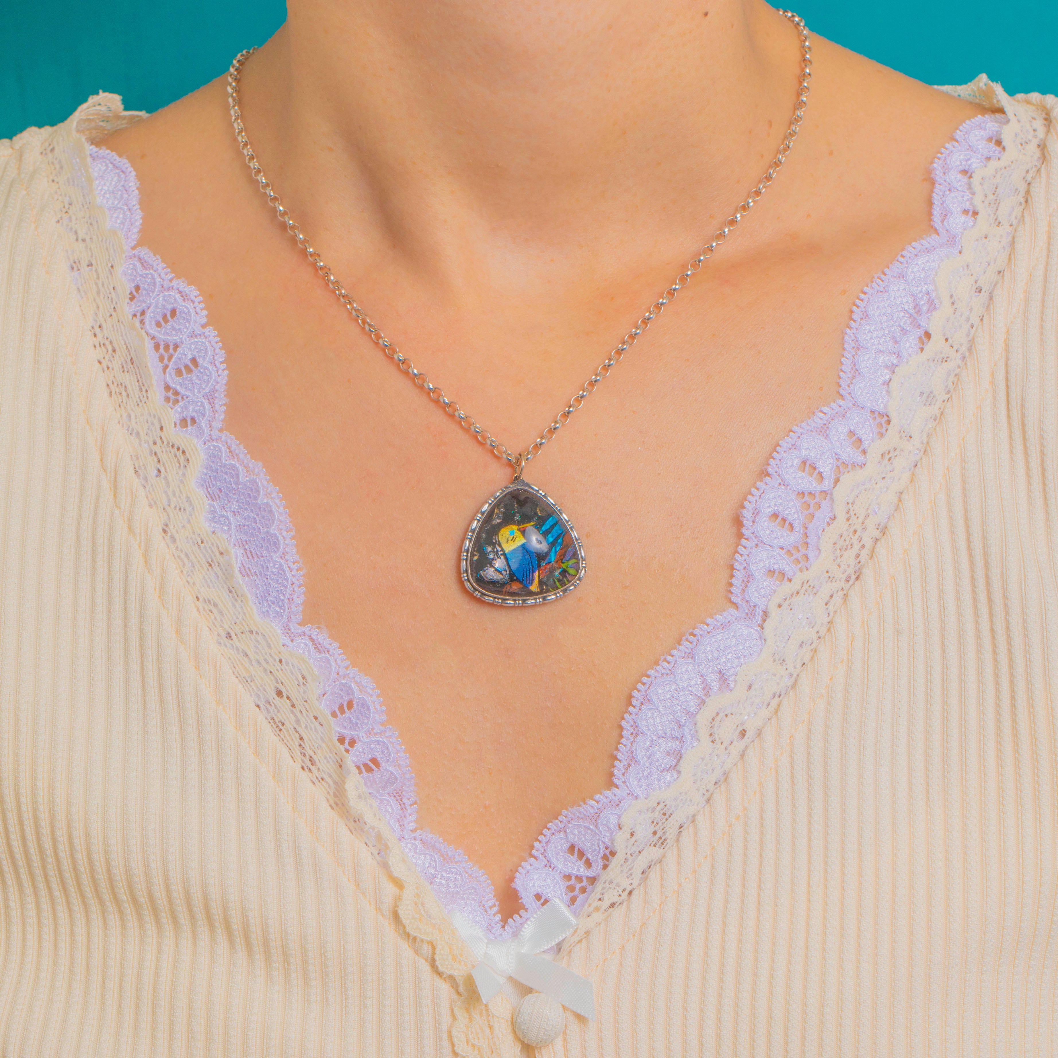A vibrant Art Deco butterfly wing pendant, its rounded triangular silhouette framing a vivid kookaburra motif that shimmers with tropical blues, teals and golden accents. The scene sits beneath a domed resin cover, all bordered by a pretty beaded Silver bezel for a softly sculpted finish.