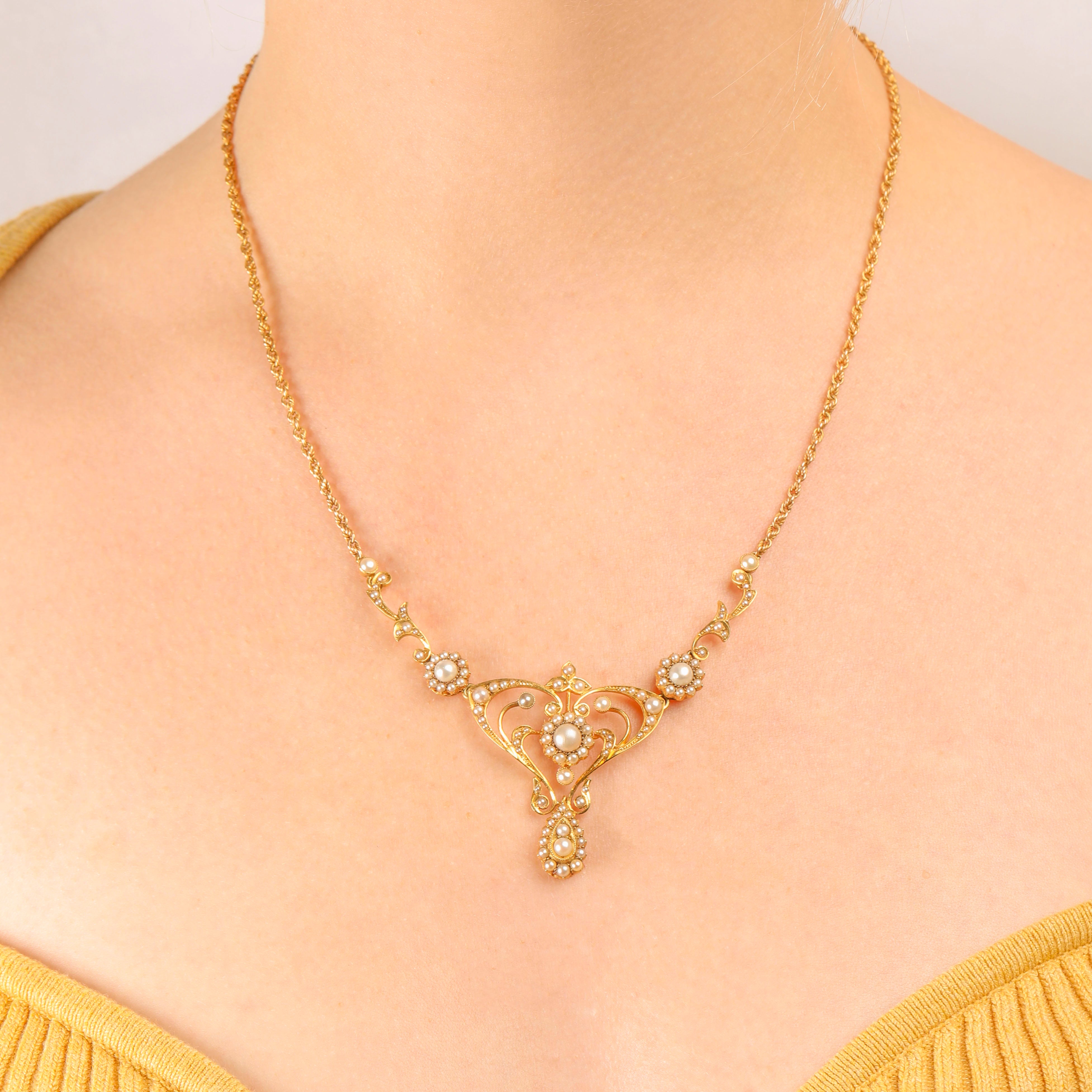 EXCELLENT. We are pleased to present this Art Nouveau 15ct Gold Pearl Lavalier necklace in excellent condition! Each Pearl is present and secure, with a wonderful white lustre that can't be missed. The Gold is richly saturated throughout, with no visible damage to note. Her lover's knot links are uniform and securely connected, fastened with a fully functioning bolt-ring to finish. We can't get enough of her!