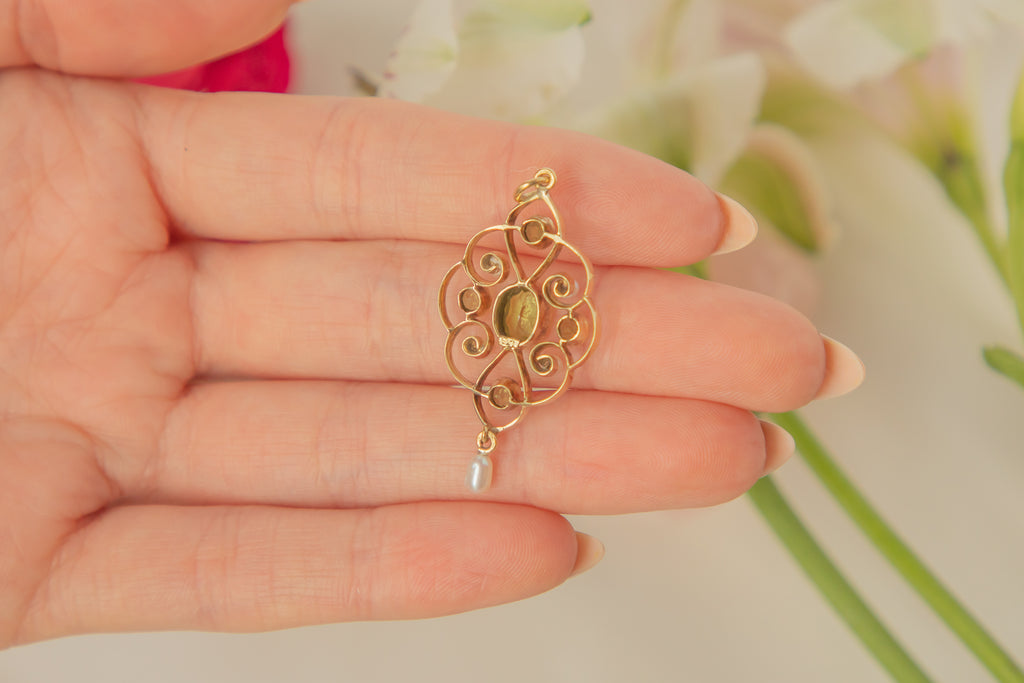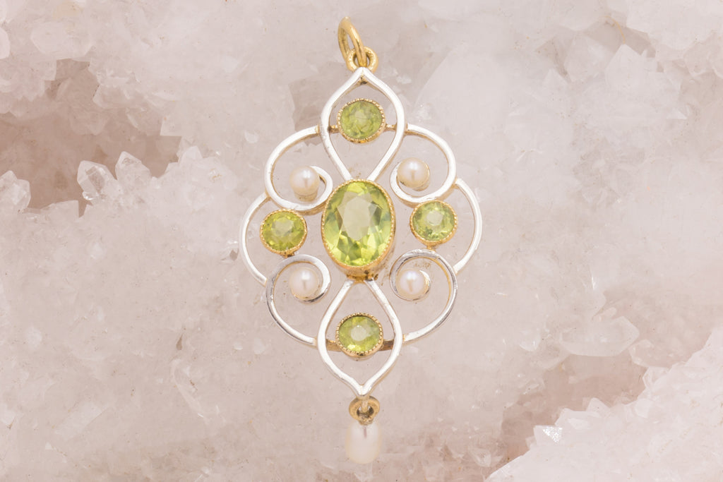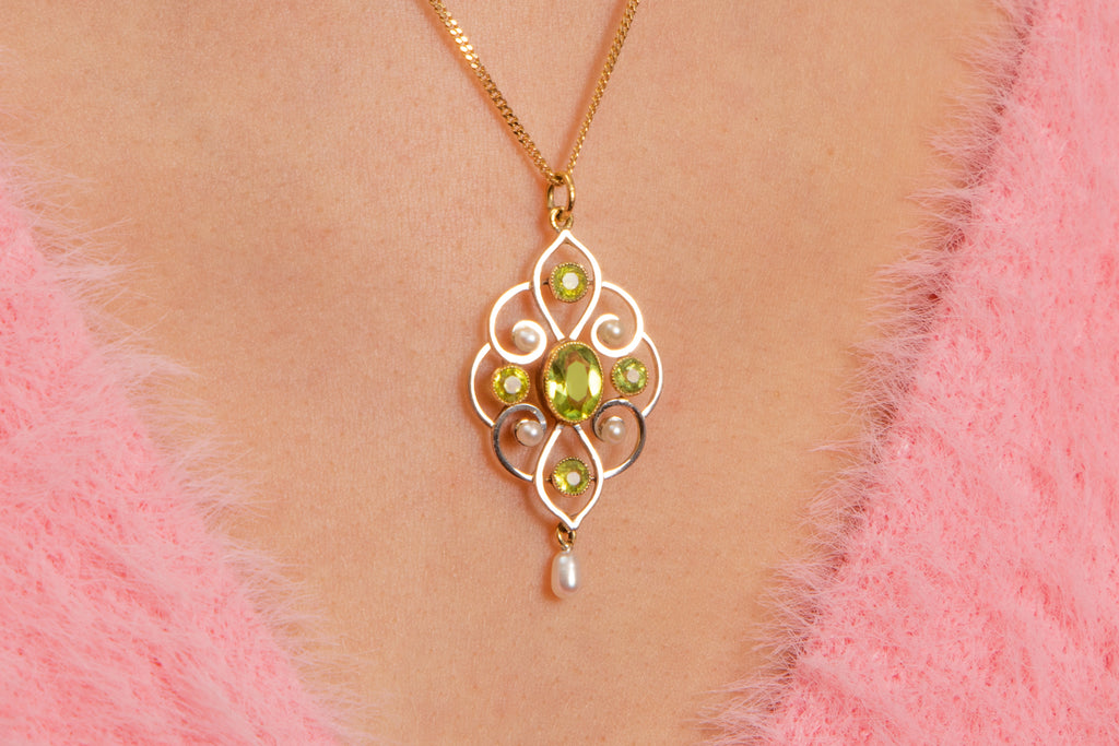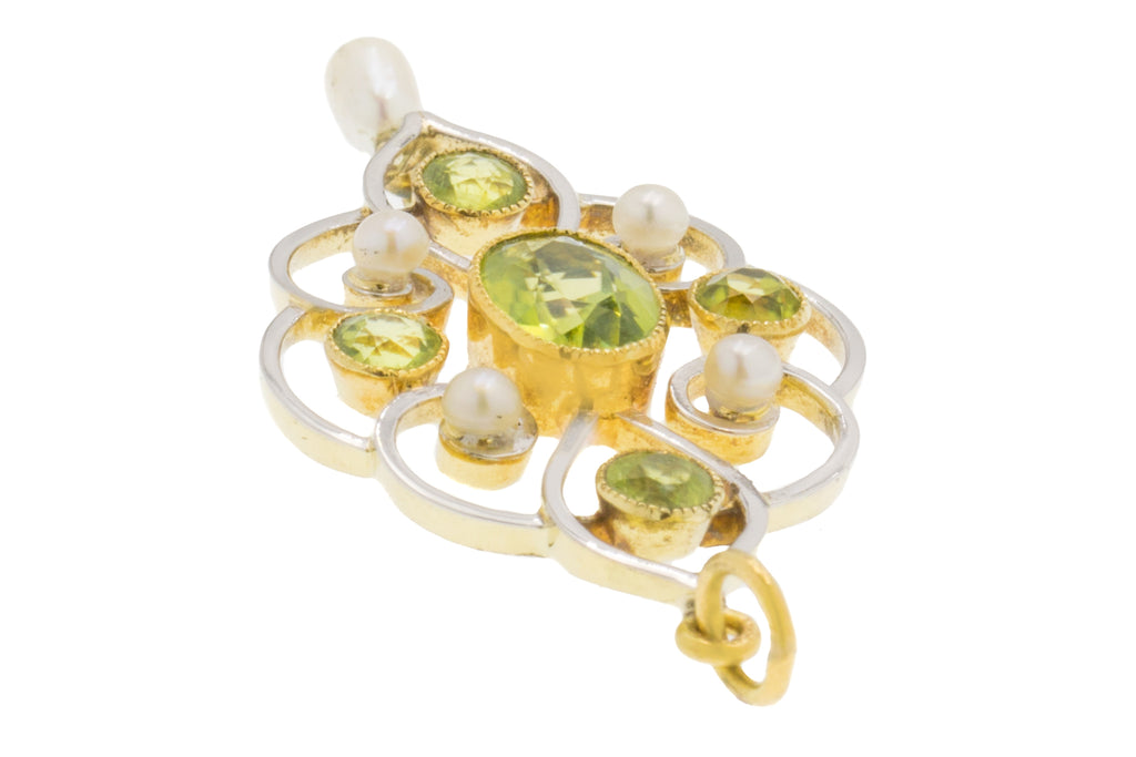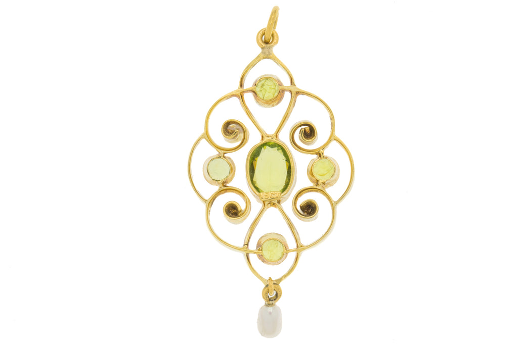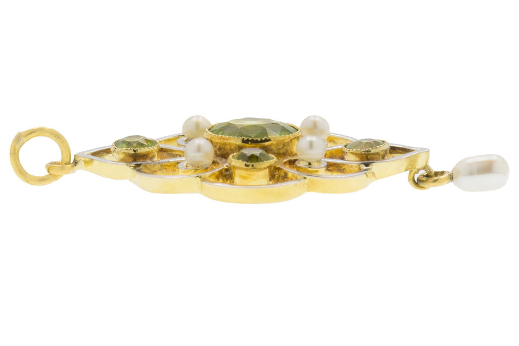 Art Nouveau 15ct Gold Pearl Peridot Drop Pendant, 1.00ct