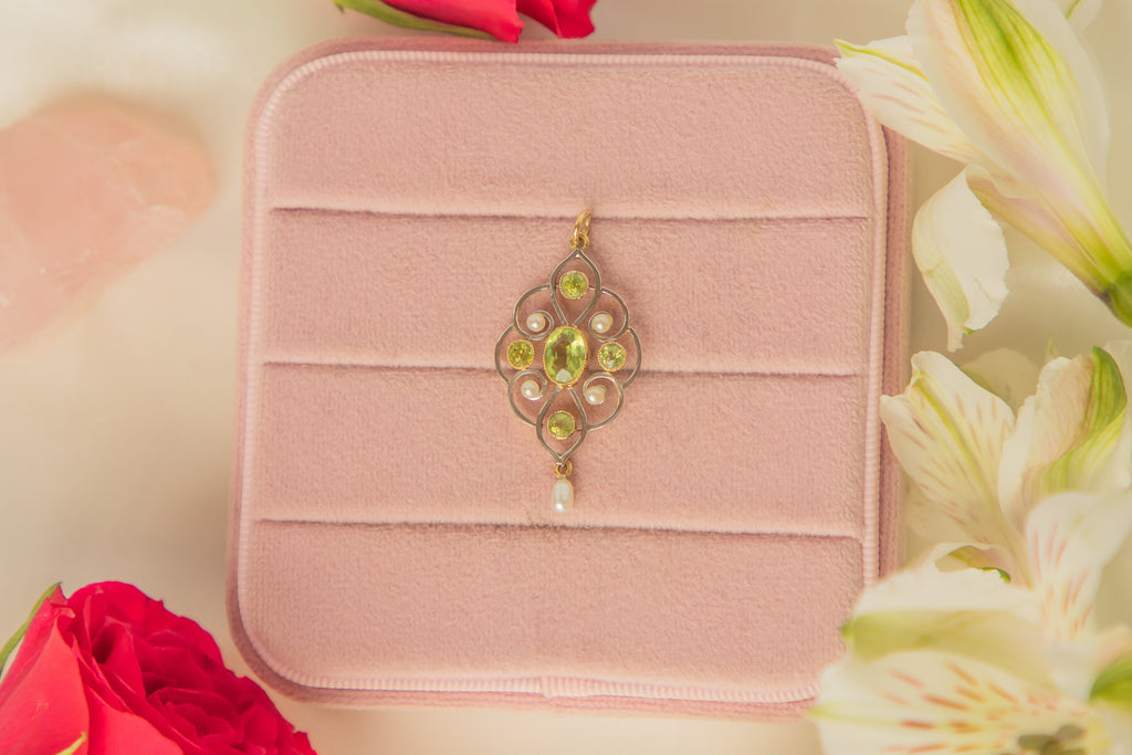 This Art Nouveau 15ct Gold Pearl Peridot Drop Pendant is a captivating piece that exudes elegance and sophistication! Crafted with meticulous attention to detail, this antique pendant features five vibrant Peridot flanked by four luminous pearls, placed with precision between her ornate body.