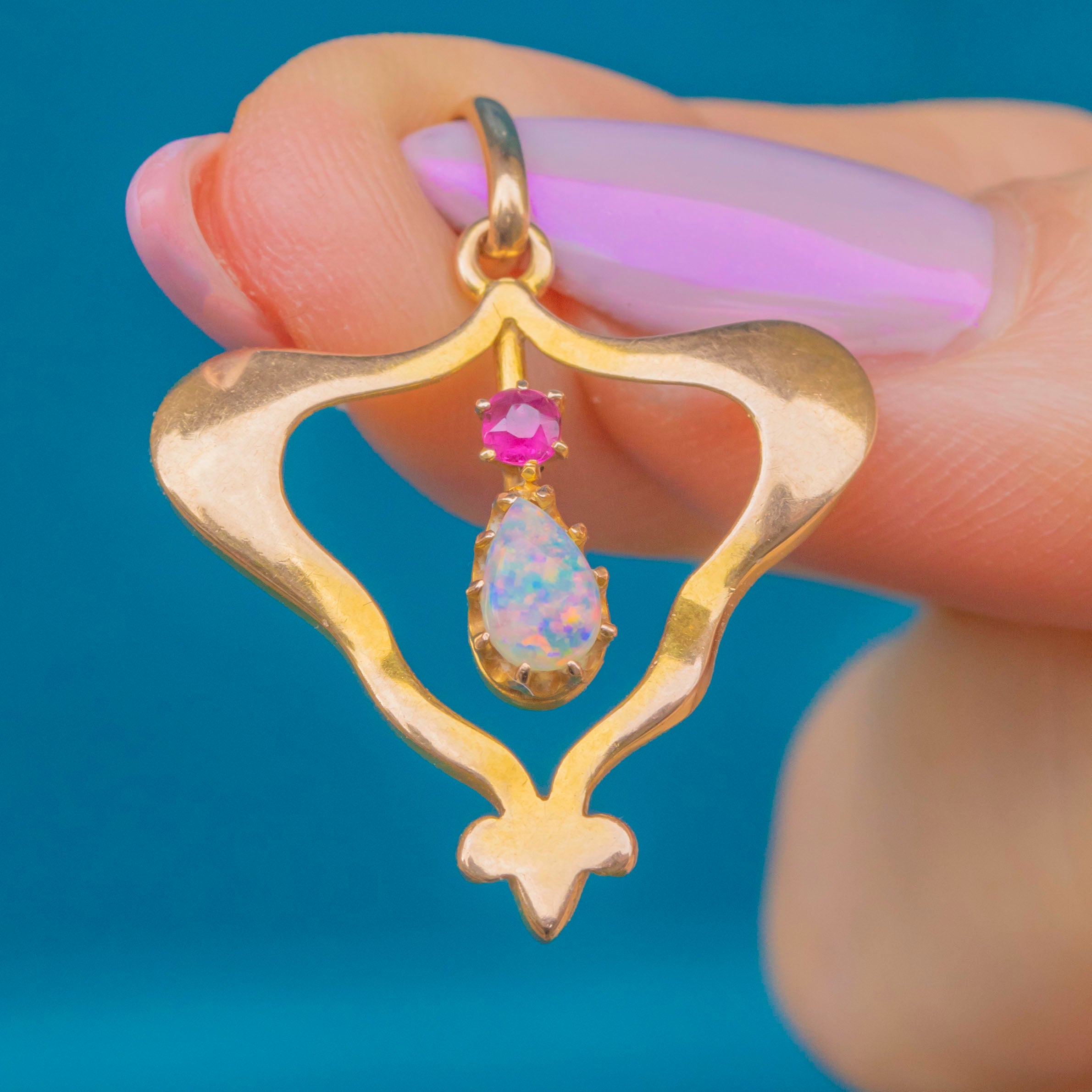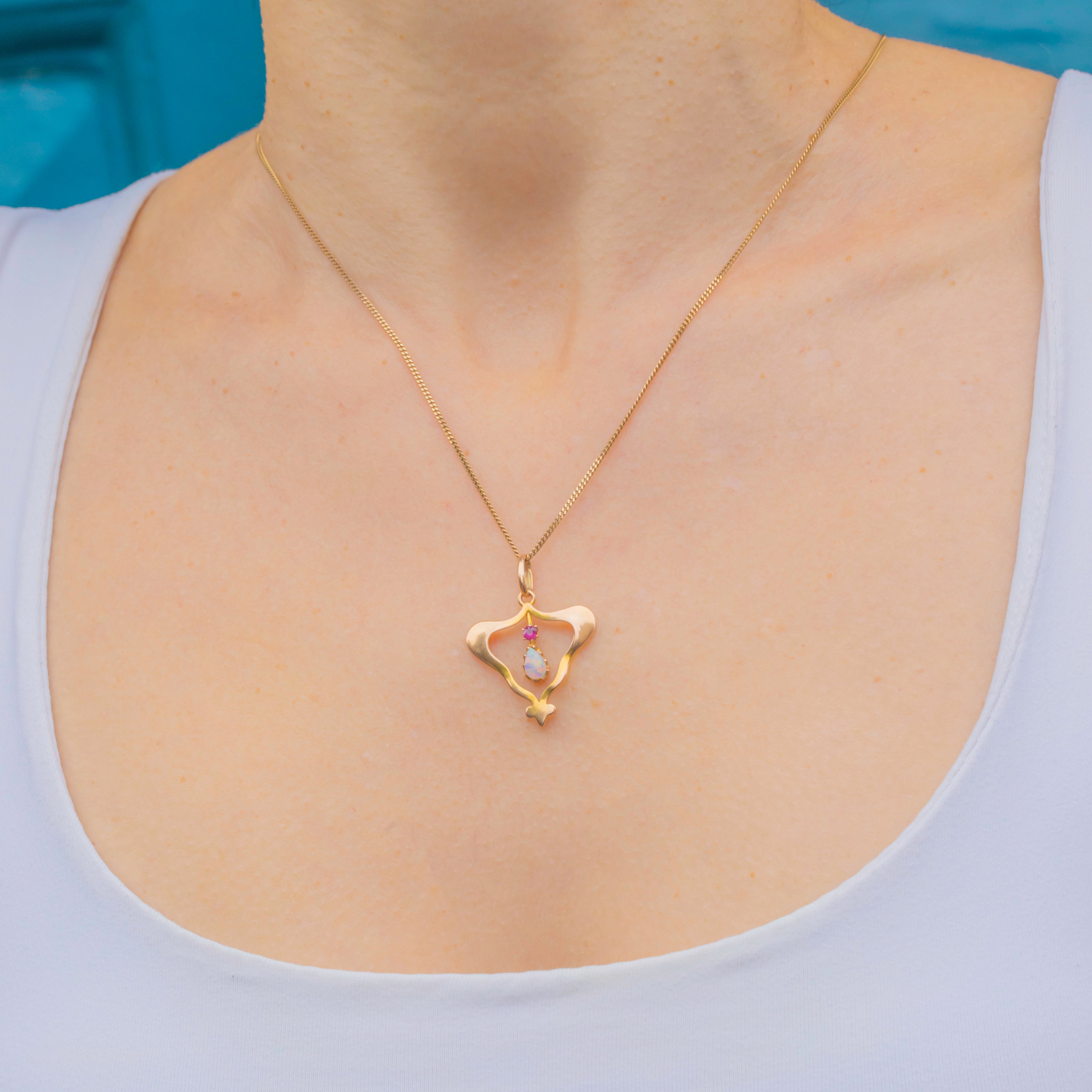 This elegant Art Nouveau pendant is crafted in 15ct Gold and set with a luminous Opal cabochon glowing with vibrant flashes of green, blue and orange. Above it sits a bright 2.5mm natural Ruby, adding a perfect touch of colour contrast and warmth.
