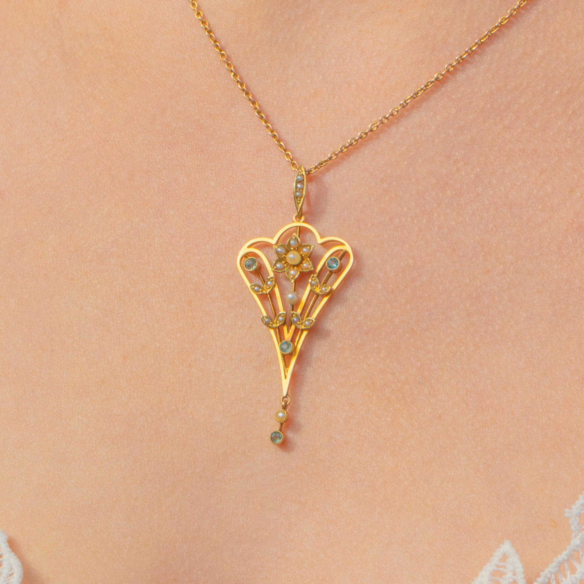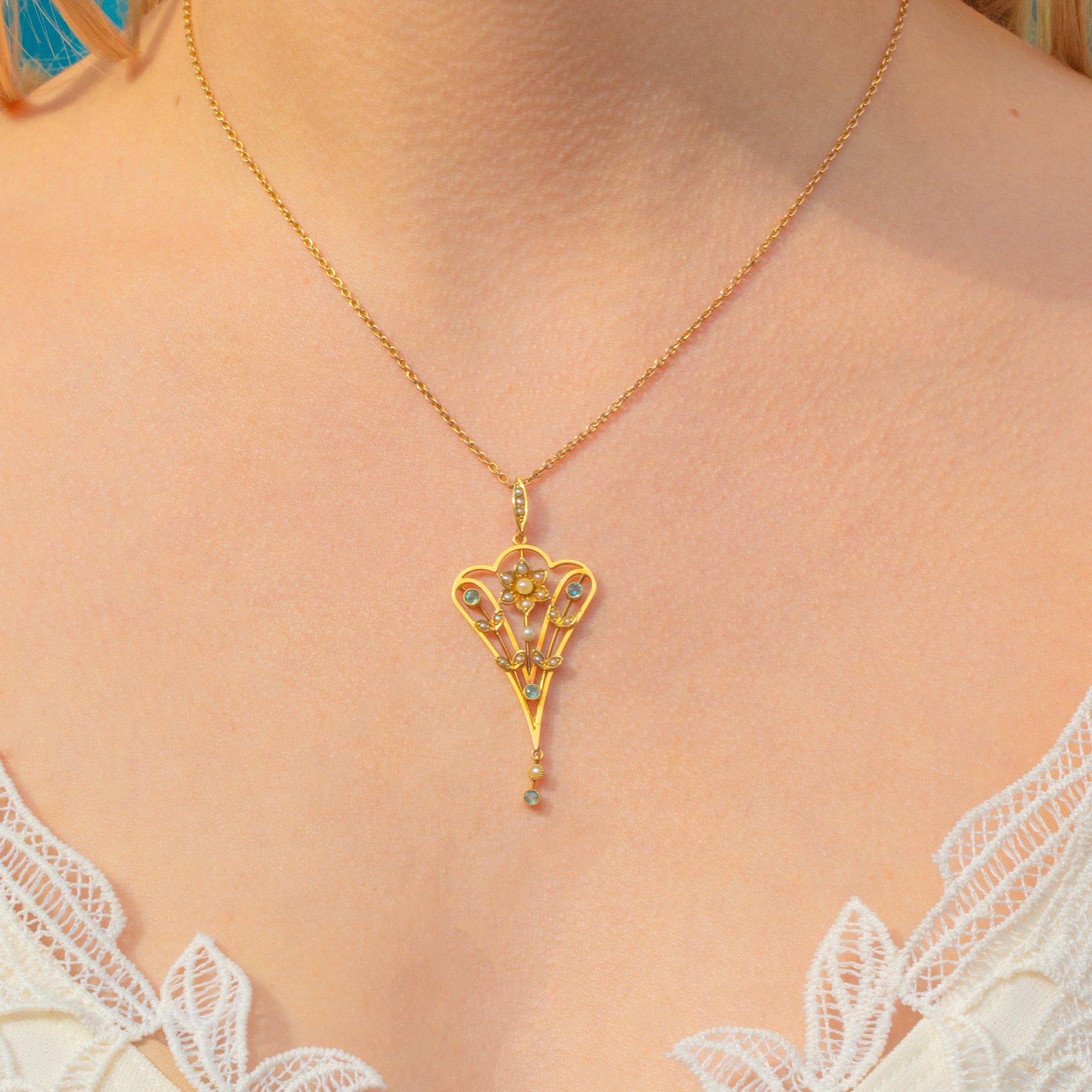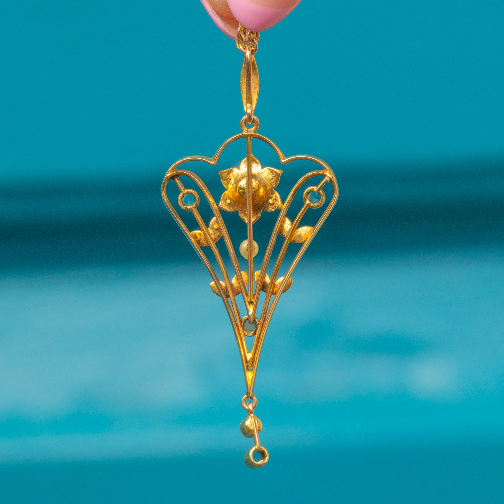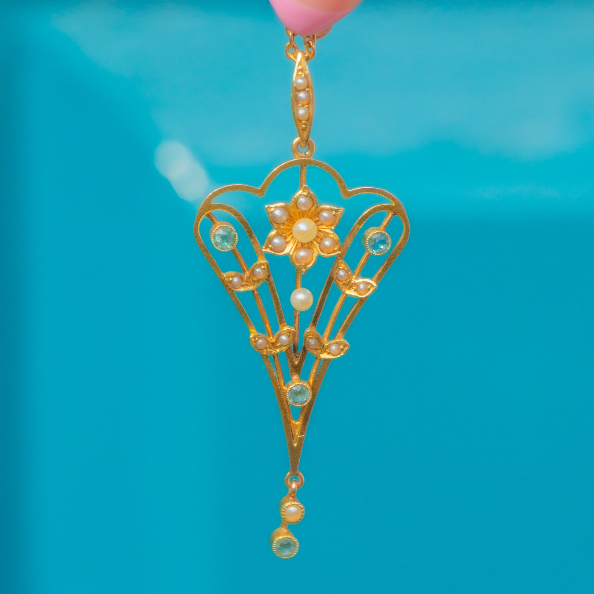Art Nouveau 18ct Gold Aquamarine Pearl Drop Pendant