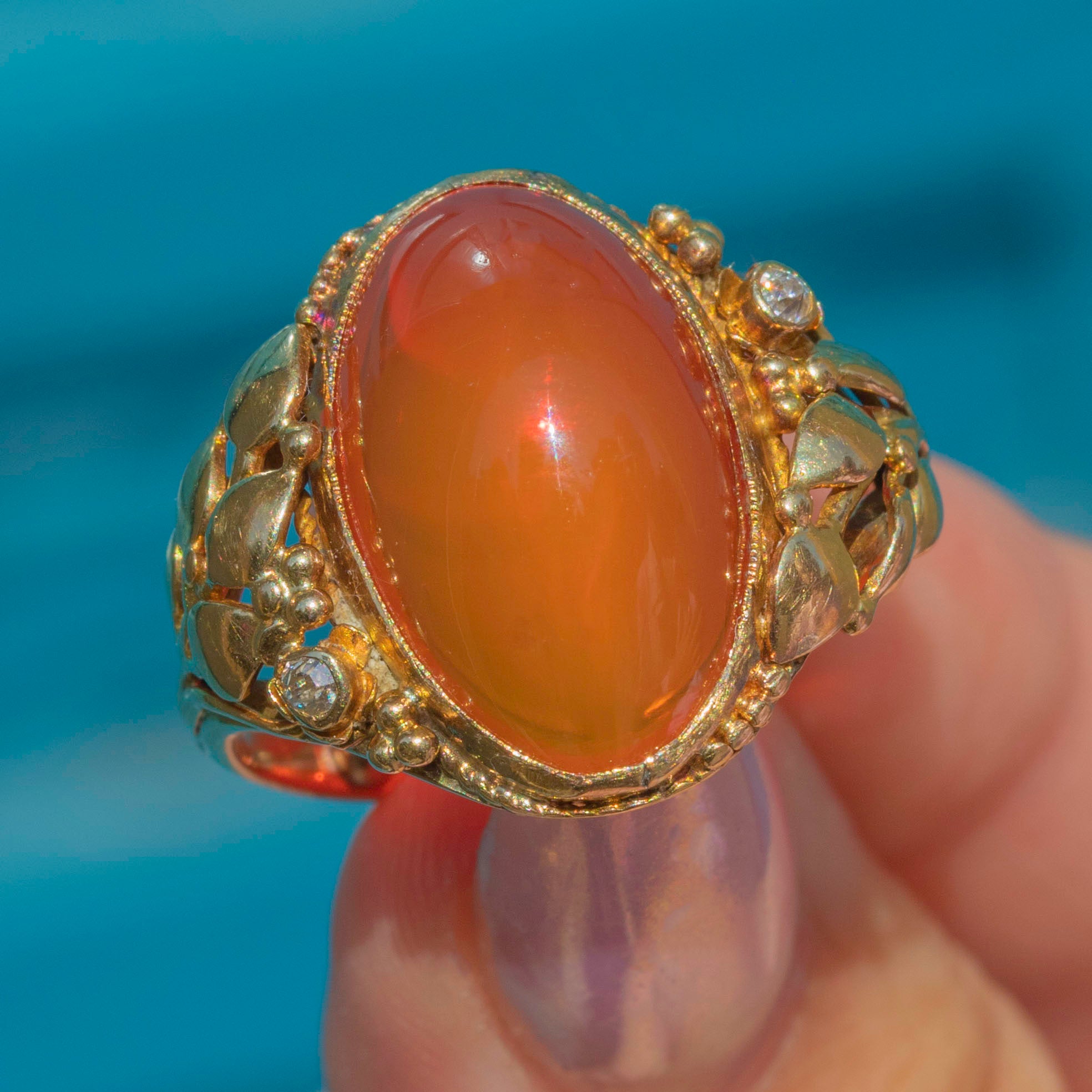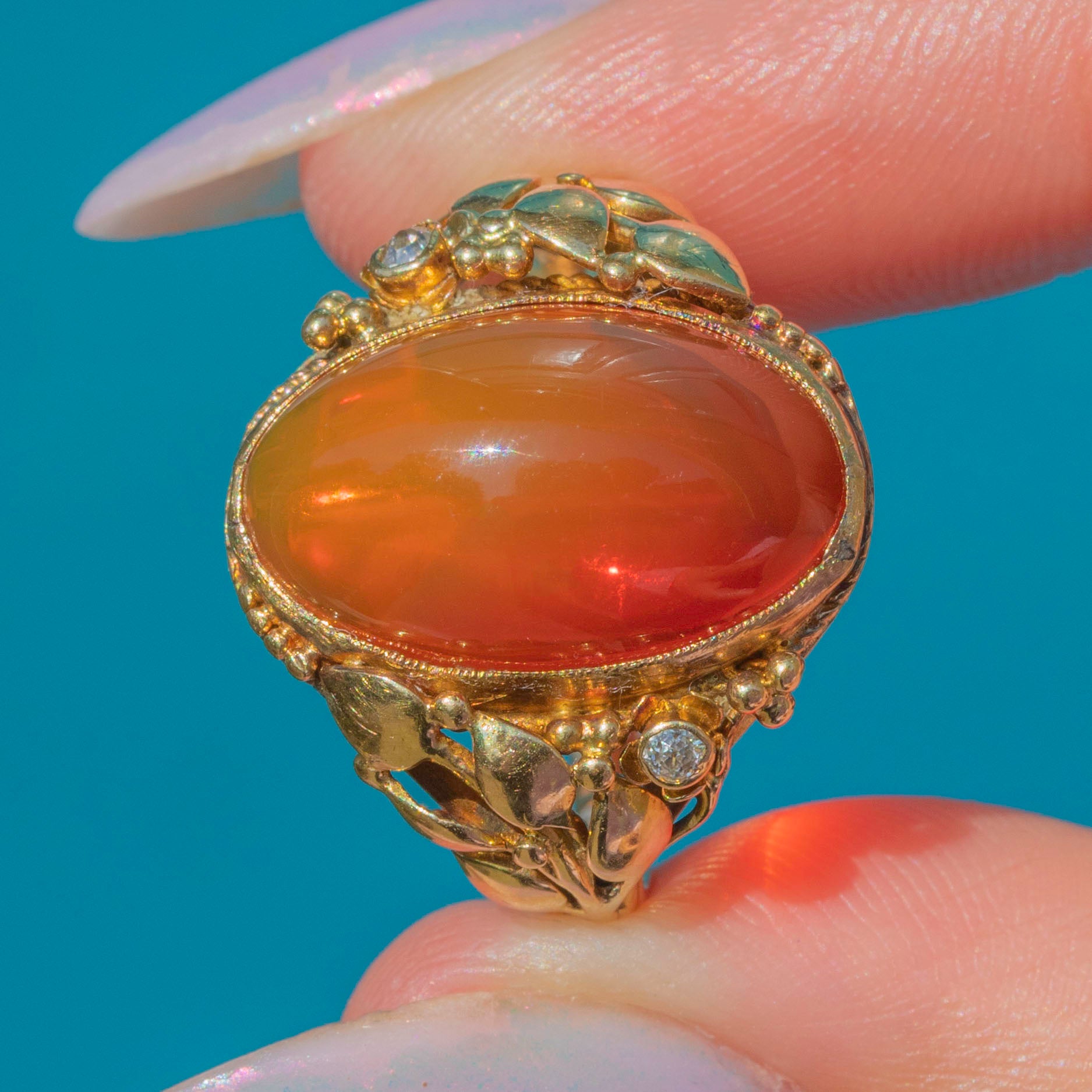 Art Nouveau 18ct Gold Fire Opal Cabochon Diamond Ring, 5.60ct Natural Solid Fire Opal