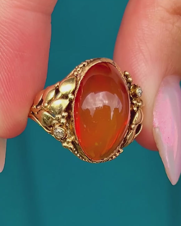 EXCELLENT: The 5.60ct Fire Opal cabochon is radiant, with only the most subtle surface wear visible under a magnifying loupe. It is set securely in its bezel, as are the surrounding Diamonds. The 18ct Gold is bright and buttery and with a secure band, this antique ring can be worn with utmost confidence!