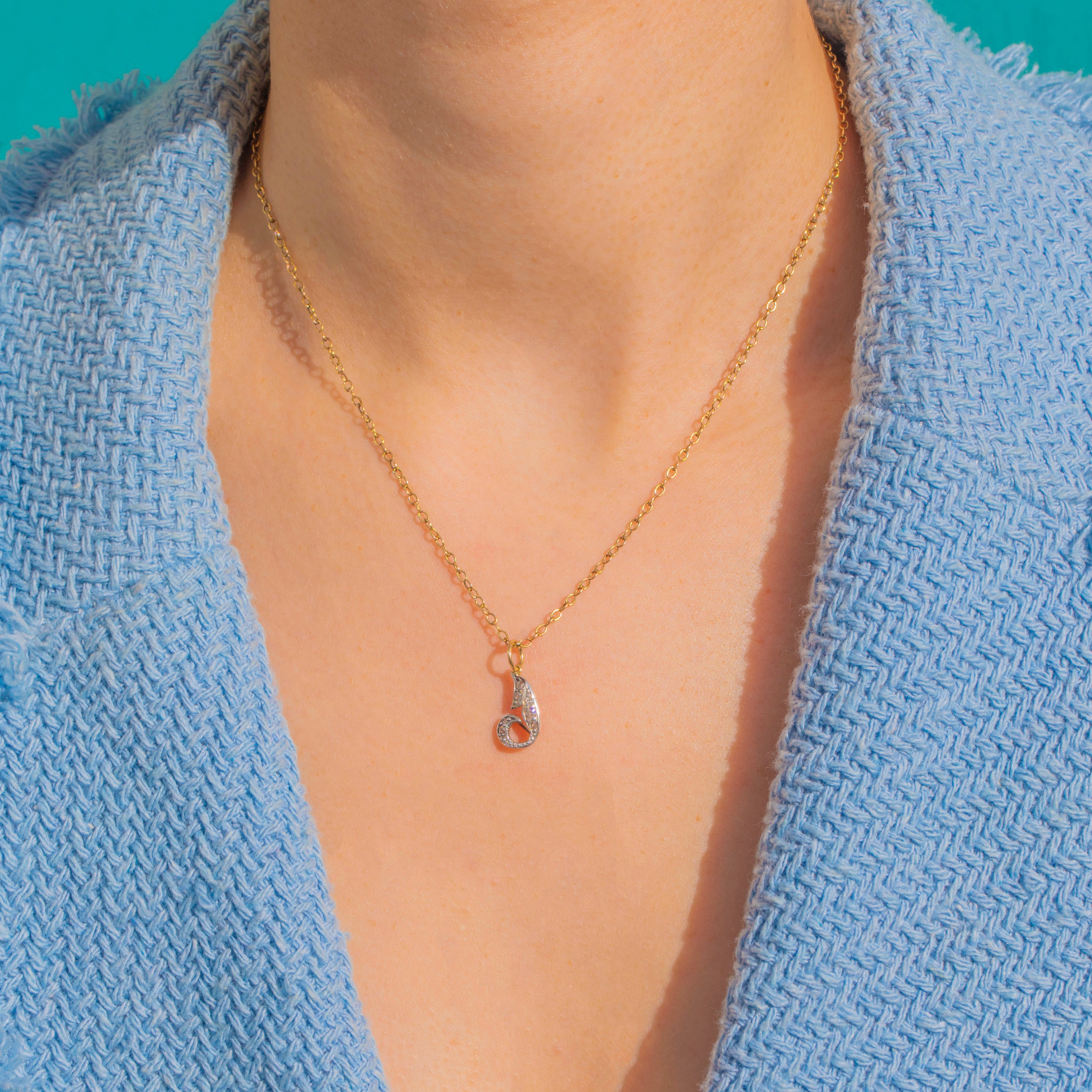 Sensuous Art Nouveau lines meet delicate sparkle in this petite Diamond charm. Shaped as a softly curling foliate scroll, its front is dotted with tiny antique Diamonds that catch the light with a refined, twinkling glow. The elegant two-tone palette of 18ct Gold and Silver enhances the movement of the design, lending depth and contrast to every curve.