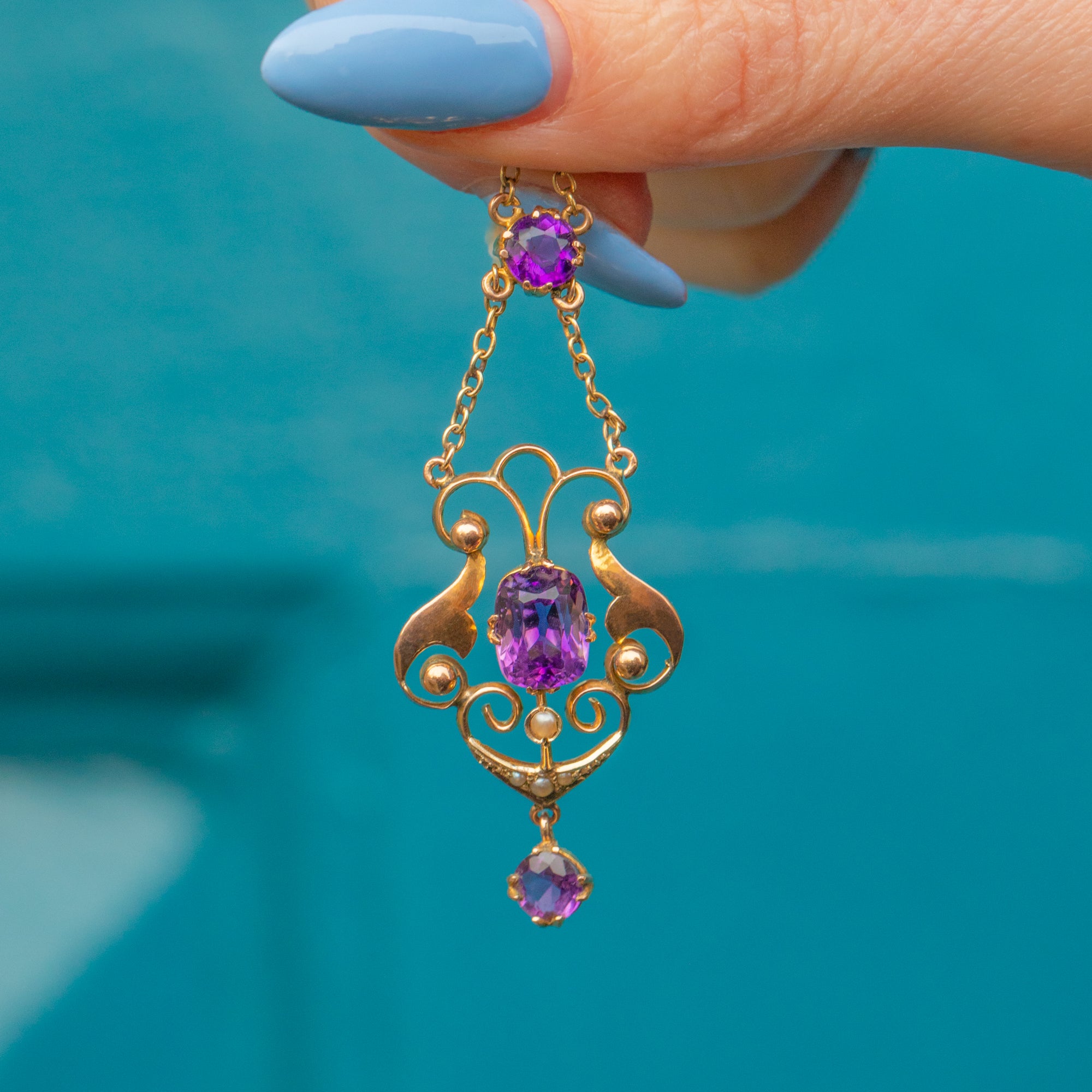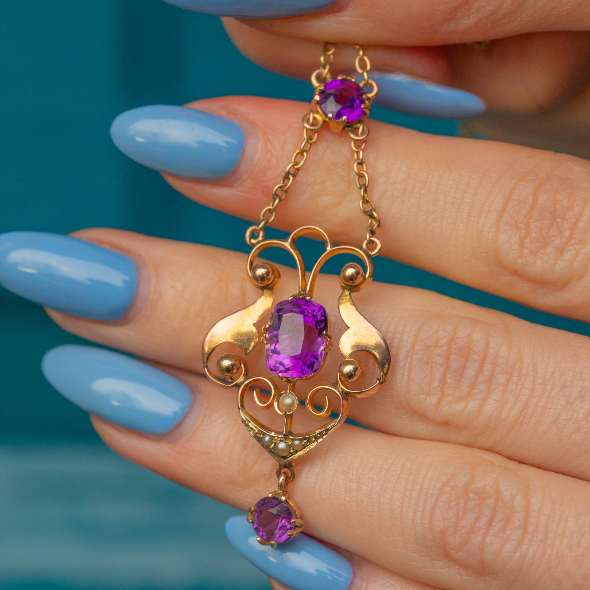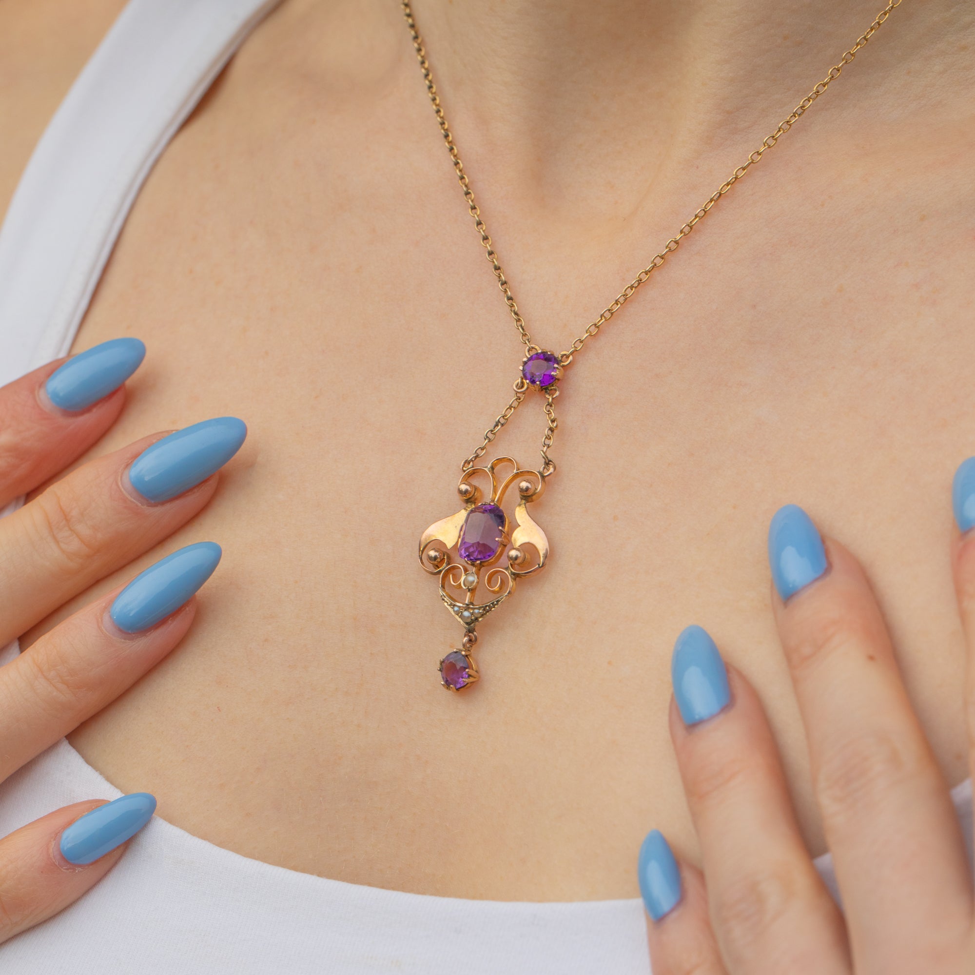 Crafted from warm 9ct Gold, this necklace suspends a curvaceous drop with three vibrant Amethysts, each radiating gorgeous deep lavender hues. She is adorned by delicate graduating seed Pearls, with their iridescence marrying the warmth their settings and chain.