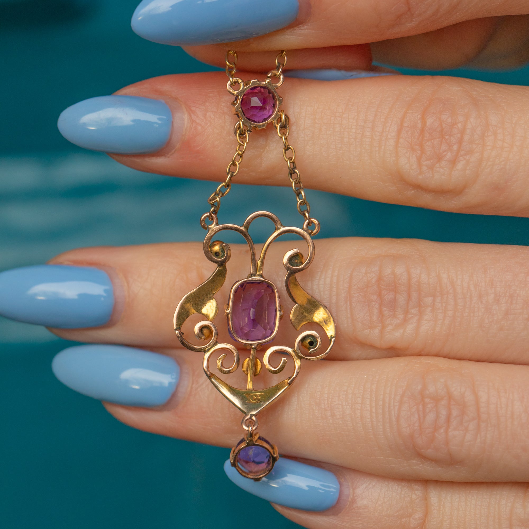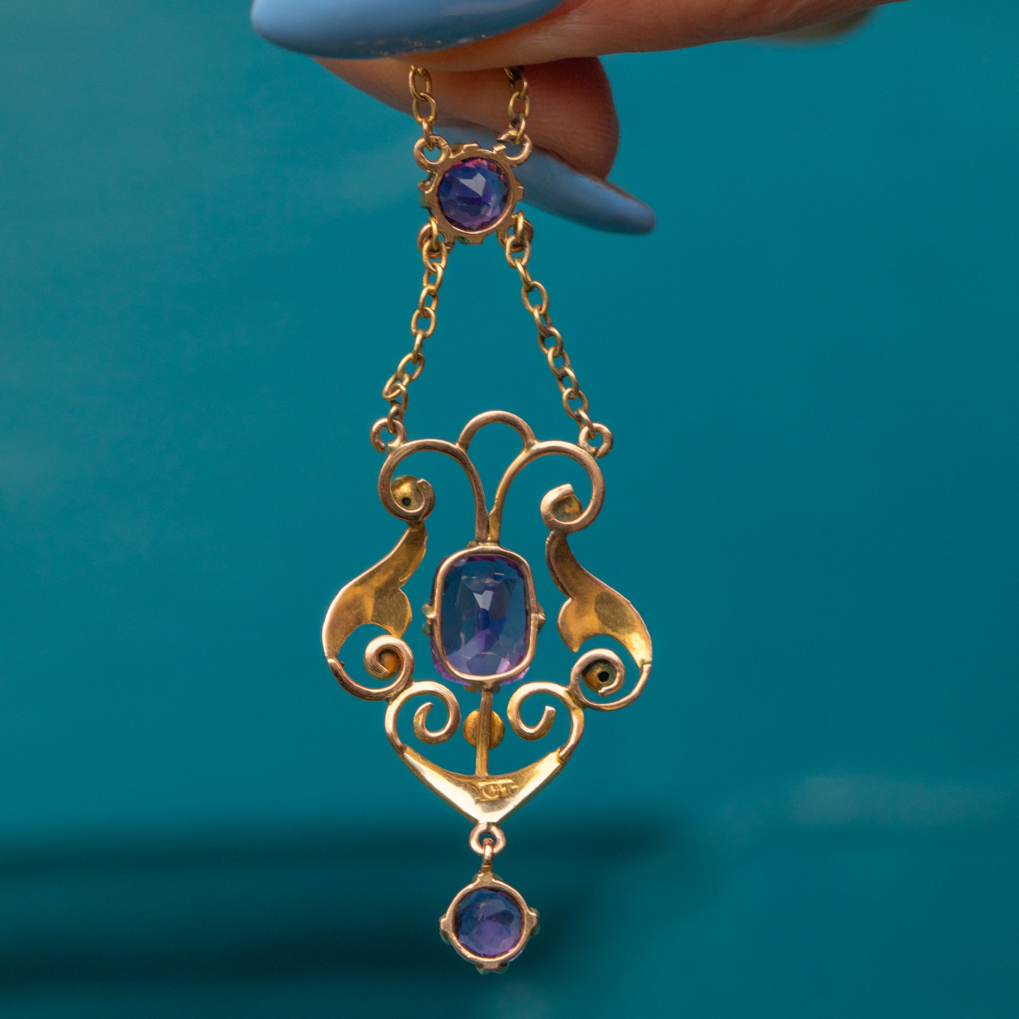 VERY GOOD-EXCELLENT. This Art Nouveau 9ct Gold Amethyst Pearl drop necklace is in great condition. Each gemstone sits securely within its setting, and suspends beautifully from her 9ct Gold chain. The Amethysts have crisp facets, with only a few minor scuffs and scratches commensurate with age. The Gold is buttery with wonderful reflective qualities and the chain and clasp are securely affixed allowing you to enjoy its splendour for years to come!