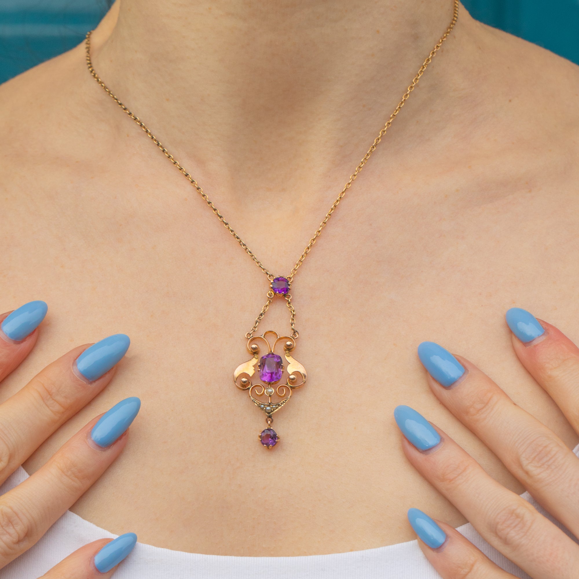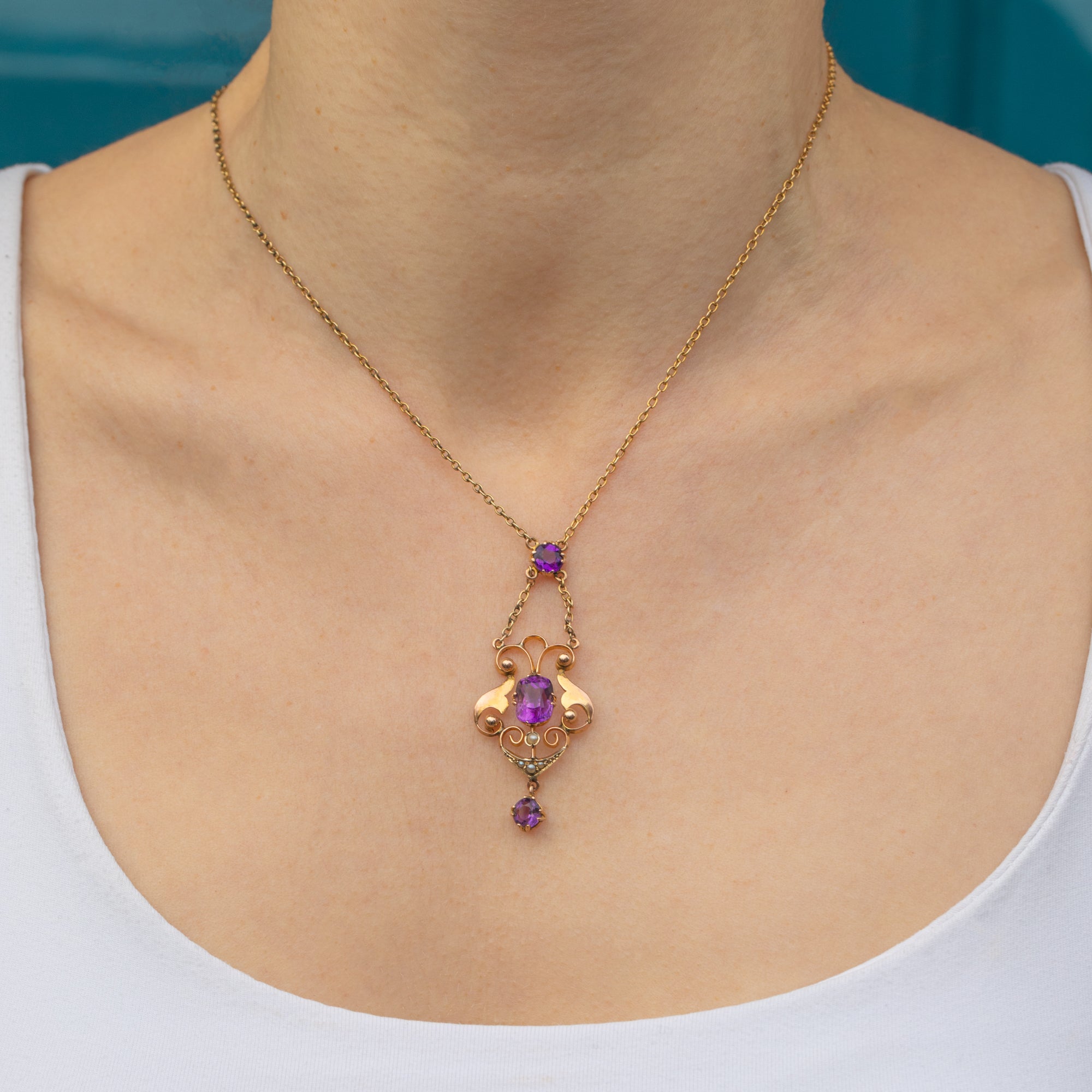 This Art Nouveau 9ct Gold Amethyst Pearl drop necklace is a wonderfully elegant piece to add to your collection.
