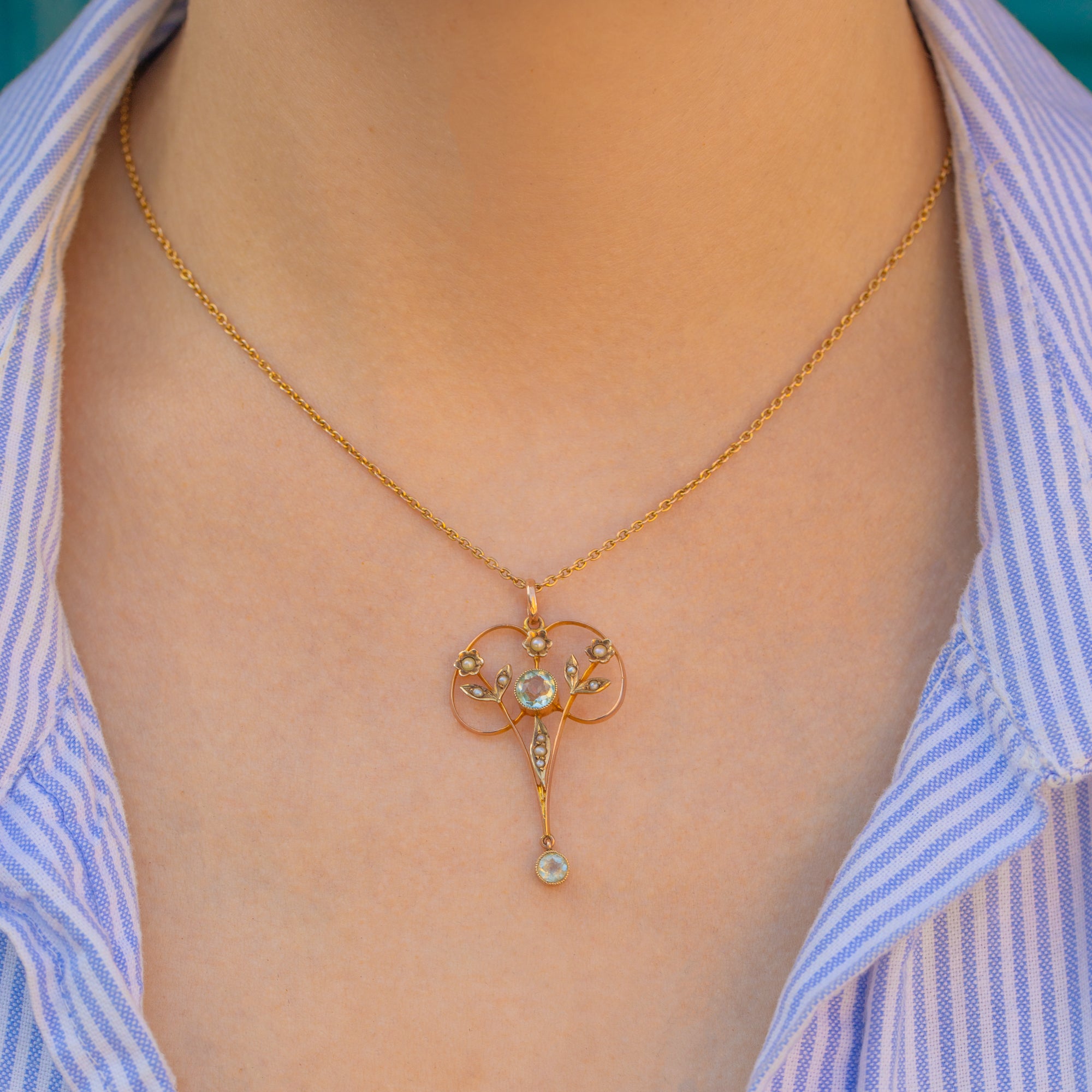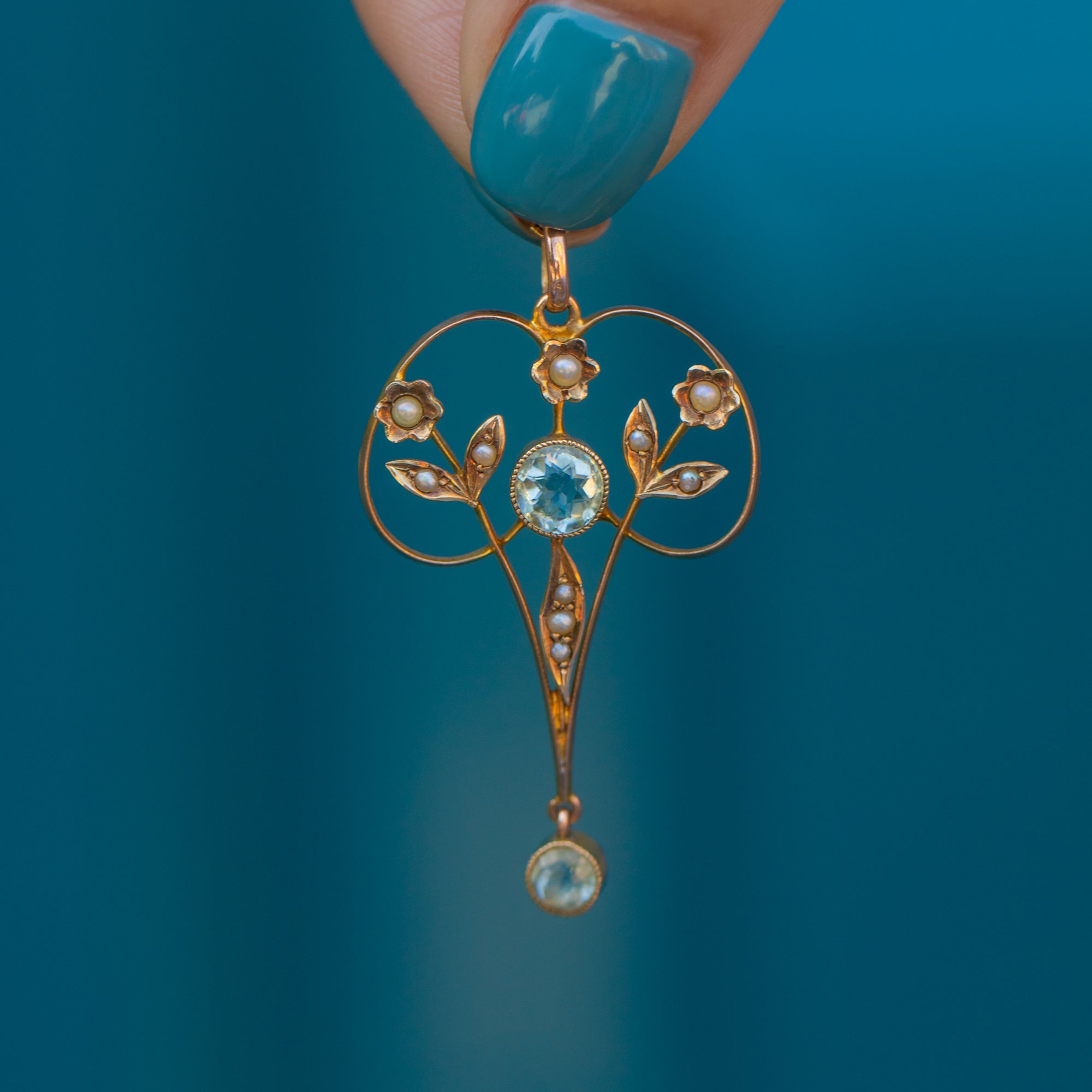 Art Nouveau 9ct Gold Aquamarine Pearl Lavalier Pendant, 0.95ct