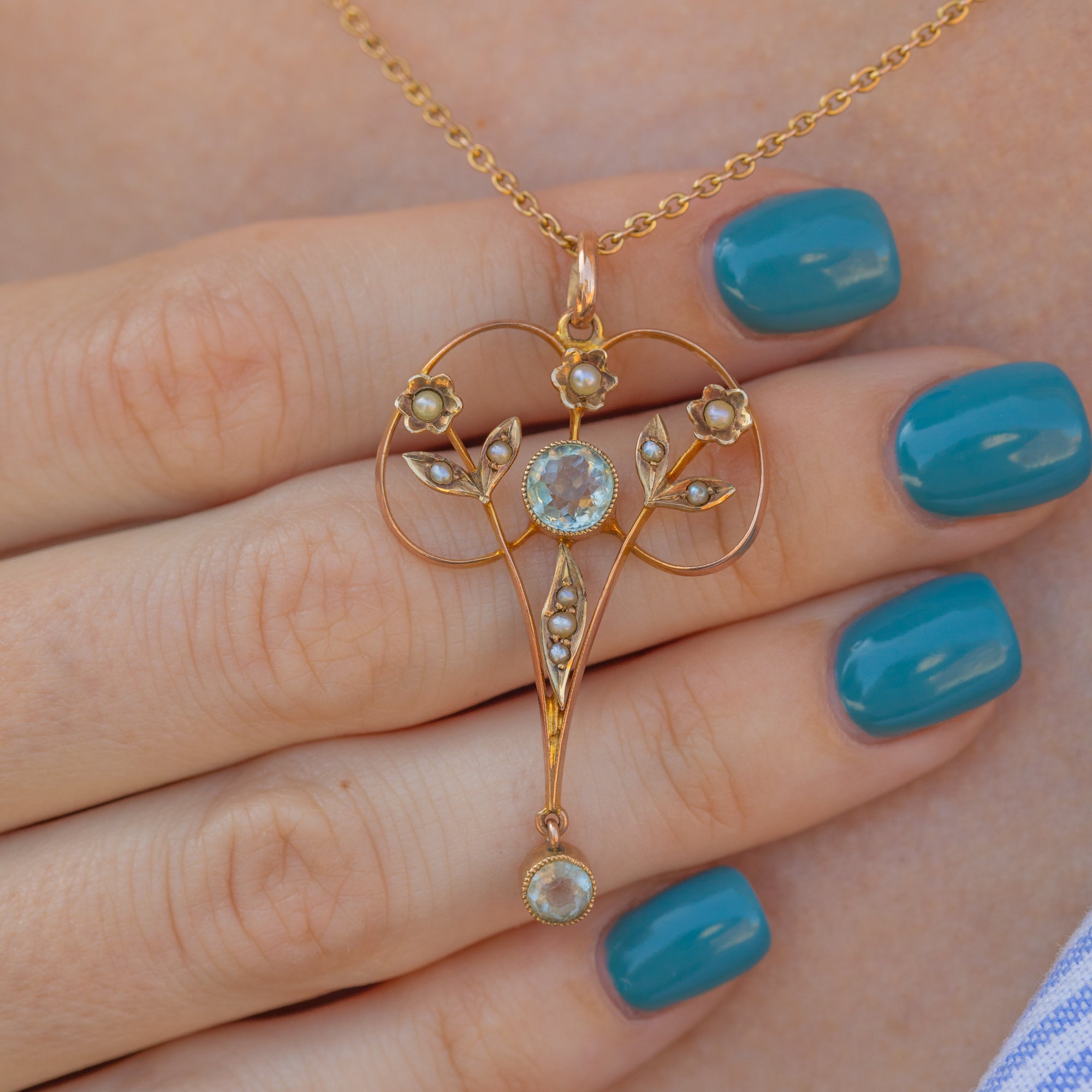 This exquisite Art Nouveau 9ct Gold Aquamarine Pearl Lavalier pendant is a captivating blend of elegance and charm. Crafted during the illustrious Art Nouveau era, this pendant is a testament to the refined craftsmanship of the time. A central icy Aquamarine is encompassed by three Gold budding flowers, each one adorning shimmering Pearls. She is enchanting us at every turn!