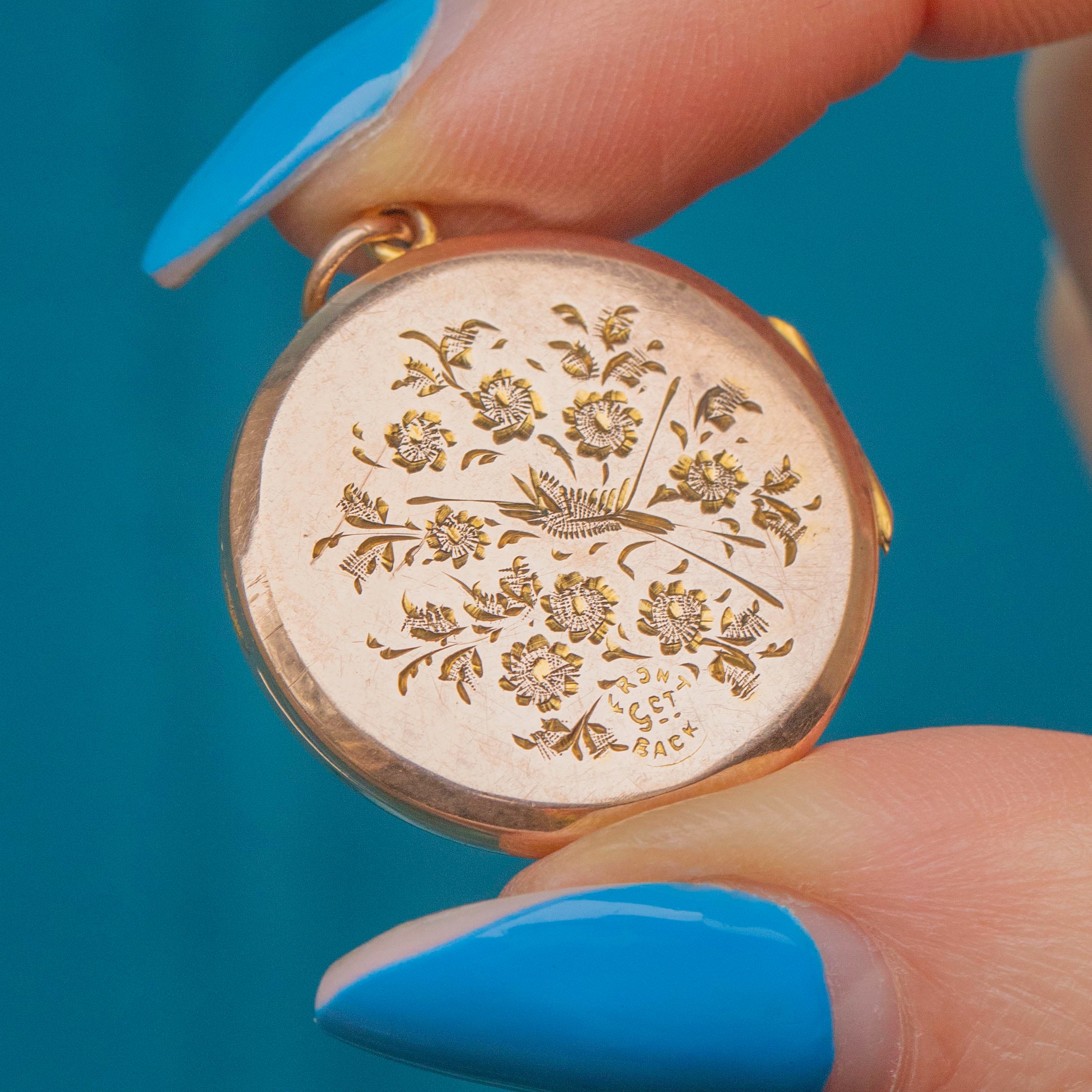 VERY GOOD-EXCELLENT. This Art Nouveau 9ct Gold bouquet of flowers round locket is in lovely antique condition! The Gold has an even, buttery hue throughout and the engraved details have remained crisp on both sides. The locket doors are smooth and free from dings with only a few minor scratches inside the locket, likely from a previous purity testing. The doors close firmly promising many more years of wear and enjoyment!