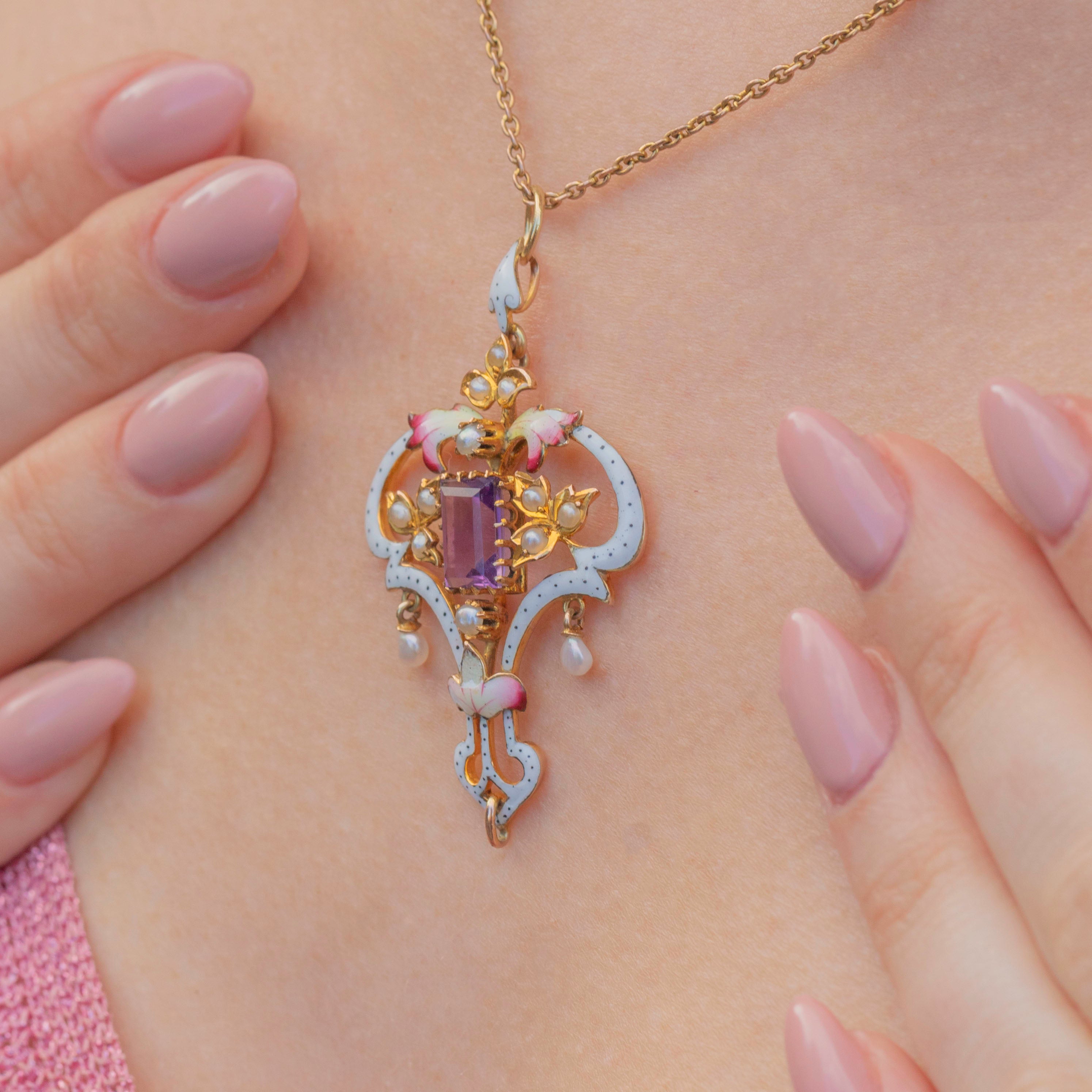 Straight out of a fairytale, this 9ct Gold Art Nouveau Enamel Amethyst & Pearl Lavalier pendant is home to a rectangular-cut lavender-hued Amethyst, Seed Pearls and glossy Enamel.