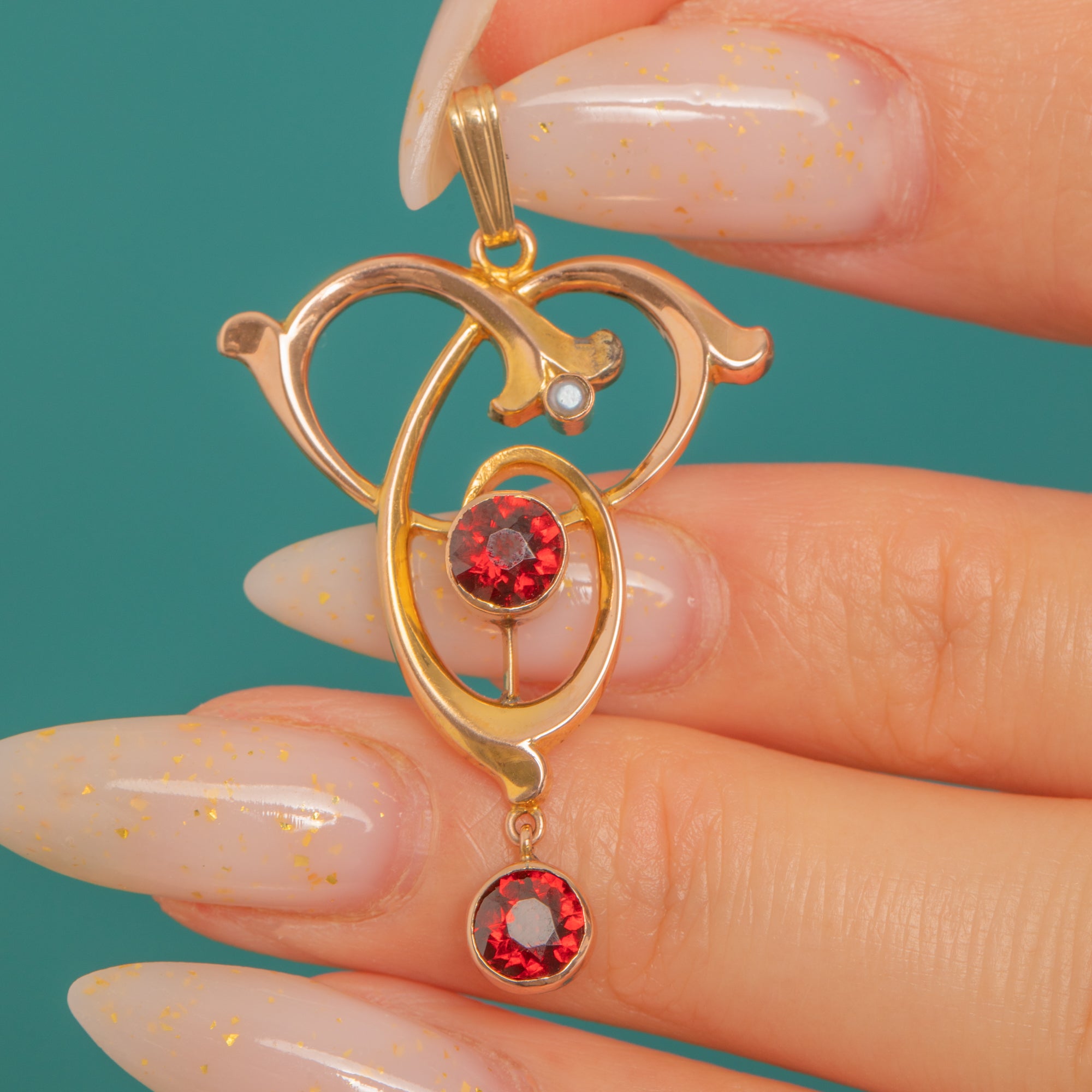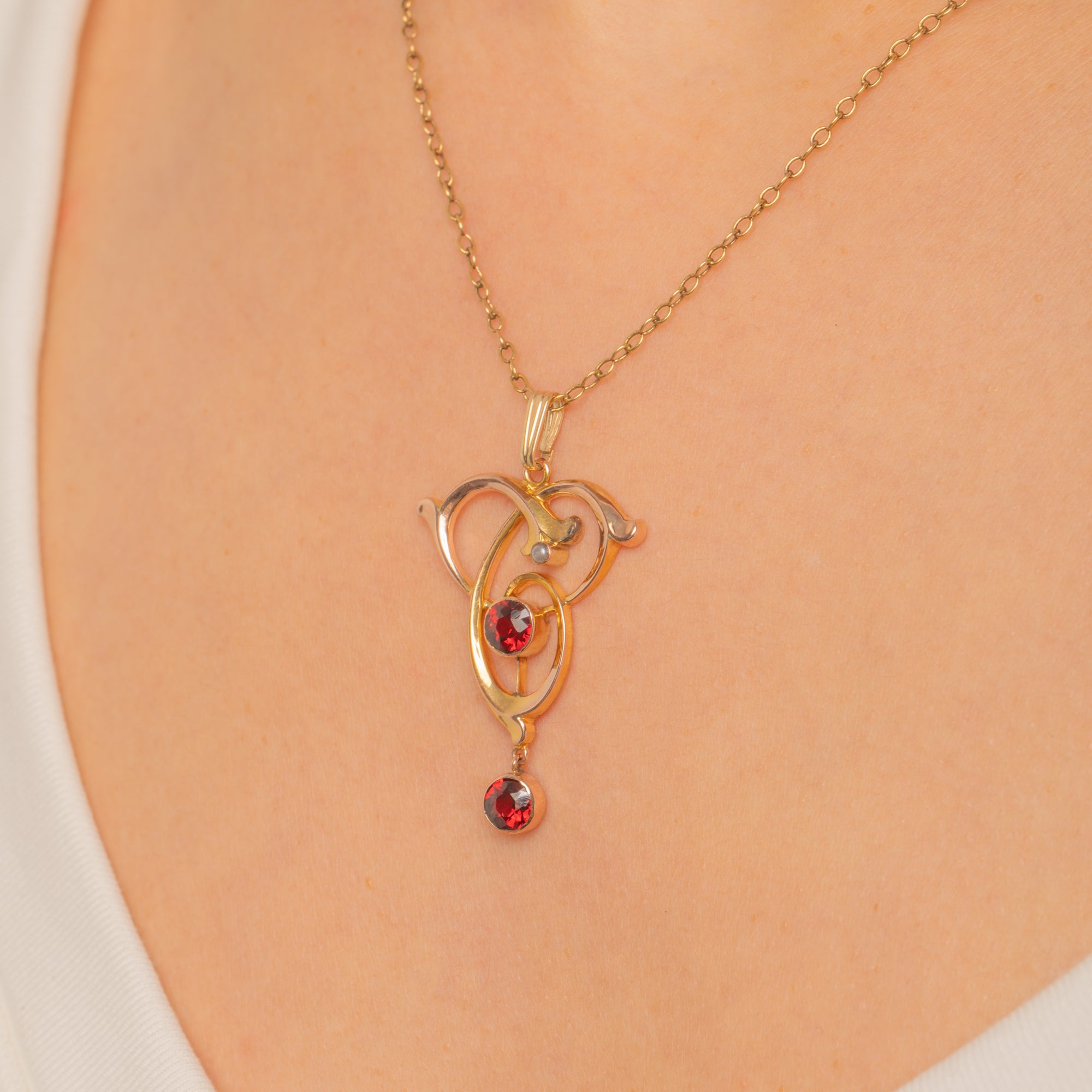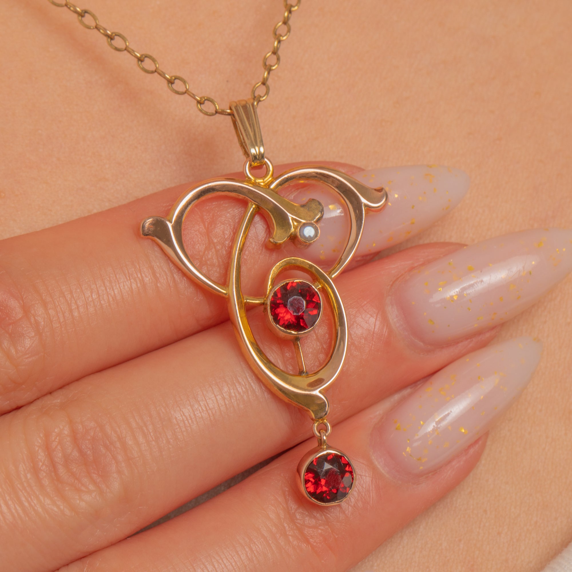 A graceful Art Nouveau pendant in 9ct Gold, designed with flowing, ribbon-like curves that capture the era’s love of organic line and movement. At its centre sits a vivid Garnet, with a second Garnet drop dancing below for that perfect touch of antique drama.