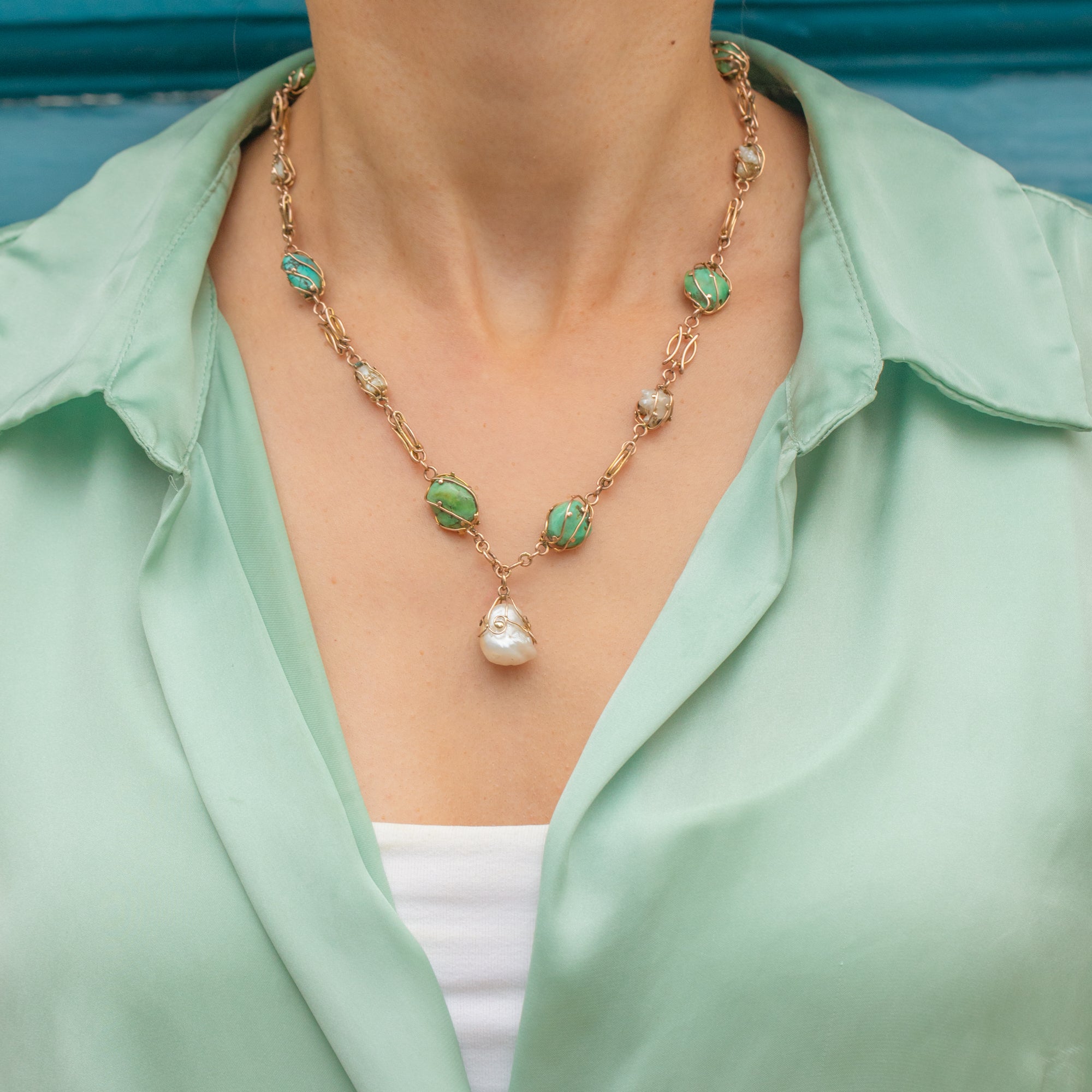Art Nouveau 9ct Gold Matrix Turquoise and Baroque Pearl Necklace