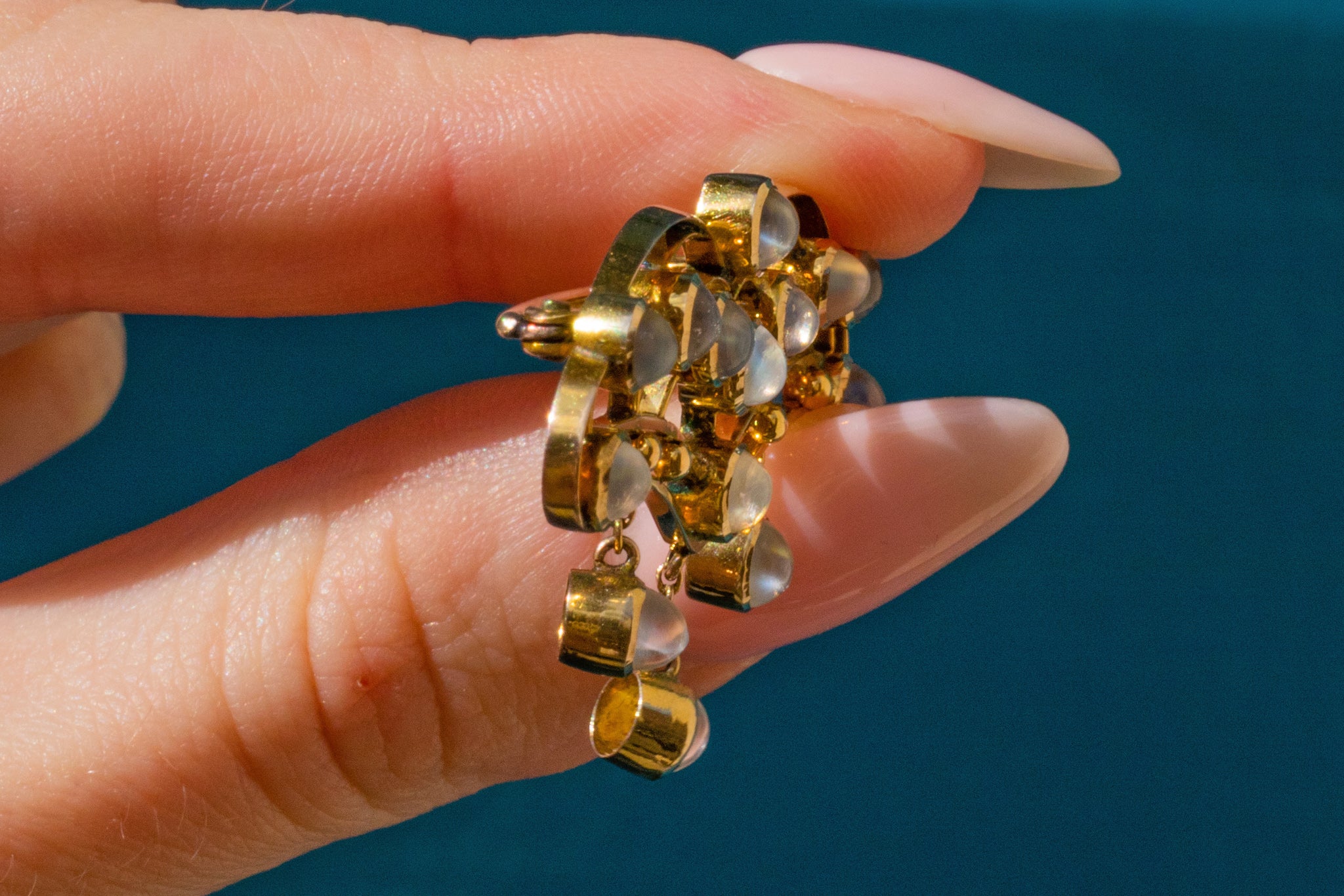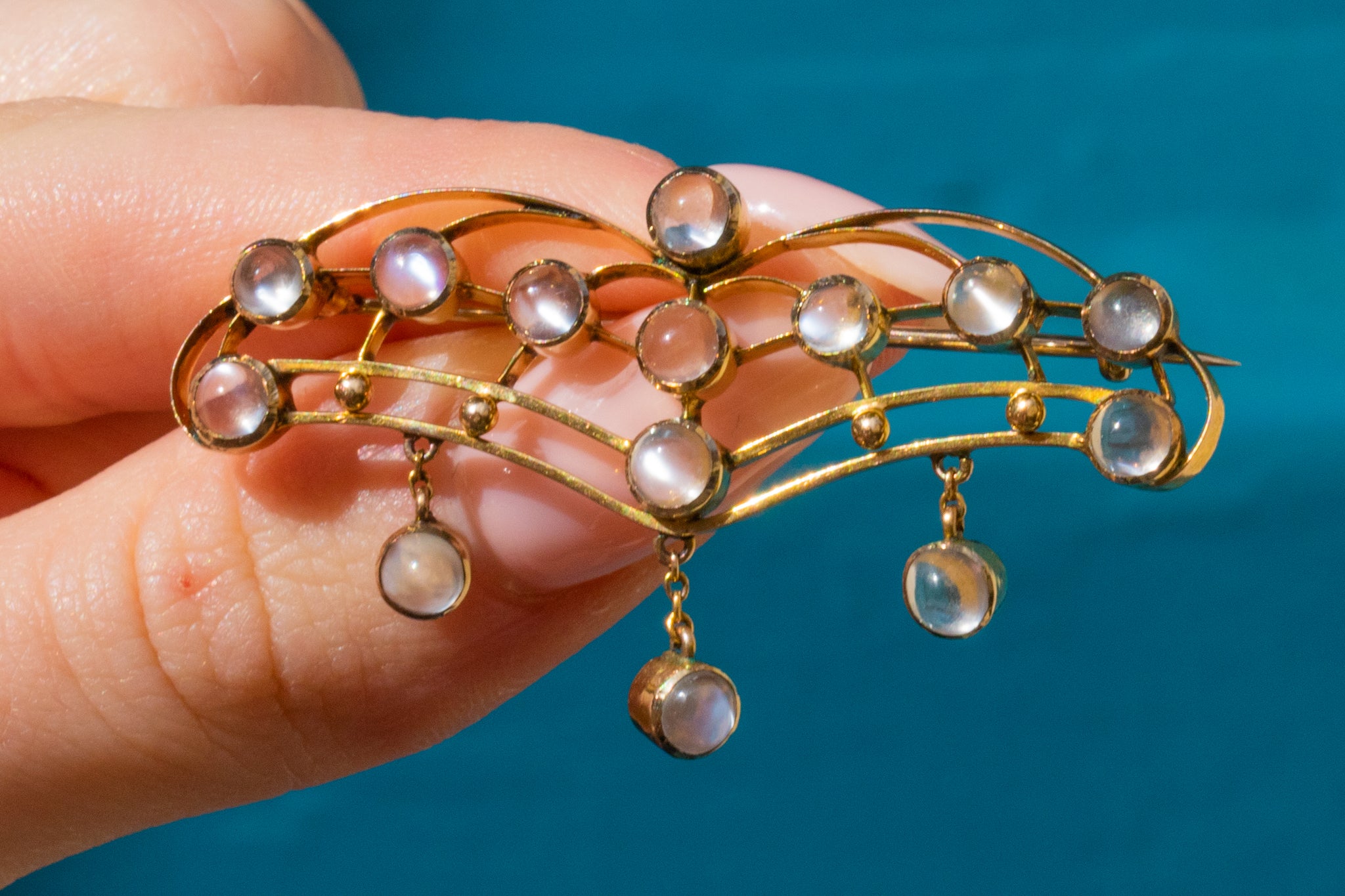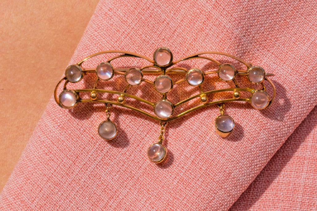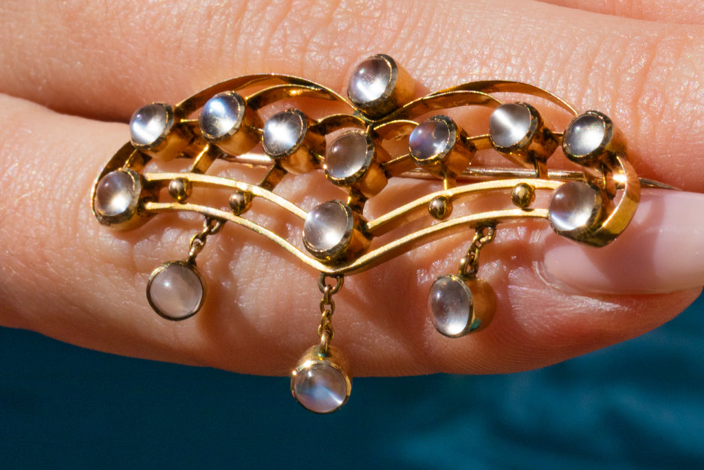This antique necklace has been crafted from a bright 9ct Gold and has a generous helping of gleaming Moonstones, with a combined weight of 2.80ct, creating an eye-catching and alluring piece that will set your style apart from the crowd!