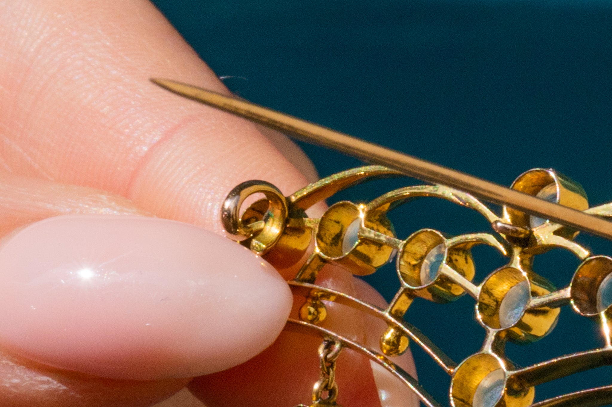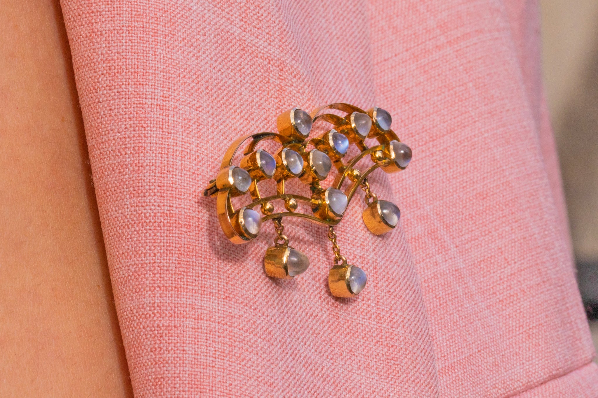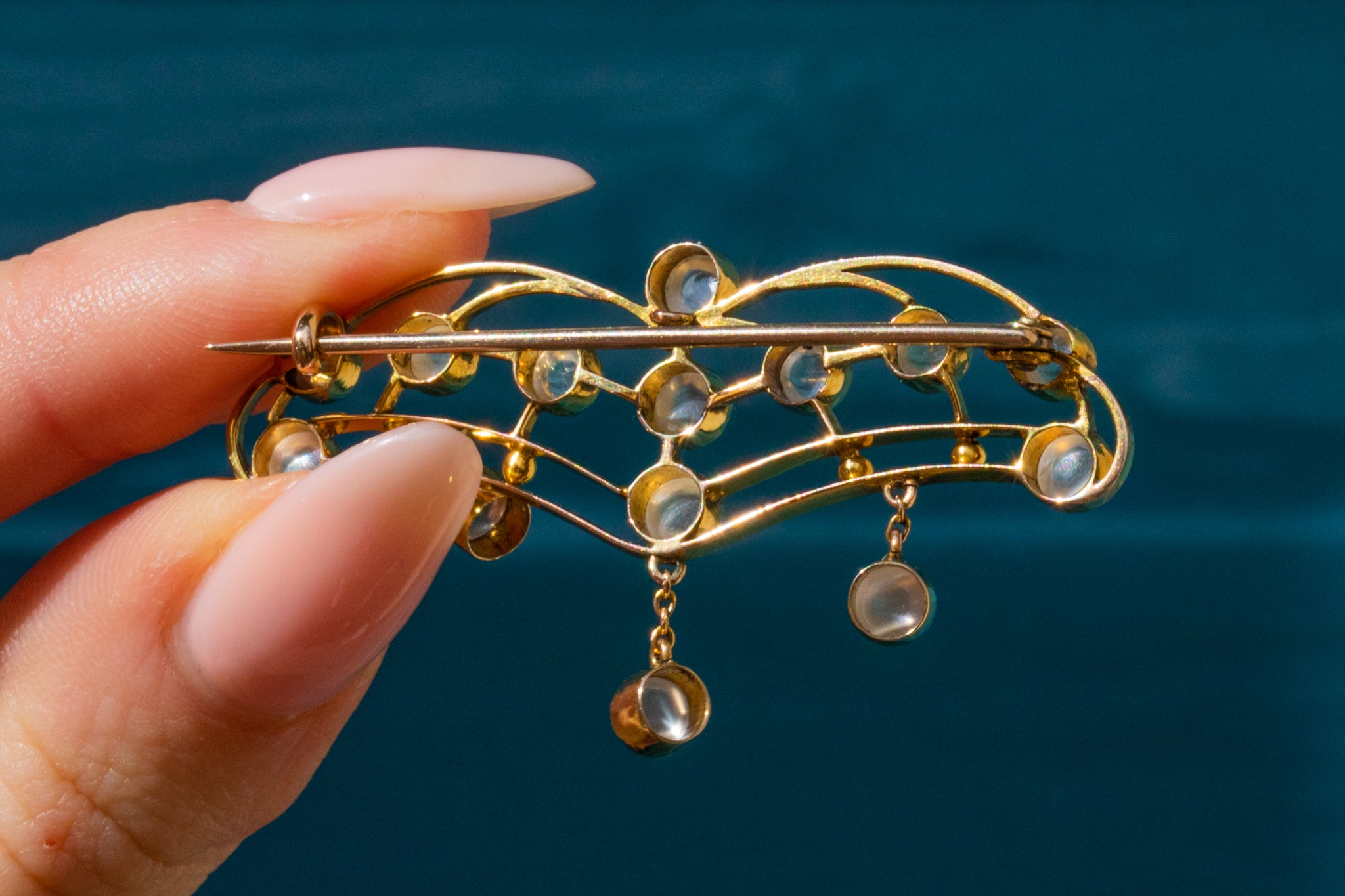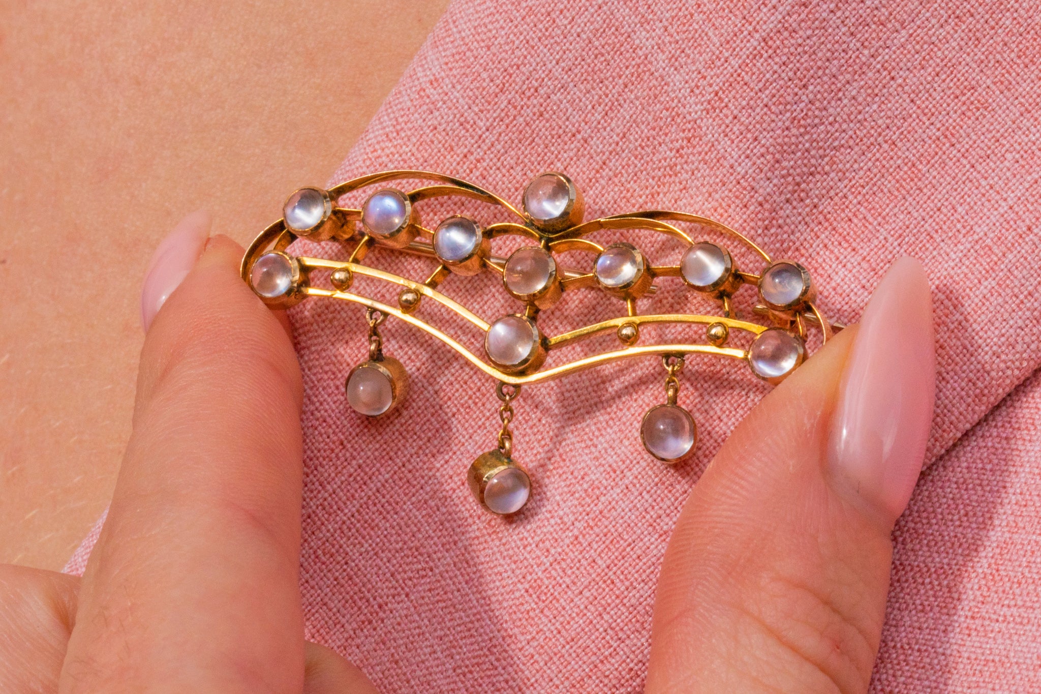 This antique necklace has been crafted from a bright 9ct Gold and has a generous helping of gleaming Moonstones, with a combined weight of 2.80ct, creating an eye-catching and alluring piece that will set your style apart from the crowd!