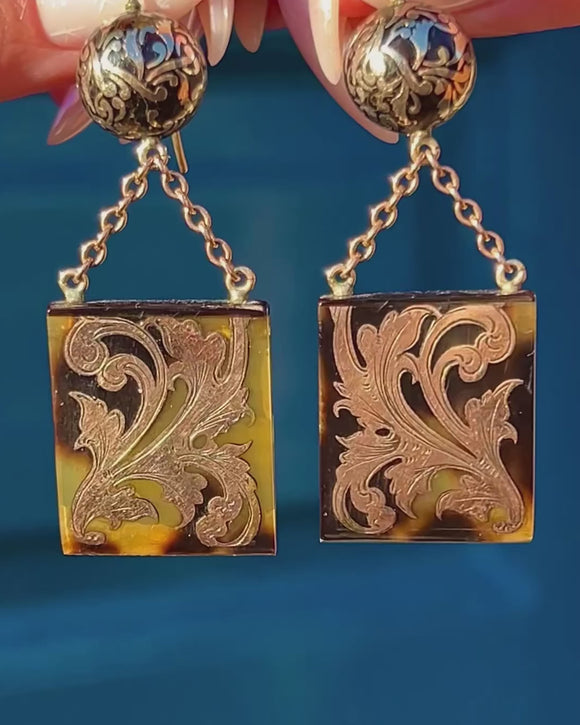 A striking pair of Art Nouveau Piqué drop earrings, alive with sinuous foliate scrolls in shimmering Gold set against a deep, glossy ground. Each earring is crowned by a decorated bead and finishes in an ornate rectangular panel, articulated by short twin chains for beautiful movement and drama on the ear.