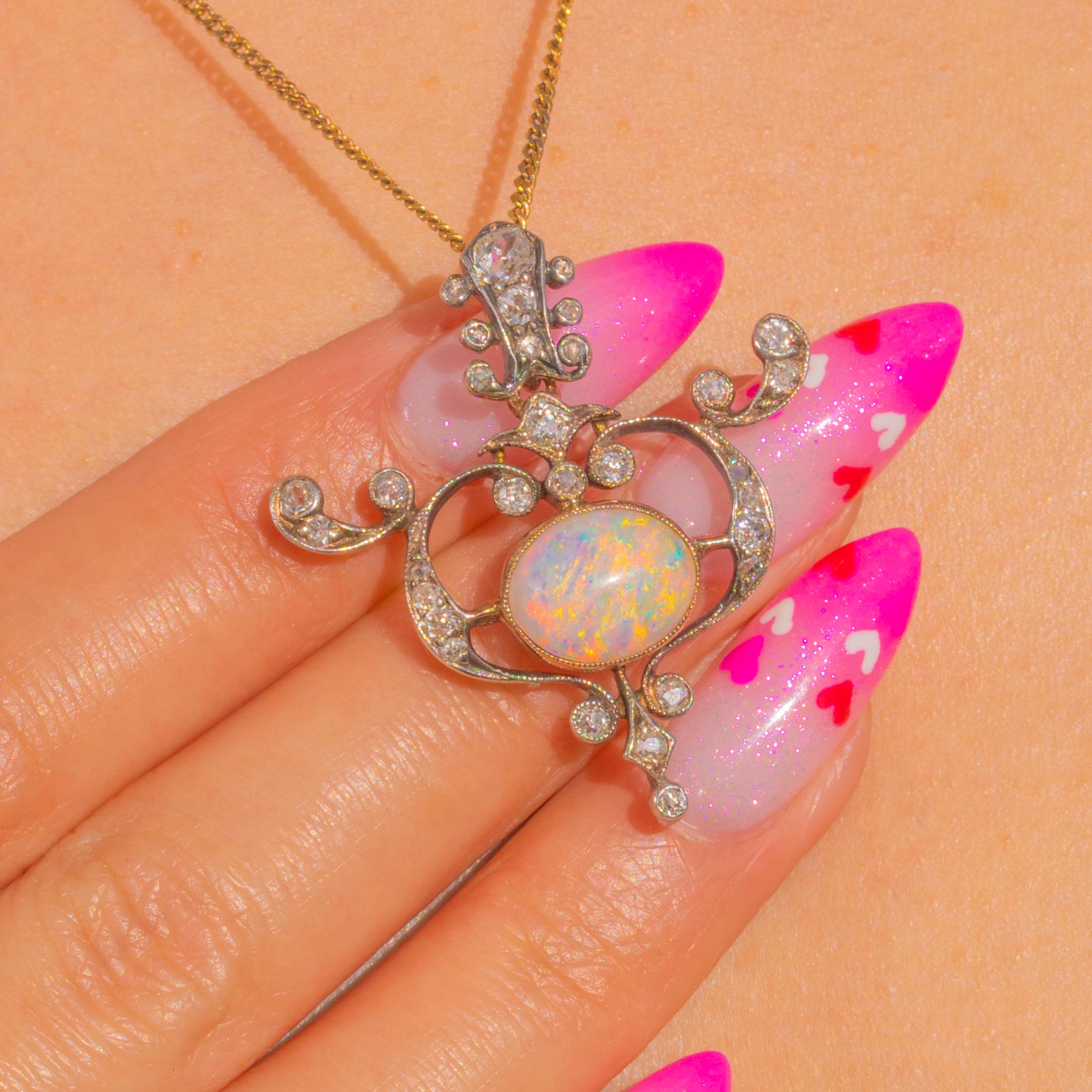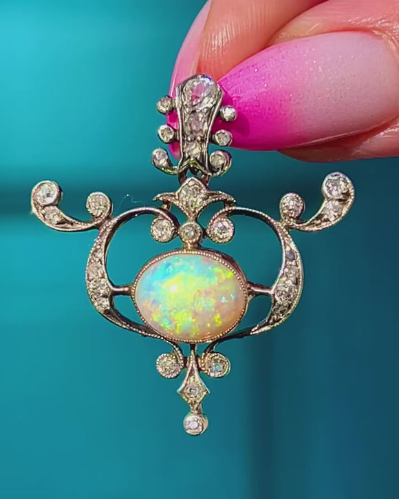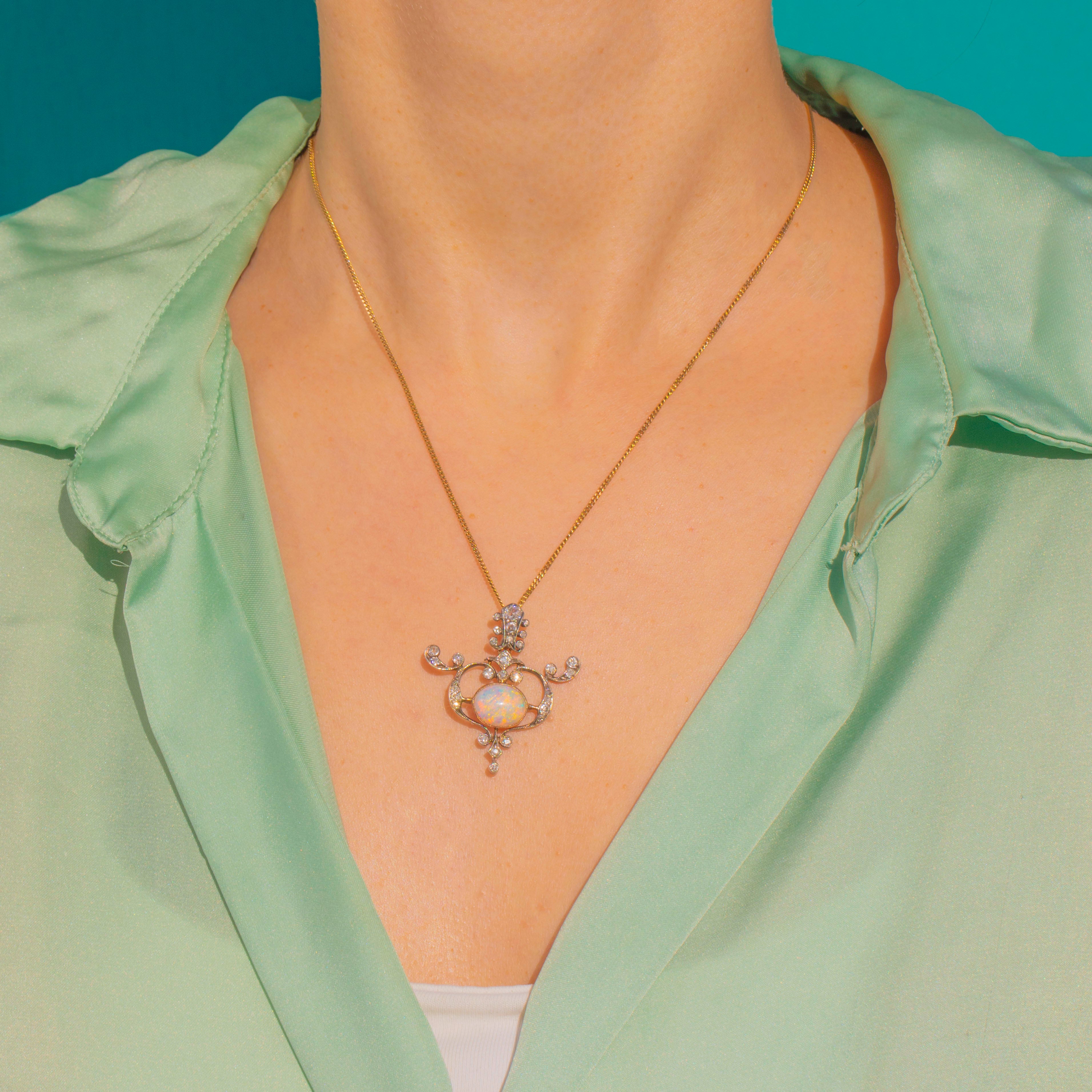 Graceful and romantic, this Art Nouveau pendant unfurls in scrolling openwork around a luminous Opal cabochon. The central oval Opal, approximately 1.60ct, shimmers with a vivid play-of-colour—flashes of blue, green, pink and orange that dance as the piece moves. A halo of dainty yet chubby old mine cut antique Diamonds sparkles from typical silver settings with delicate millegrain, the articulated foliate form bringing a whisper of movement to any chain.