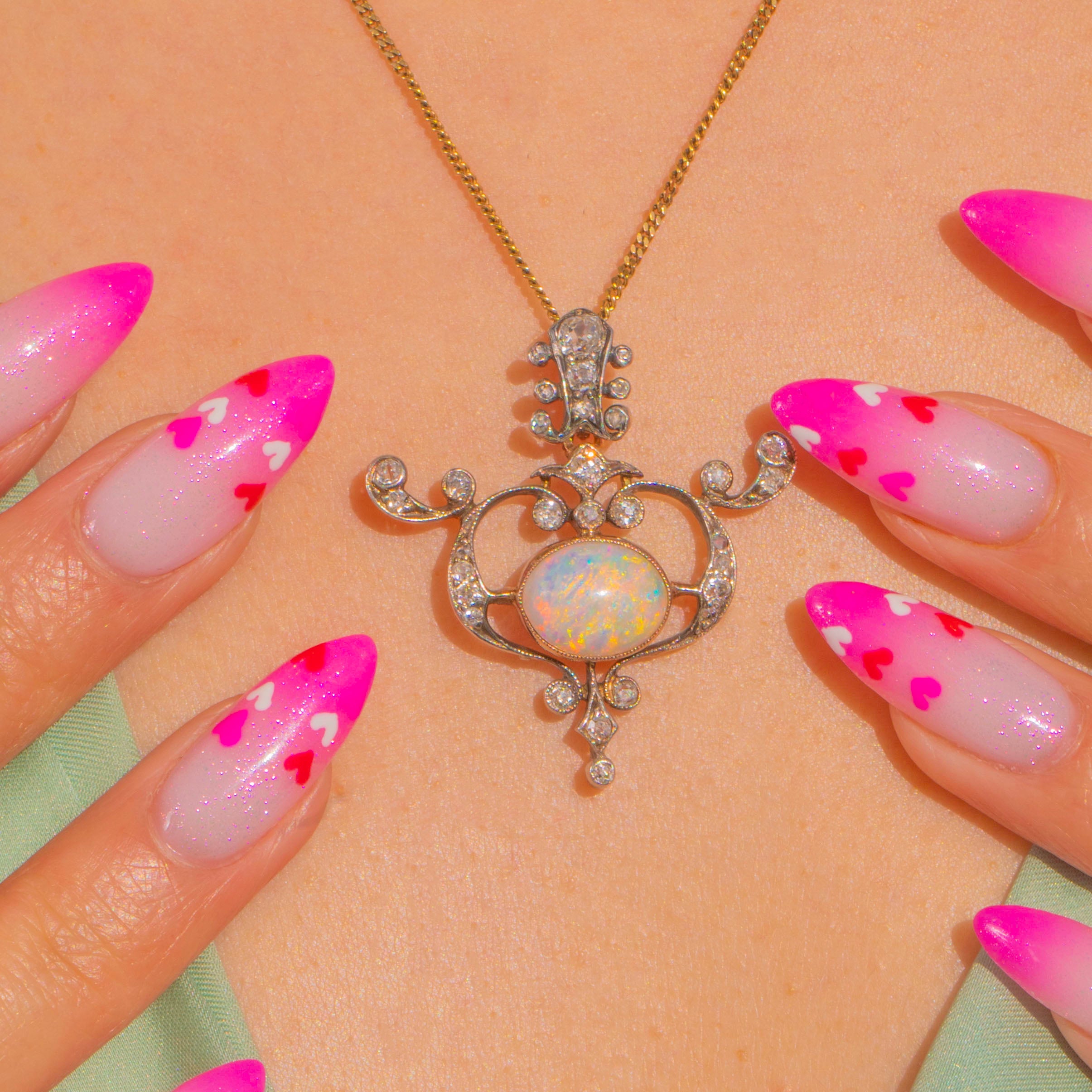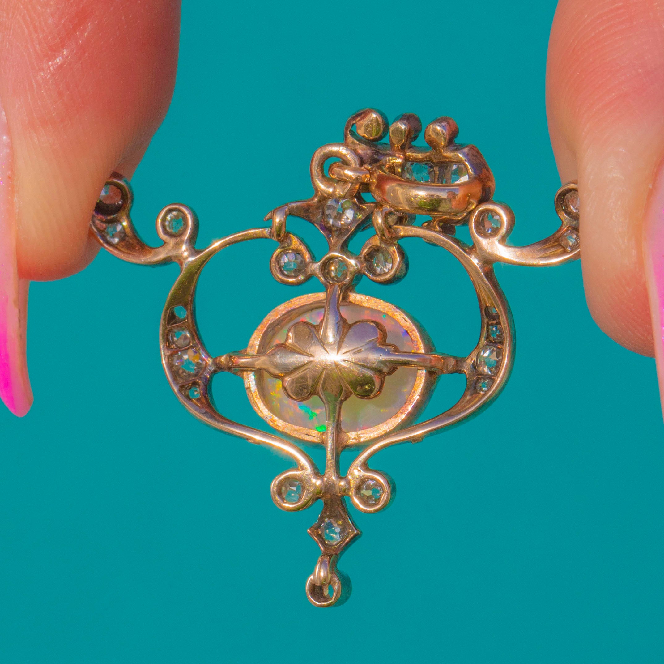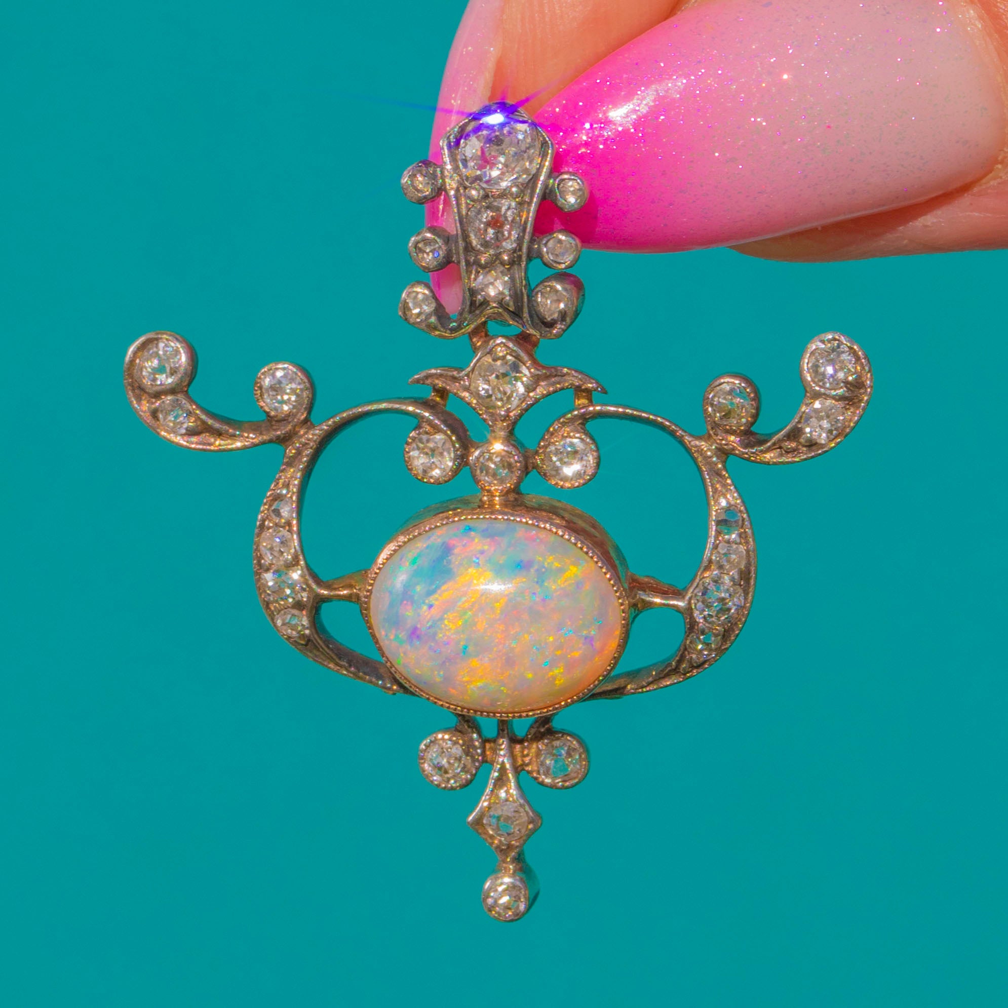 Graceful and romantic, this Art Nouveau pendant unfurls in scrolling openwork around a luminous Opal cabochon. The central oval Opal, approximately 1.60ct, shimmers with a vivid play-of-colour—flashes of blue, green, pink and orange that dance as the piece moves. A halo of dainty yet chubby old mine cut antique Diamonds sparkles from typical silver settings with delicate millegrain, the articulated foliate form bringing a whisper of movement to any chain.