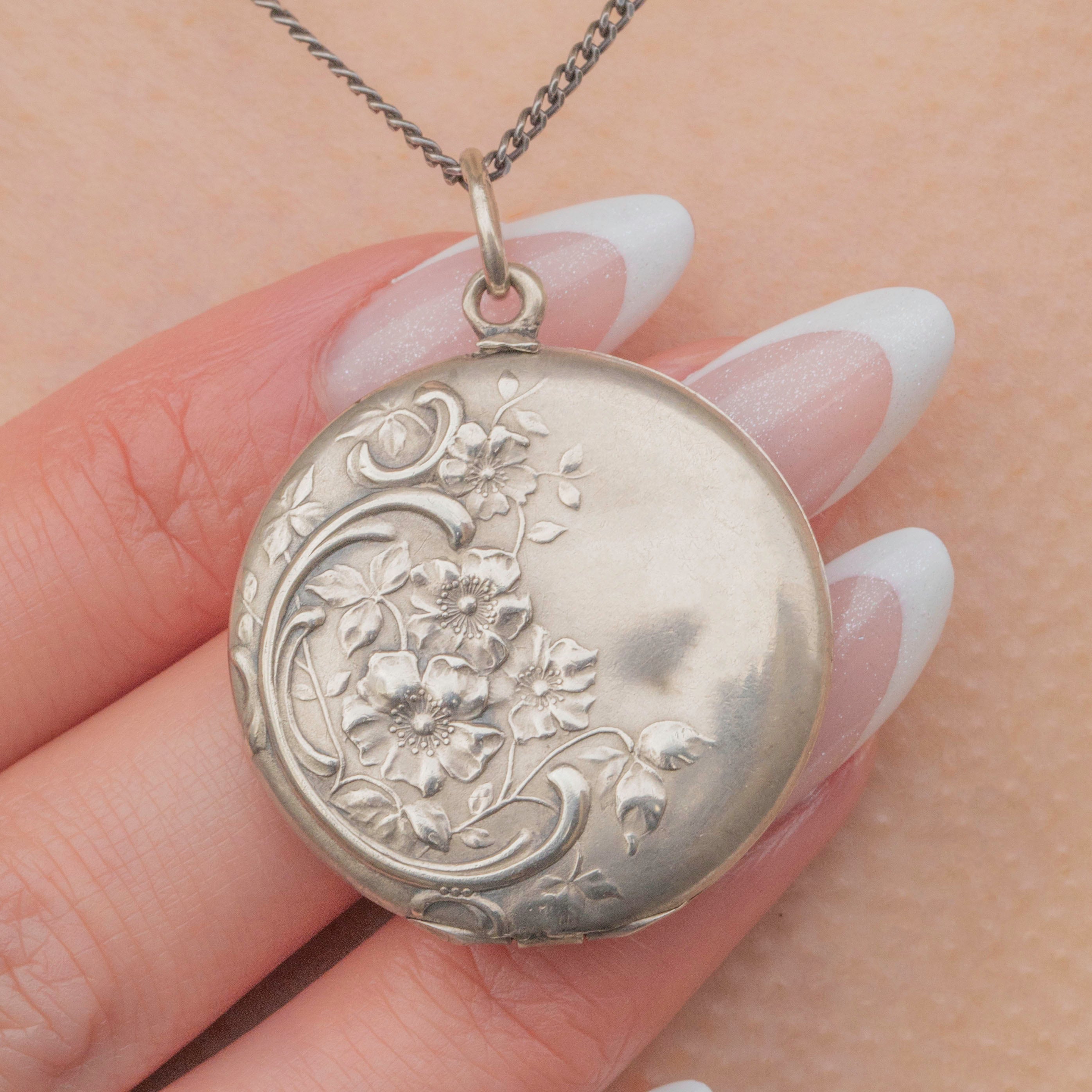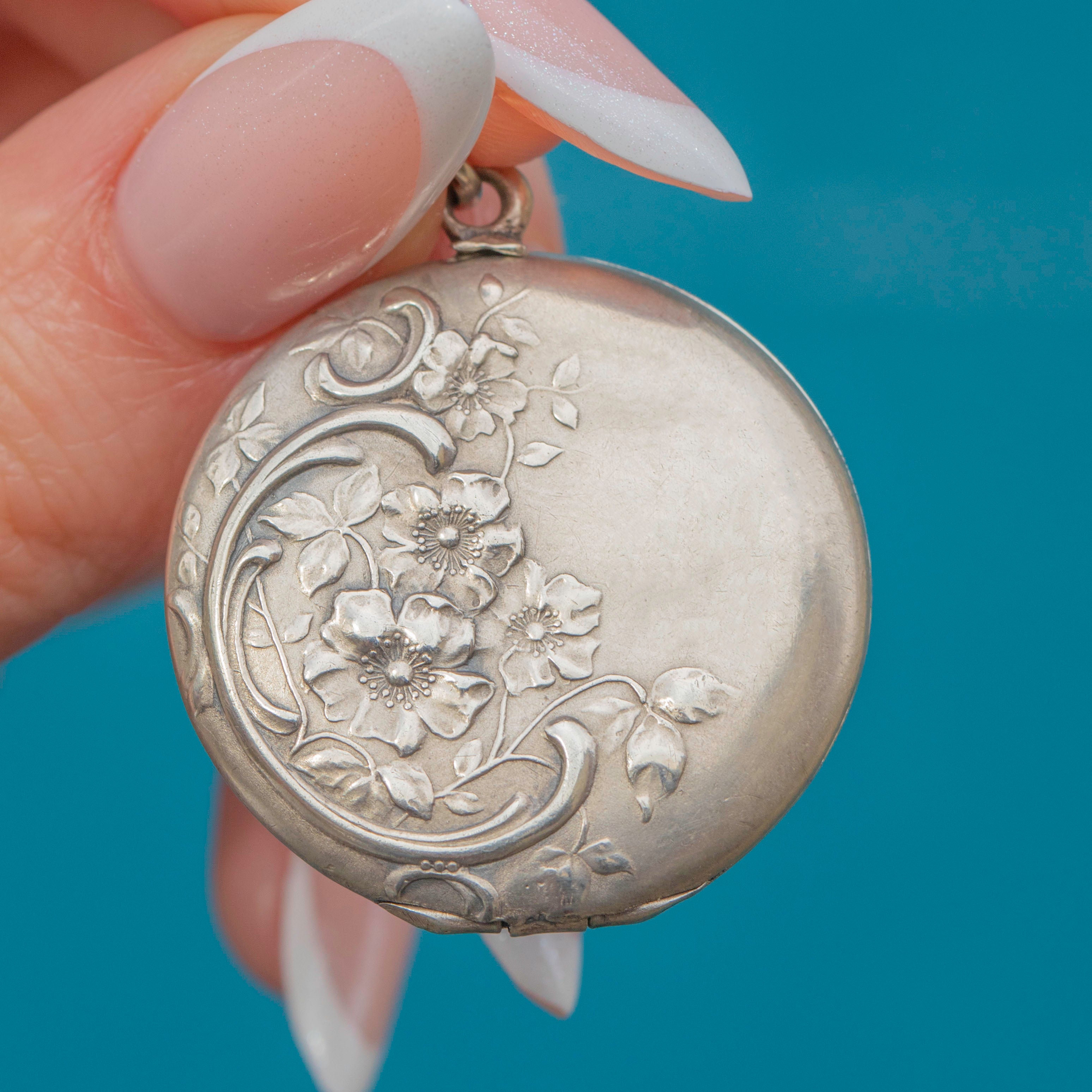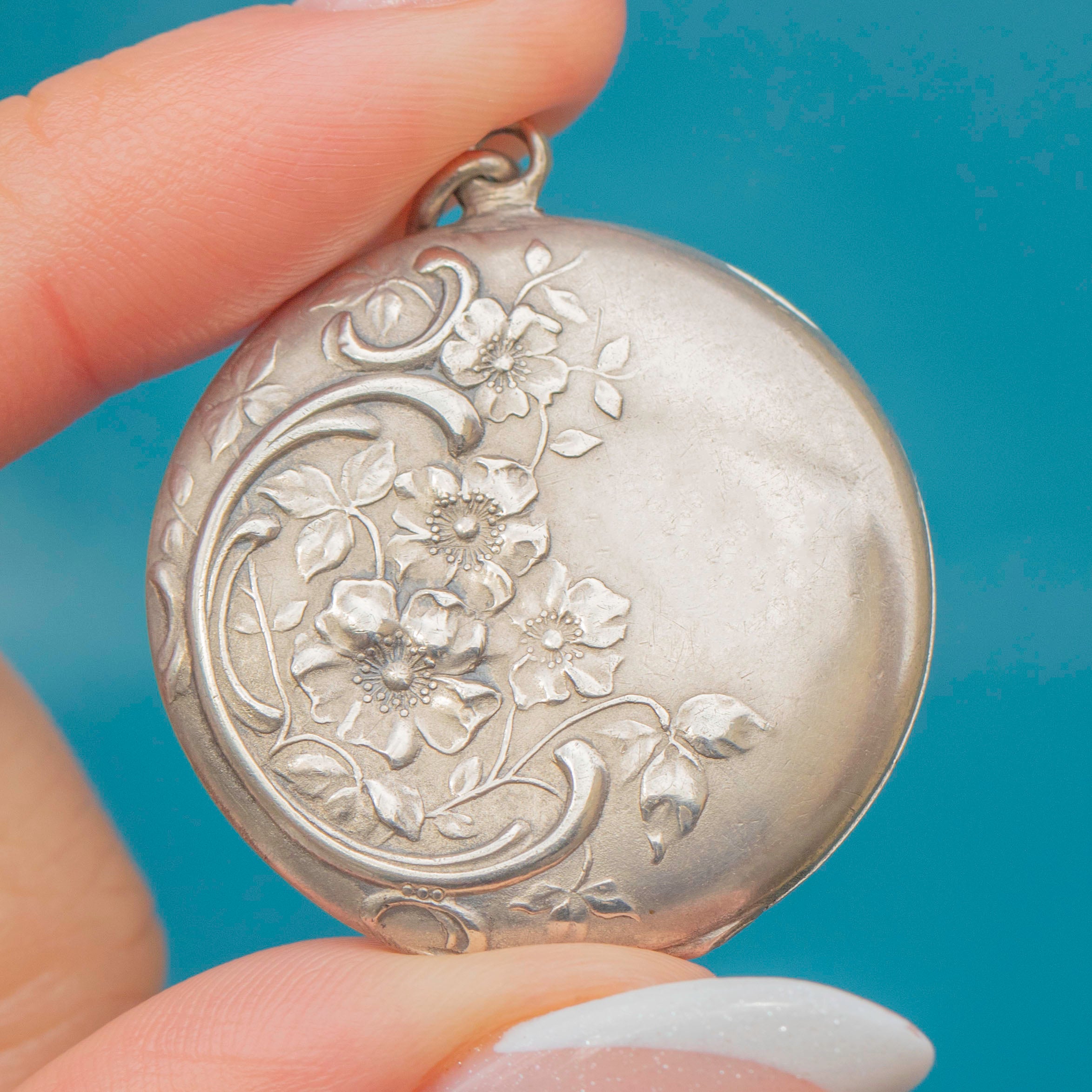 This Art Nouveau Silver floral locket is a botanic beauty with a whimsical floral design. Her 800 Silver exudes elegance and grace, enhanced by the sweet and intricate repoussé details.