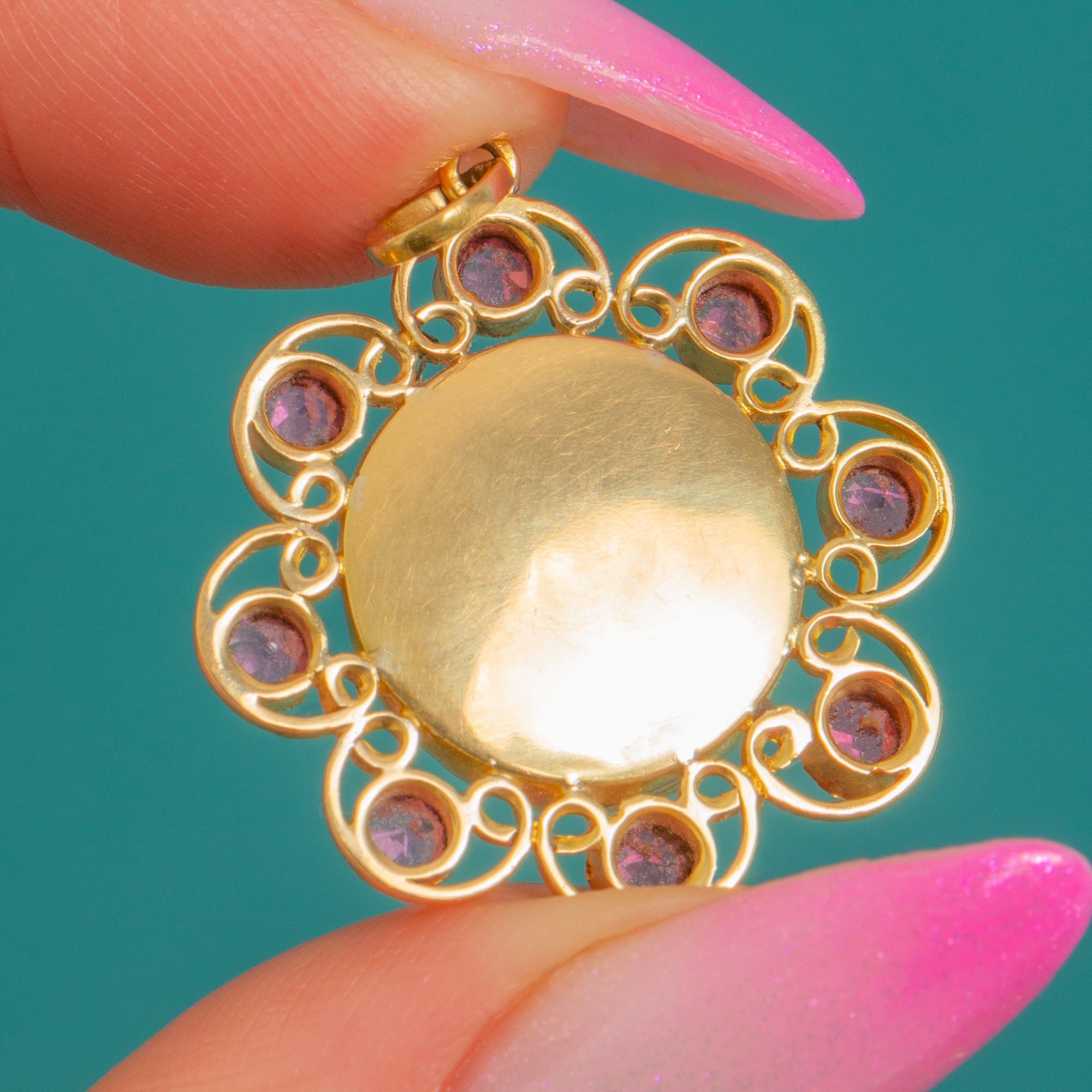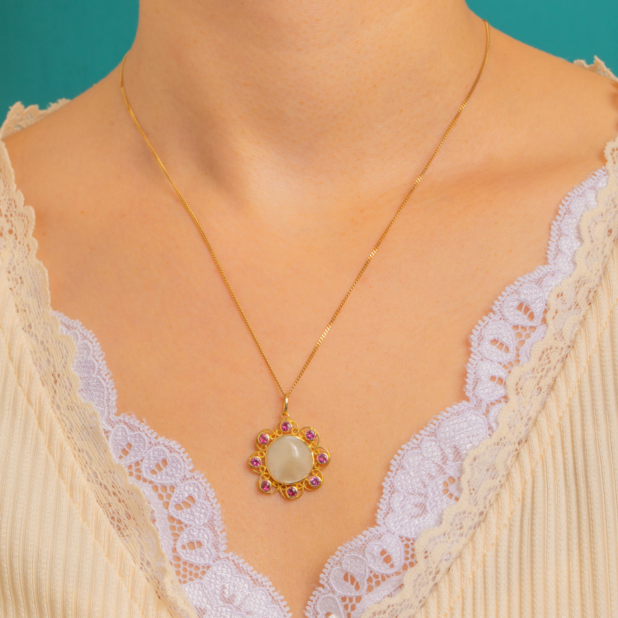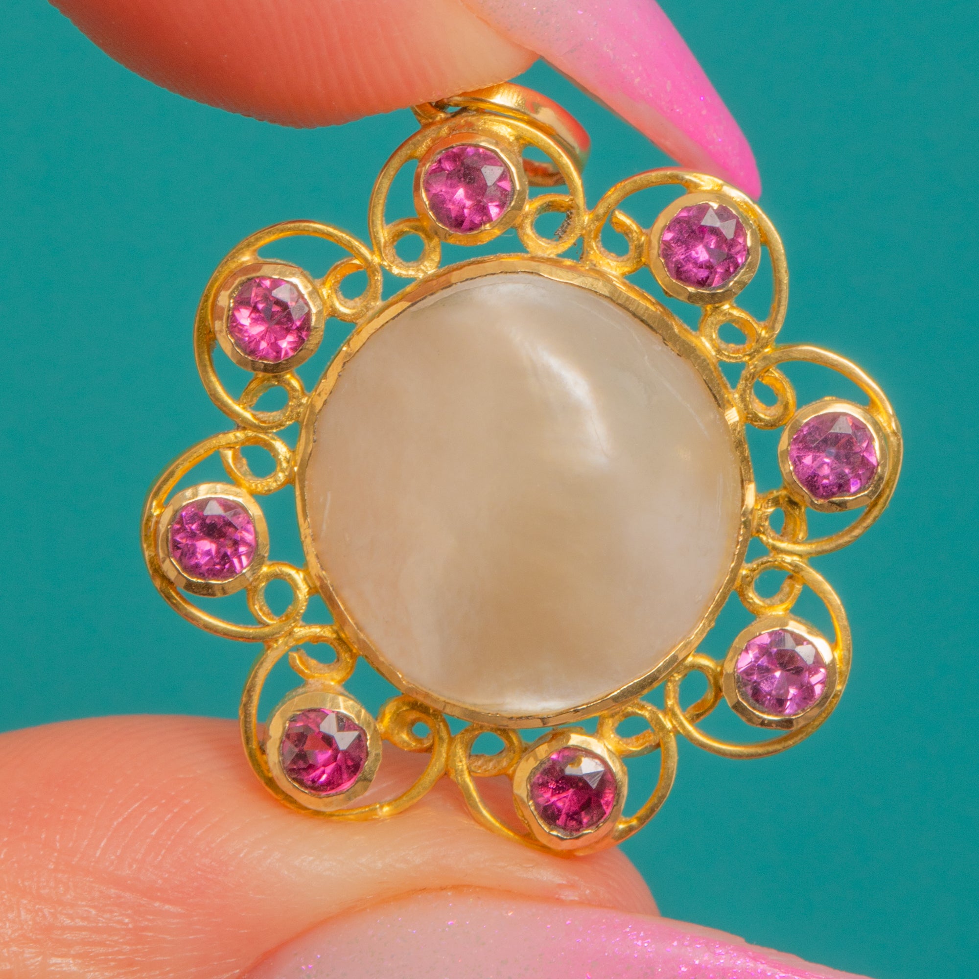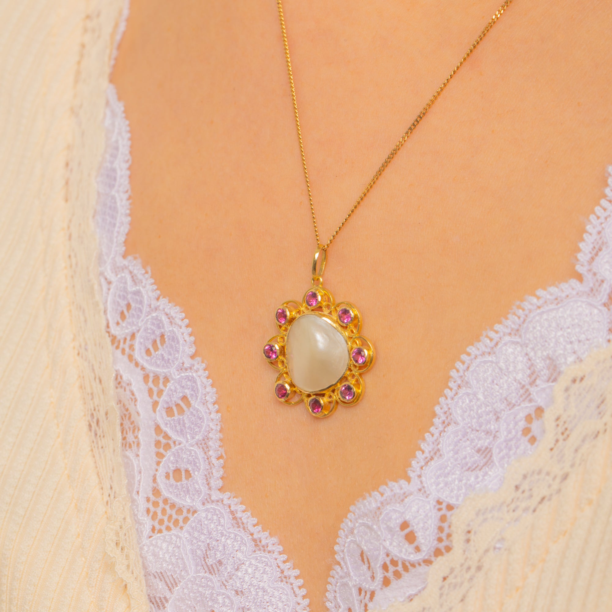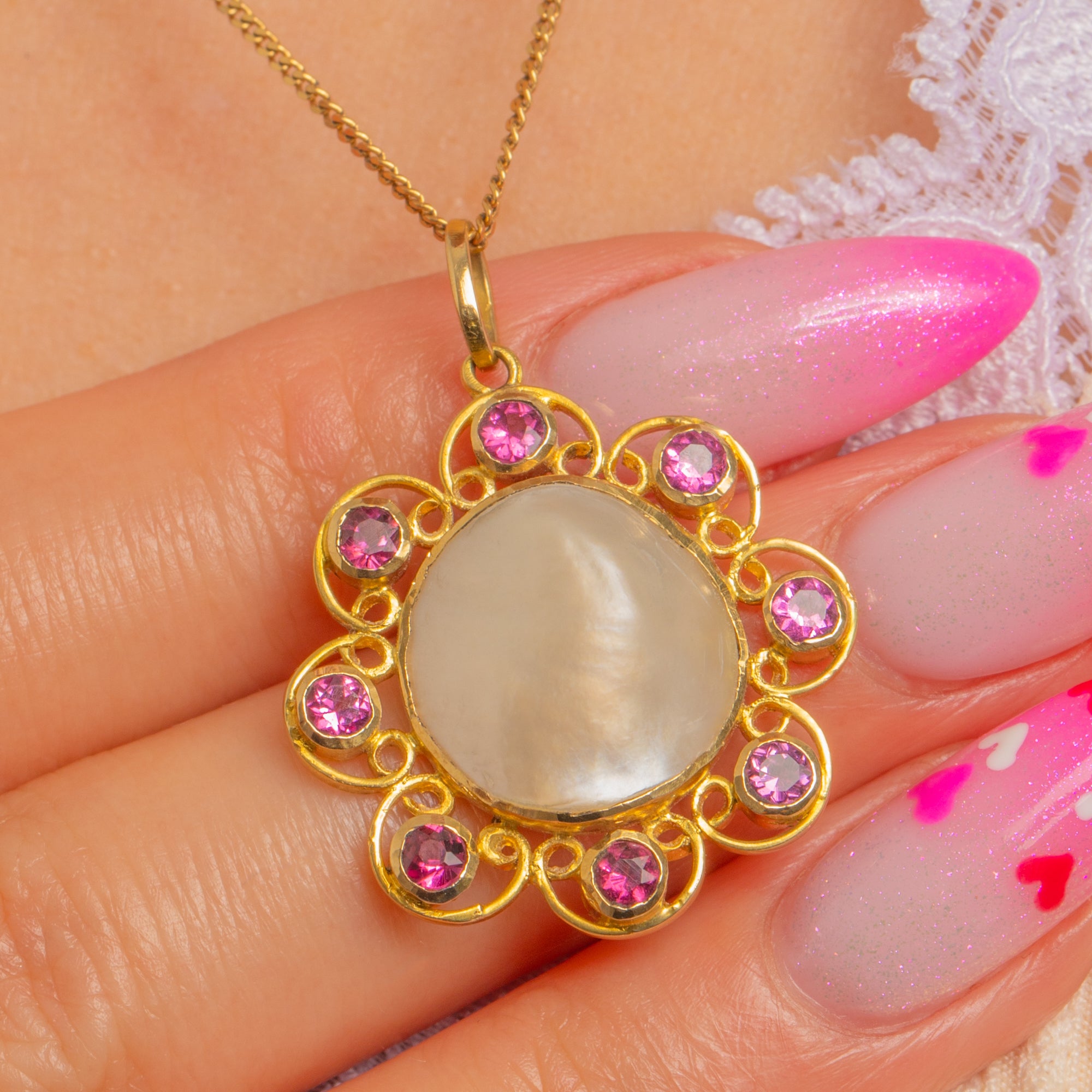 A romantic bloom in glowing 18ct Gold, this Arts and Crafts openwork flower pendant centres a silky domed Mother of Pearl cabochon, haloed by eight vivid Rubies. The scalloped, lace-like frame and smooth bezels create a soft, luminous play of colour—creamy iridescence at the heart, encircled by bright raspberry-pink sparks.